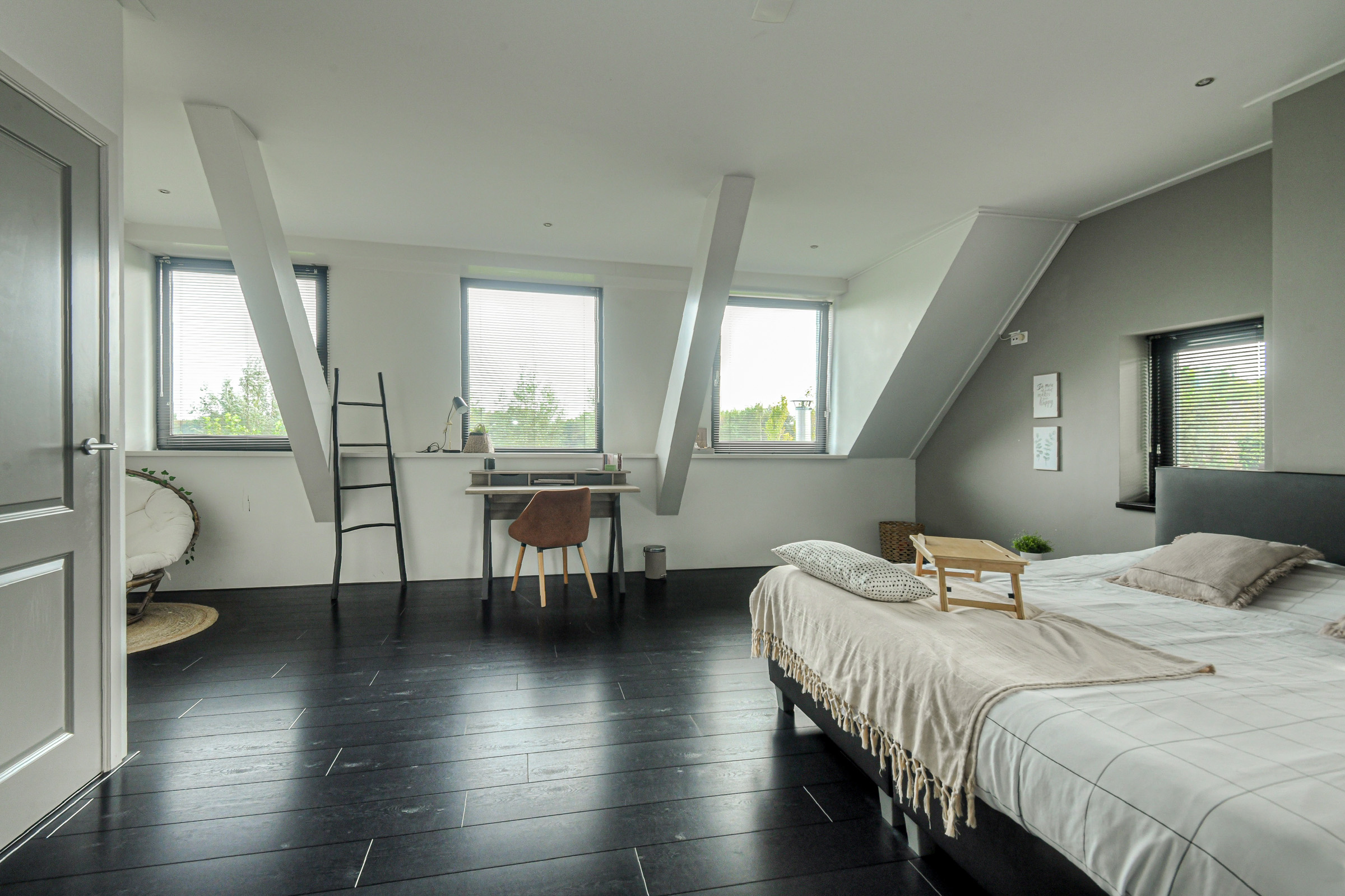 Master bedroom (approx. 4.55 x 3.00 m) with large wardrobe. This room also contains the meter cupboard (8 circuits + 3-phase power + earth leakage switch). The floor is fitted with stylish dark laminate.