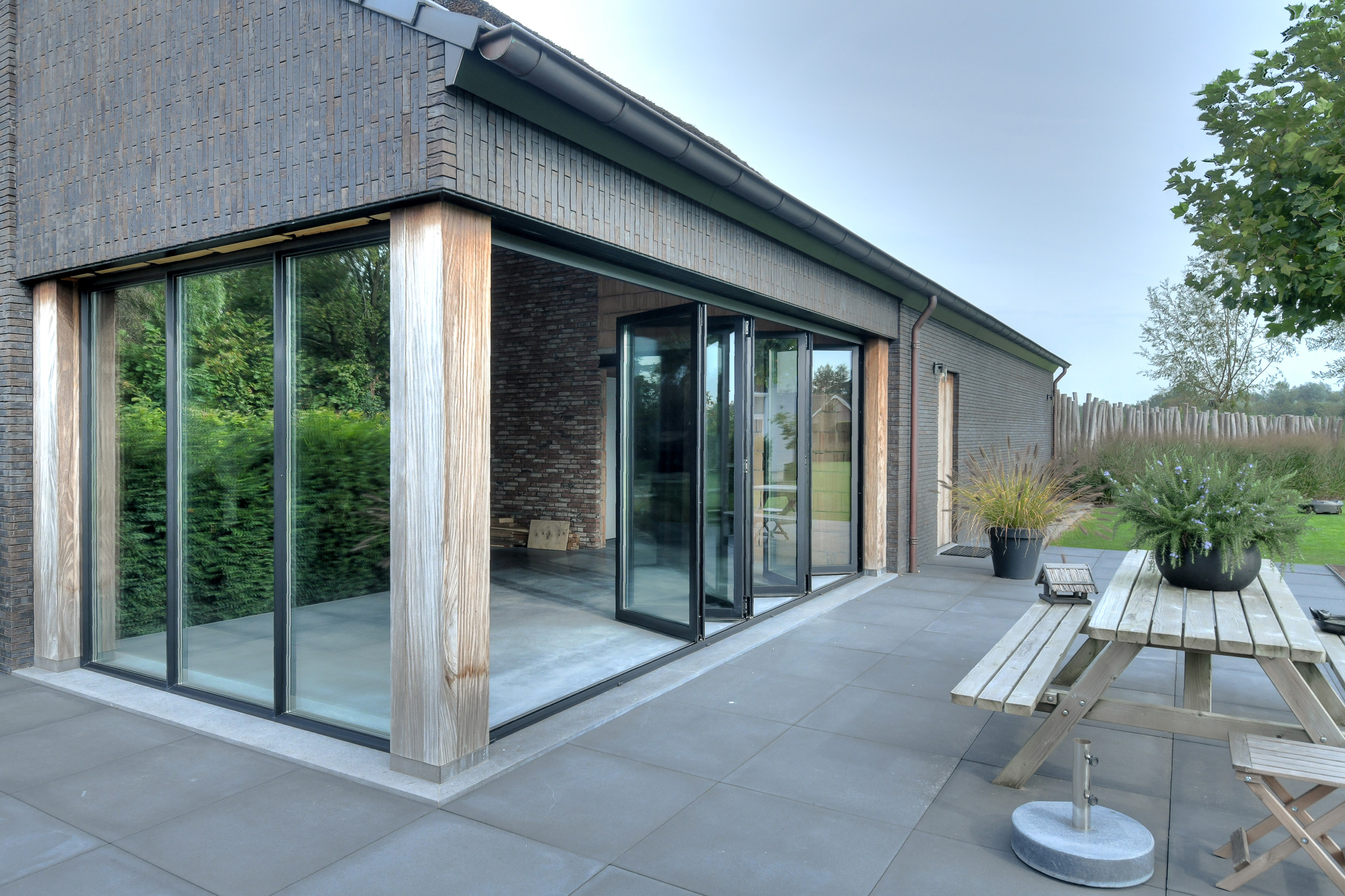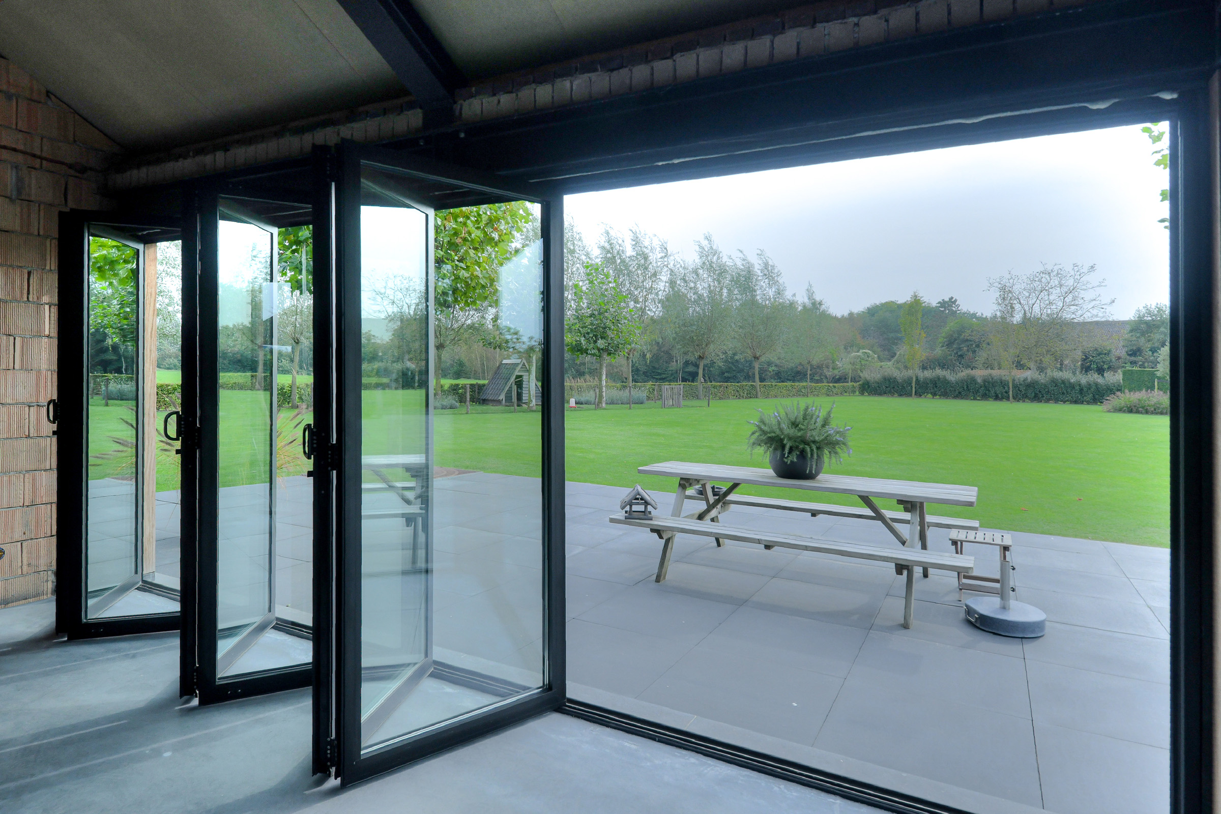 A fully openable glass folding wall creates a seamless connection to the garden.