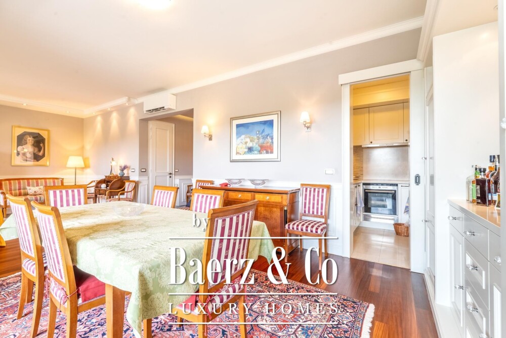 The lower level features two spacious bedrooms, both with walk-in closets and garden access, complemented by a further bathroom. Throughout, the apartment makes deliberate use of quality materials, new installations, and underfloor heating in bathrooms. The interior was renovated in 2019, with first-class parquet and considered finishes shaping every space.