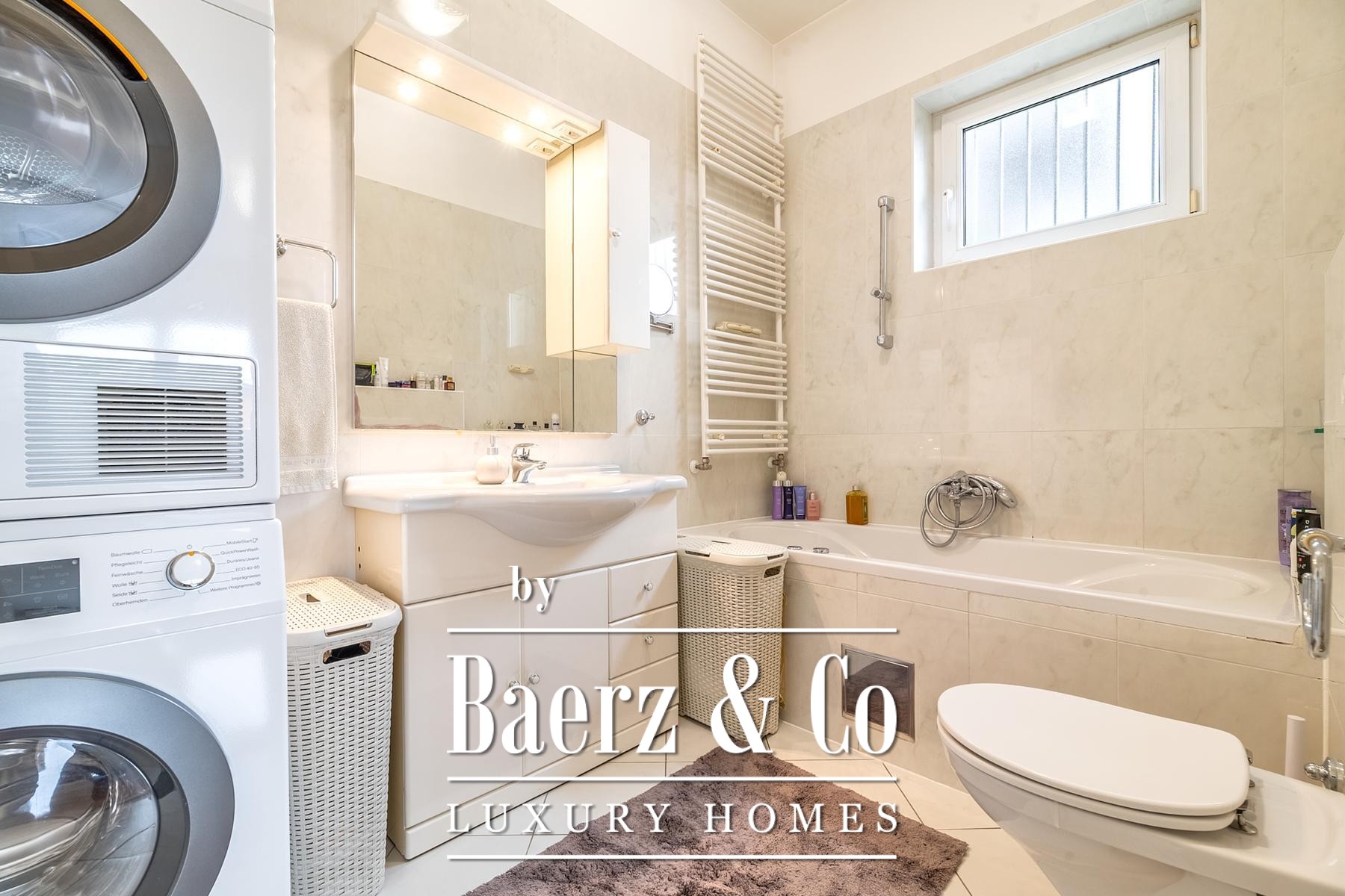 The apartment is sold fully furnished, featuring custom-made furniture and a NOLTE kitchen with integrated MIELE appliances. The layout balances sophistication and function, with a welcoming entrance, guest WC, two bedrooms, a master suite with en-suite bathroom, and an additional well-appointed bathroom. The heart of the home is an expansive open-plan living and dining space flowing seamlessly onto a 30 m² terrace, inviting in natural light and open views. Adjacent, a private 50 m² garden offers rare outdoor space within the city.