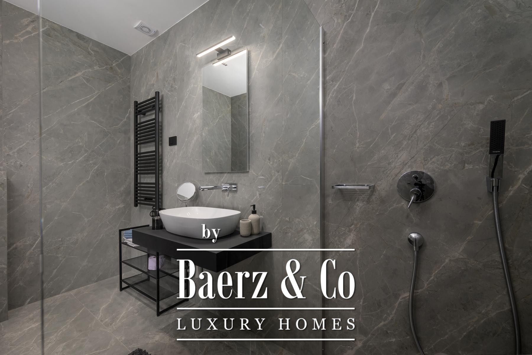 A marble staircase leads to the private upper level where three bedroom suites, each with Hespo program 5* comfort and private terrace, invite mornings overlooking nature. Every bathroom features Hans Grohe and Axor fixtures and custom finishes. Throughout, details by Guzzini, Artemide, and Florim Bologna affirm the villa’s design pedigree.
