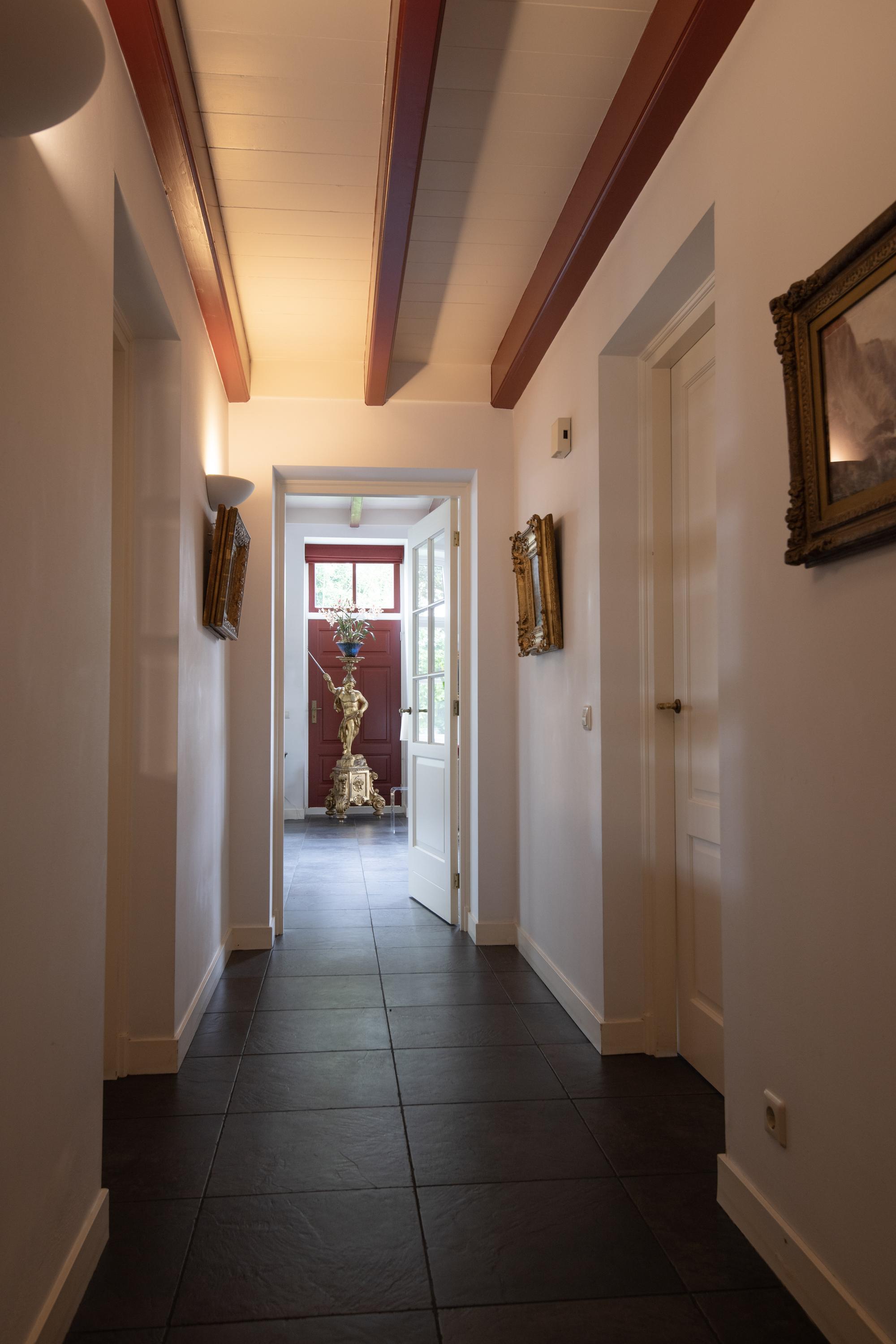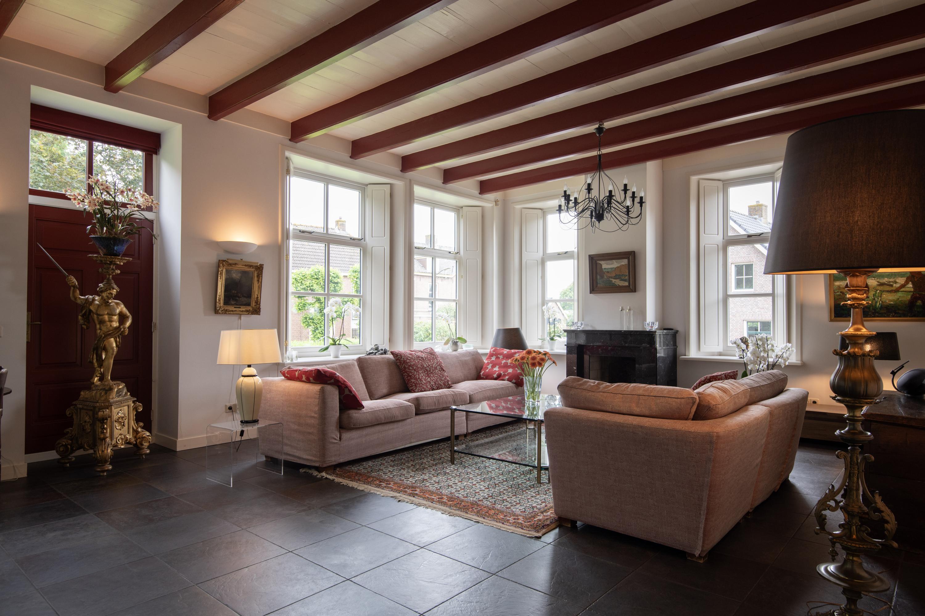 The original front door is located centrally in the front house but it is no longer used. The daily entrance is on the driveway side. The entrance is spacious and furnished with closets and a toilet. From the adjacent hallway is access to the living room. This sunny room with many skirted windows, flanked by interior shutters, breathes -with the almost three-meter high beamed ceiling- a pleasant atmosphere. In addition to the luxurious ceramic floor with underfloor heating, there is a natural stone fireplace with an open gas fire. In the living room are two passages that offer a view of the adjacent dining kitchen. This space offers access to the south-facing terrace through double French doors. Three mature Plane trees act as natural umbrellas there in the summer.