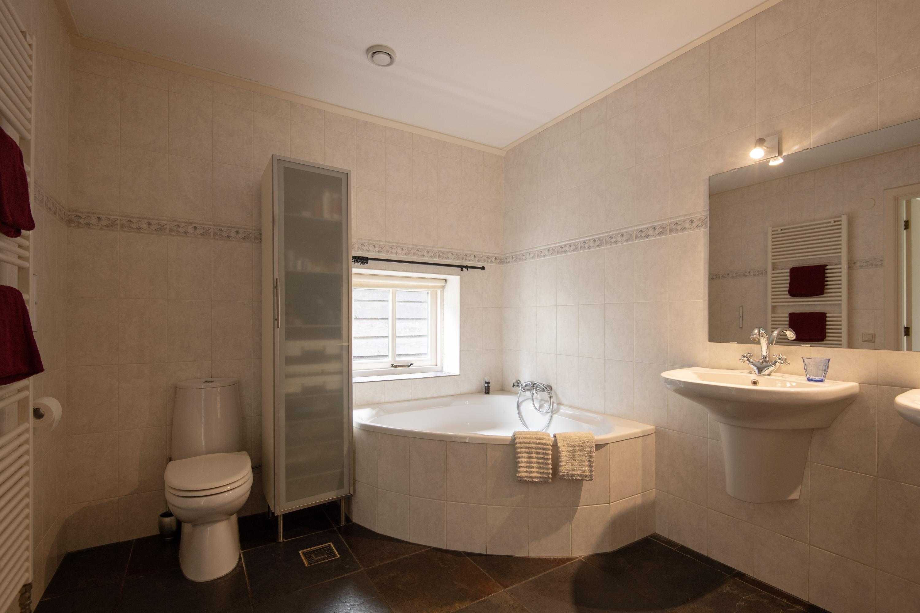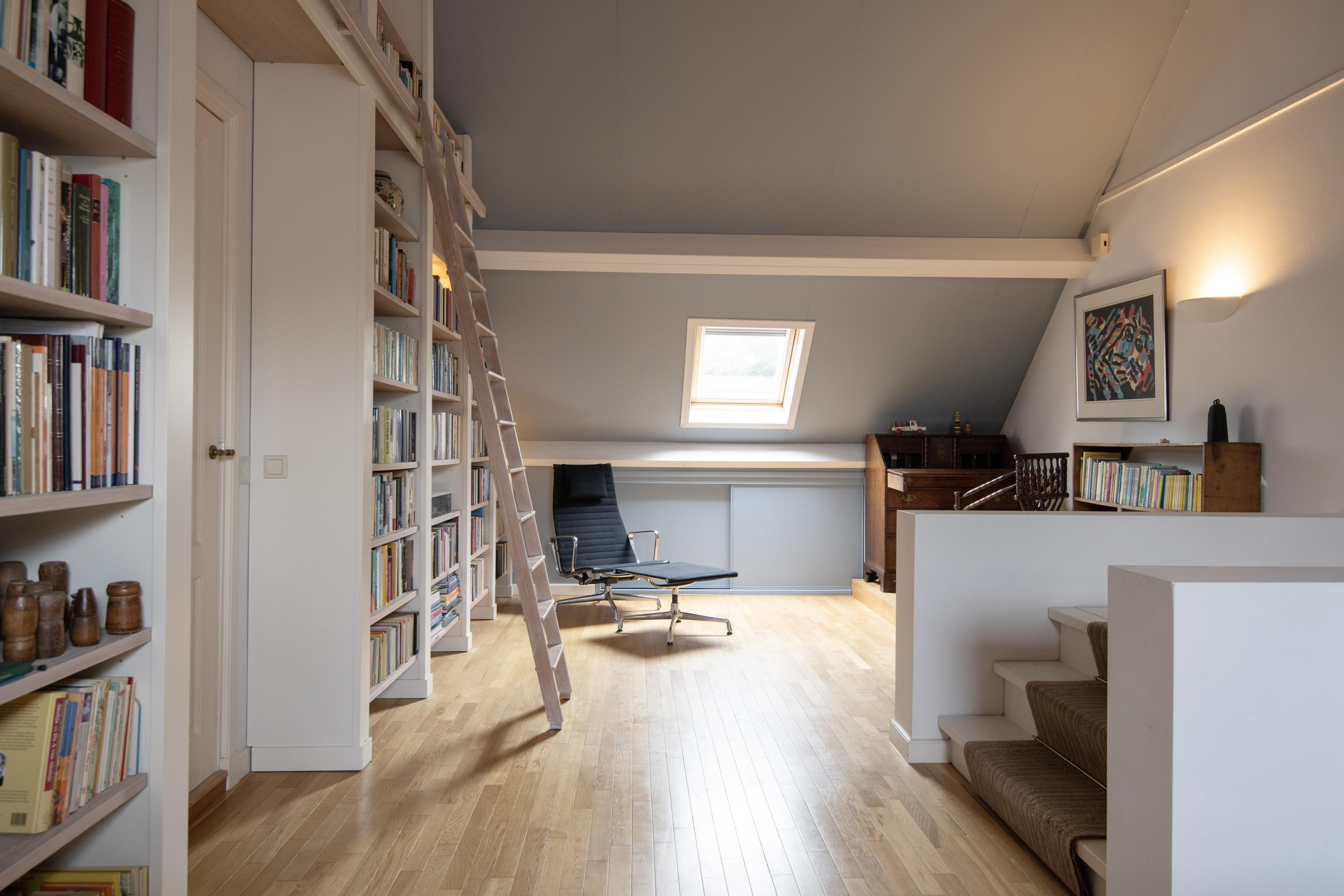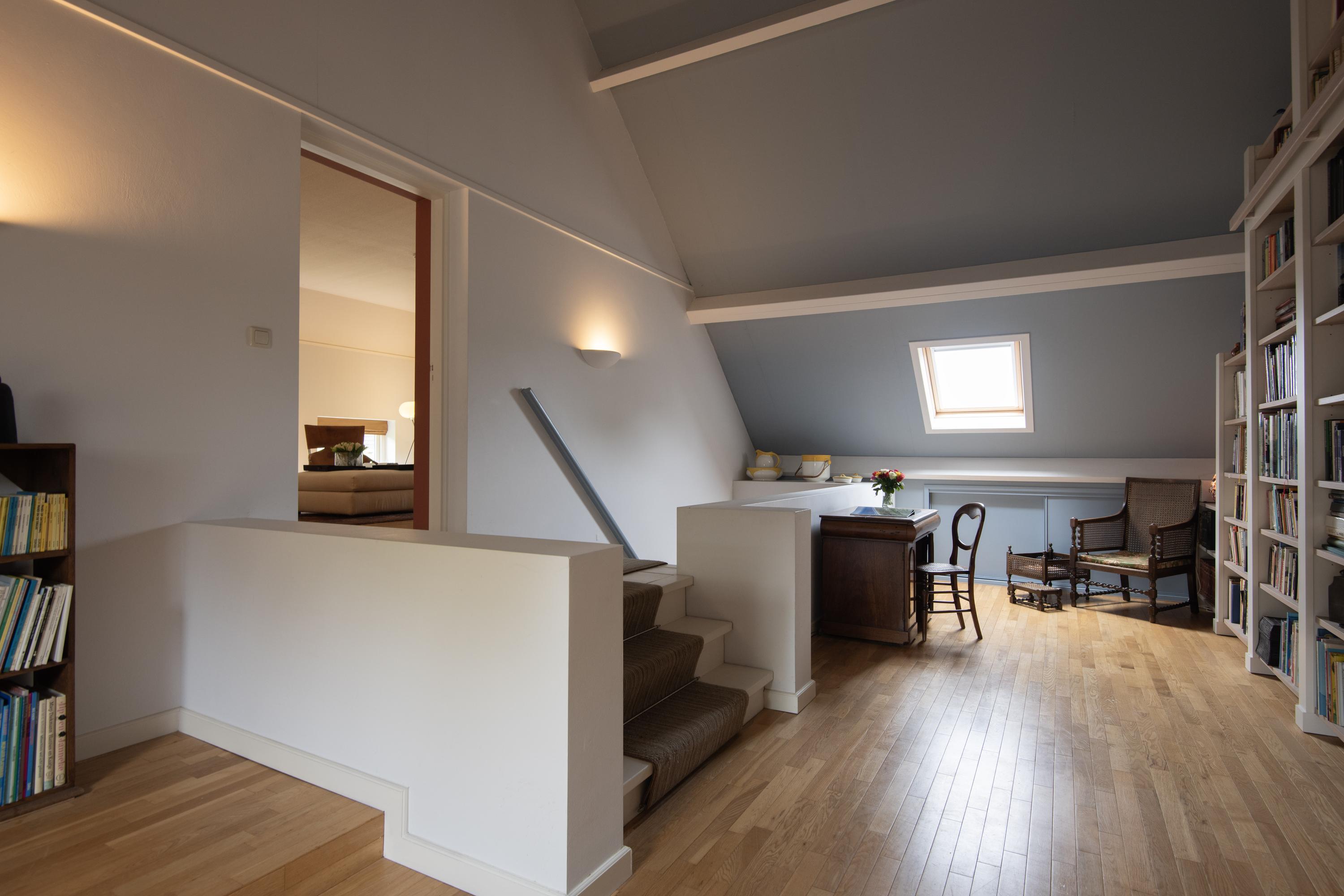 From the central corridor in the back house a staircase leads to the first floor. Under the insulated roof are two more beautiful bedrooms. Through three skylights there is a view of the garden and surroundings. Both rooms are wonderfully bright and have plenty of storage space.