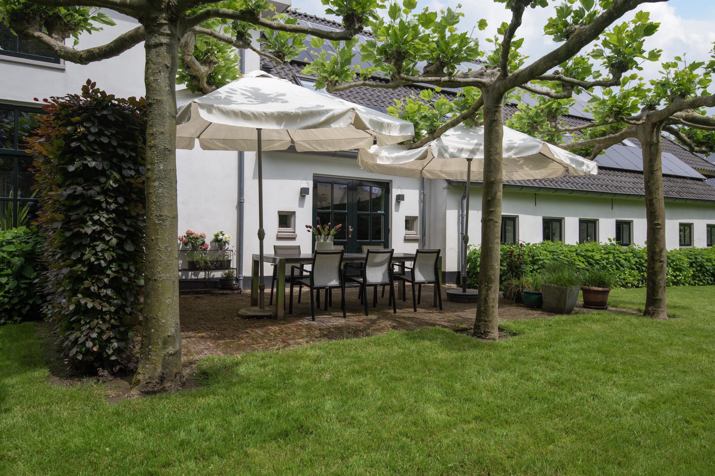 The low maintenance garden is landscaped with large terraces on the south and east, a large lawn with mature (fruit) trees, hedges and flowering ground cover.