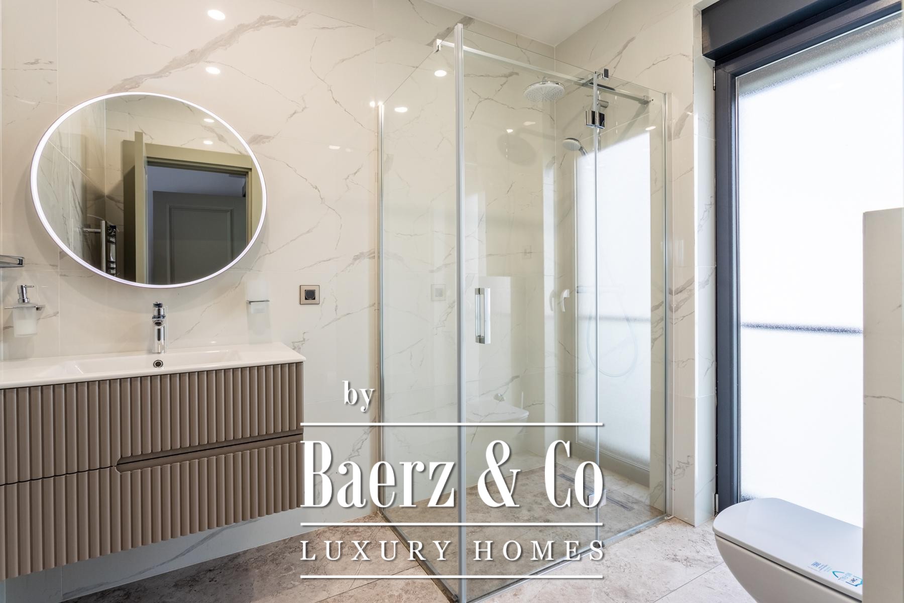 The ground floor flows seamlessly between a luminous living and dining space, a fully equipped kitchen, and direct passage to the terrace and garden. To the north, functional spaces—laundry, storage, guest toilet, and sauna—are discreetly arranged to balance convenience with calm. Four suites, each with its own bath and terrace access, occupy the first floor, drawing in morning sea light through expansive glazing.