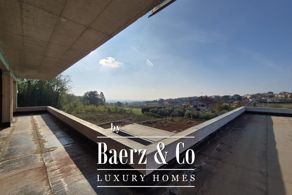 Townhouse Kaštelir-Labinci is a distinctive contemporary residence set on the western edge of the Istrian peninsula in Croatia. This modern villa offers a living area of 600 m² and rests on a 1,420 m² plot, seamlessly integrating panoramic sea views with the village’s scenic backdrop of vineyards and olive groves.