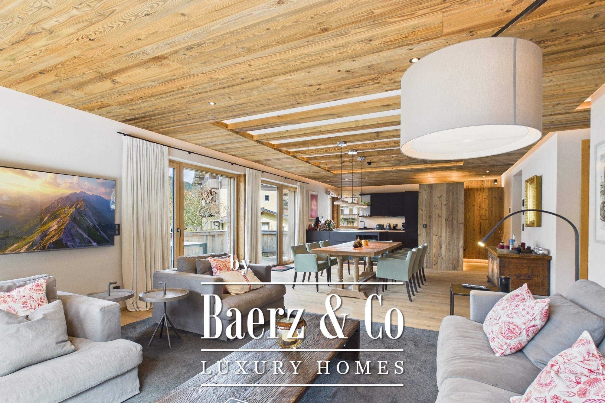 Apartment Kirchberg in Tirol offers a refined living experience at the end of a quiet cul-de-sac, set slightly elevated with close proximity to ski slopes and the town center. Encompassing a generous 135 m² of living area, this residence is distinguished by three rooms each with en-suite bathrooms, two configured as bedrooms, and a large wellness room complete with sauna. An open-plan living, dining, and kitchen area becomes the social heart of the home, featuring reclaimed wood ceilings and a custom-built kitchen fitted with Miele appliances.