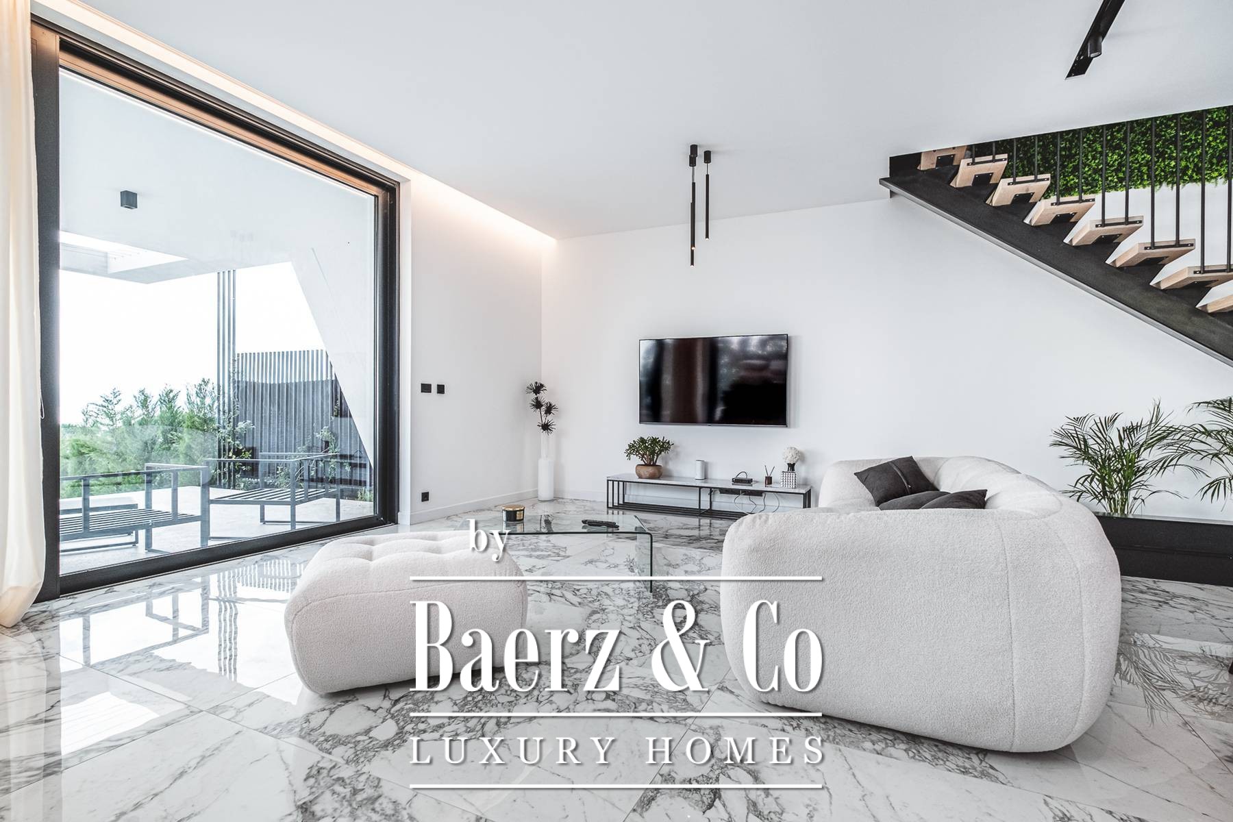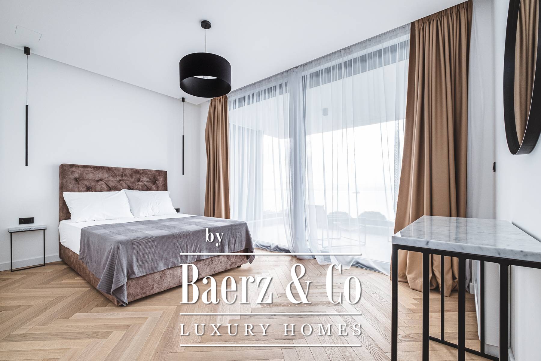 Upstairs, four bedrooms echo a quiet sense of modernity, led by a master suite with dedicated dressing area, an expansive bathroom, and a private terrace facing the blue expanse of the Adriatic. Balconies and exterior access points evoke a continuous connection with the horizon. Four bathrooms serve the home, employing contemporary fittings and materials throughout.