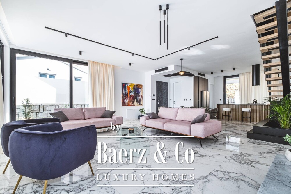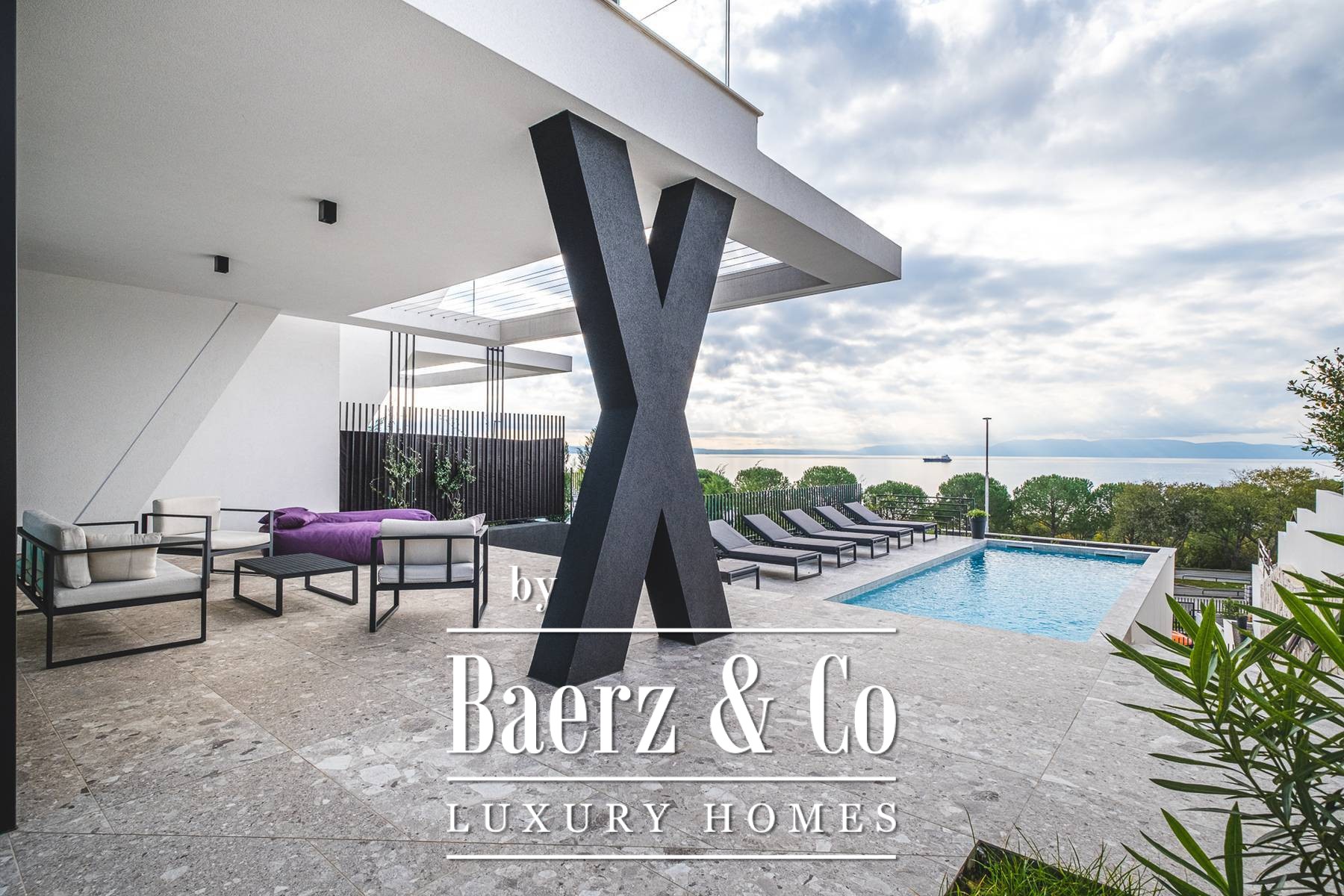 This semi-detached house Kostrena sits on the premier terrace of the Adriatic, where glazed walls draw coastal light into every corner of the 625 m² interior. The property offers a rare blend of modern design, thoughtful spatial flow and constant sea views. On the first floor the open living room is bathed in sun, seamlessly linking to a kitchen and dining space crafted for tranquil gatherings. Large glass doors open directly onto a generous terrace, garden and a private pool, all overlooking the blue stretch of the sea.
