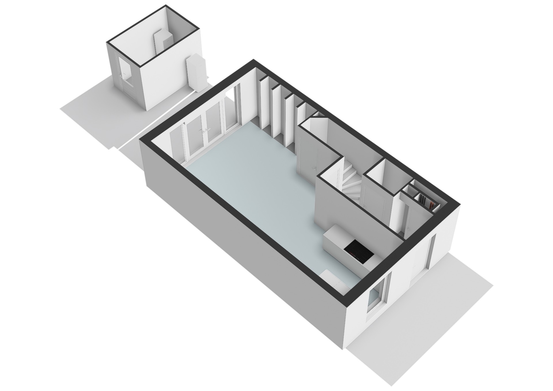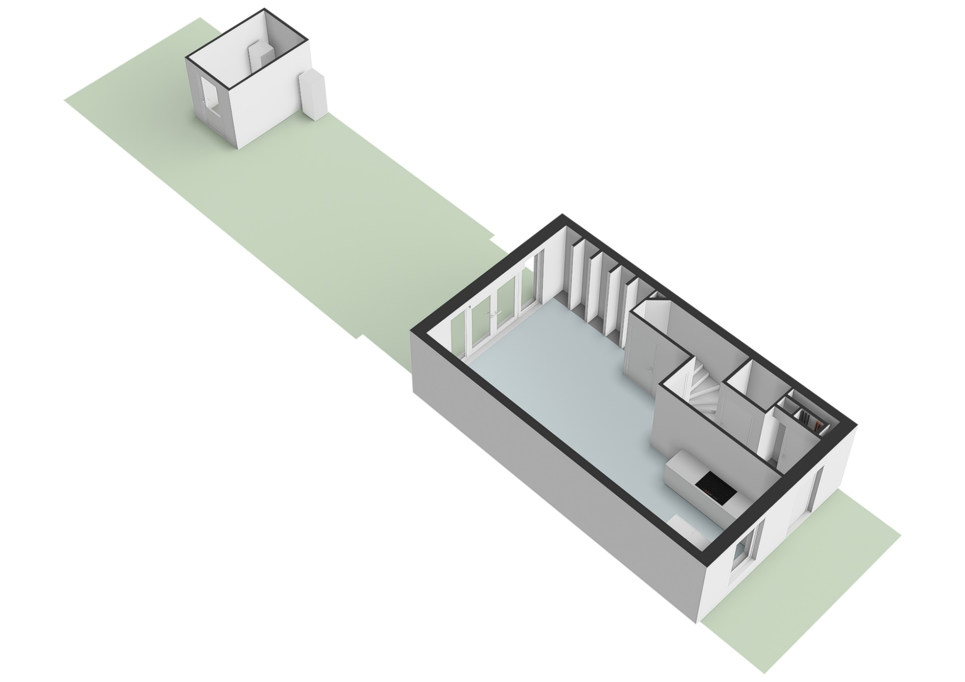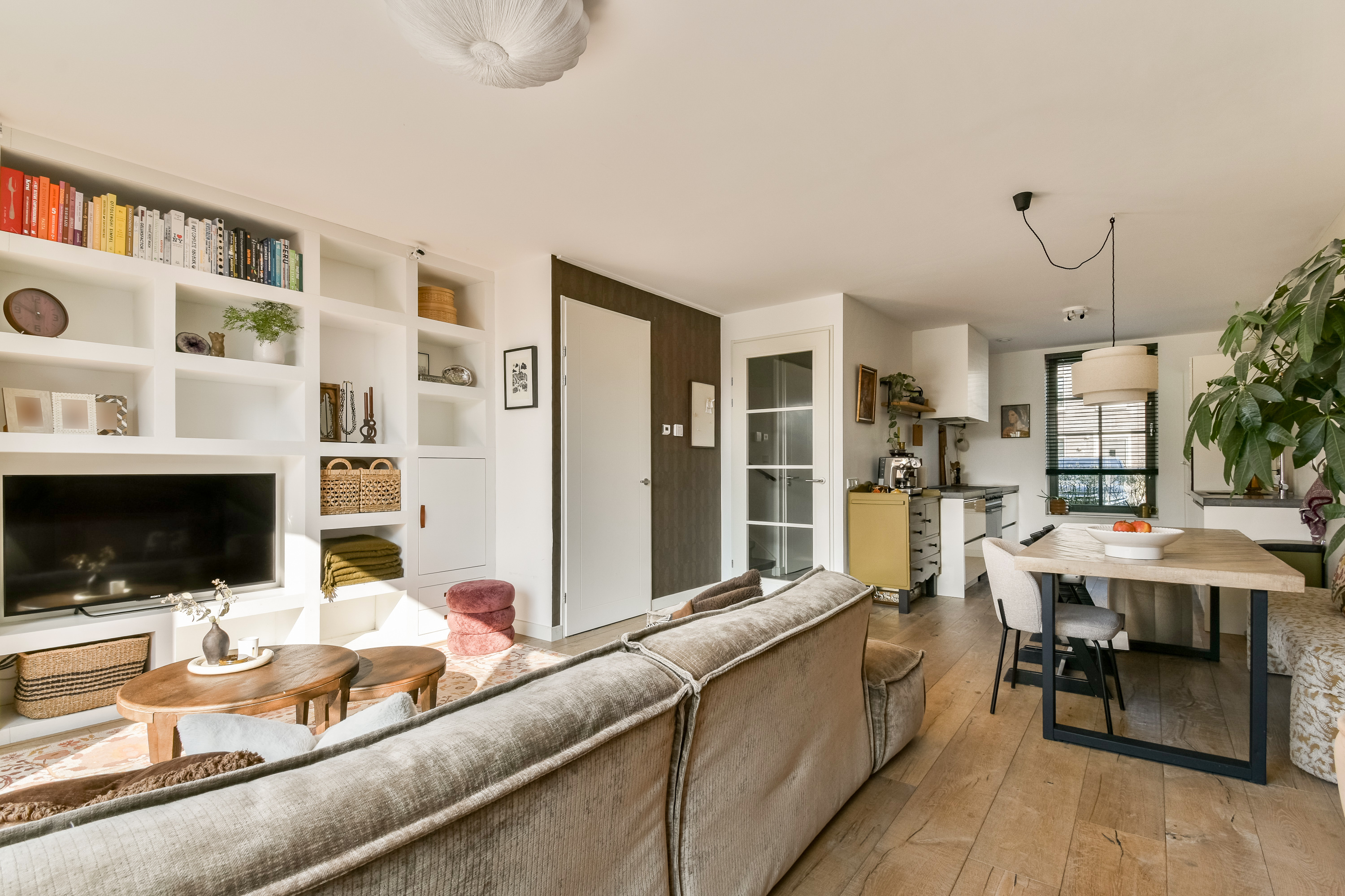 Through the entrance you enter the hallway with meter cupboard and a modern wall-mounted toilet with washbasin. At the front of the house is the open kitchen, equipped with various built-in appliances and a spacious countertop. The living room is located at the rear, with French doors providing access to the beautifully landscaped backyard. The ground floor also features a practical storage cupboard under the stairs.