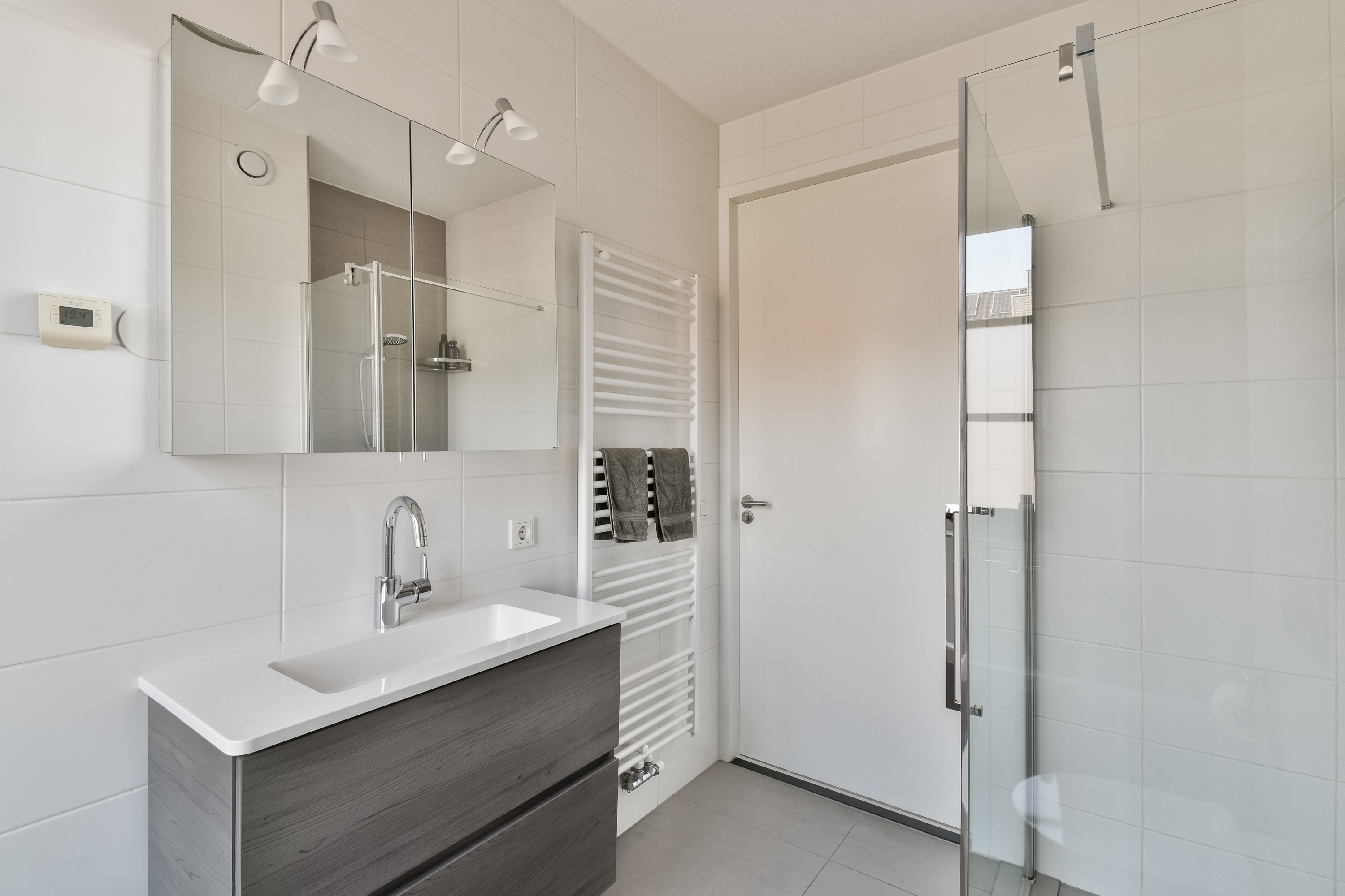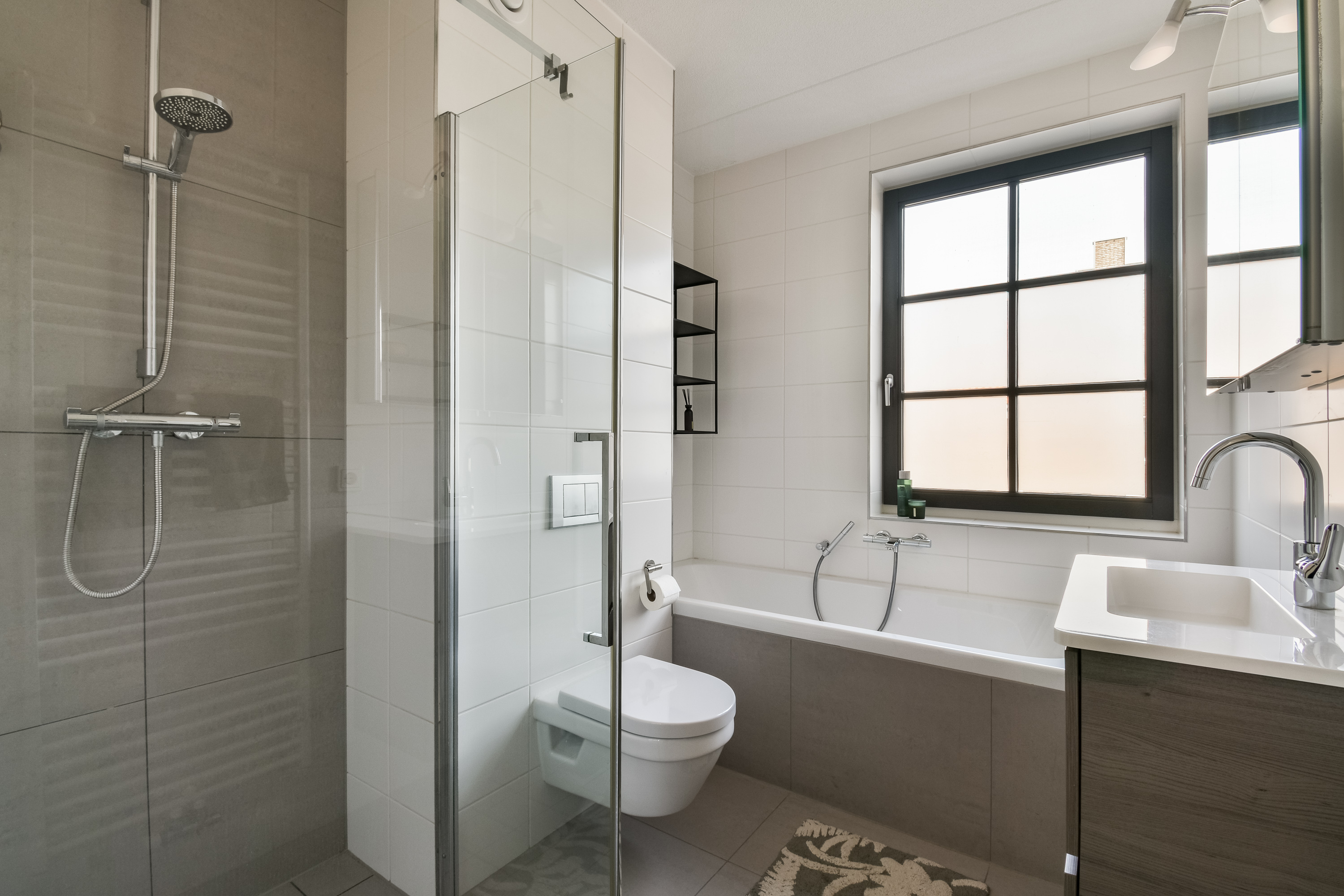 The landing provides access to three well-proportioned bedrooms. The bedroom at the front and the two at the rear are all neatly finished and benefit from plenty of natural light. The modern bathroom is equipped with a bathtub, walk-in shower, second toilet, vanity unit, and designer radiator.