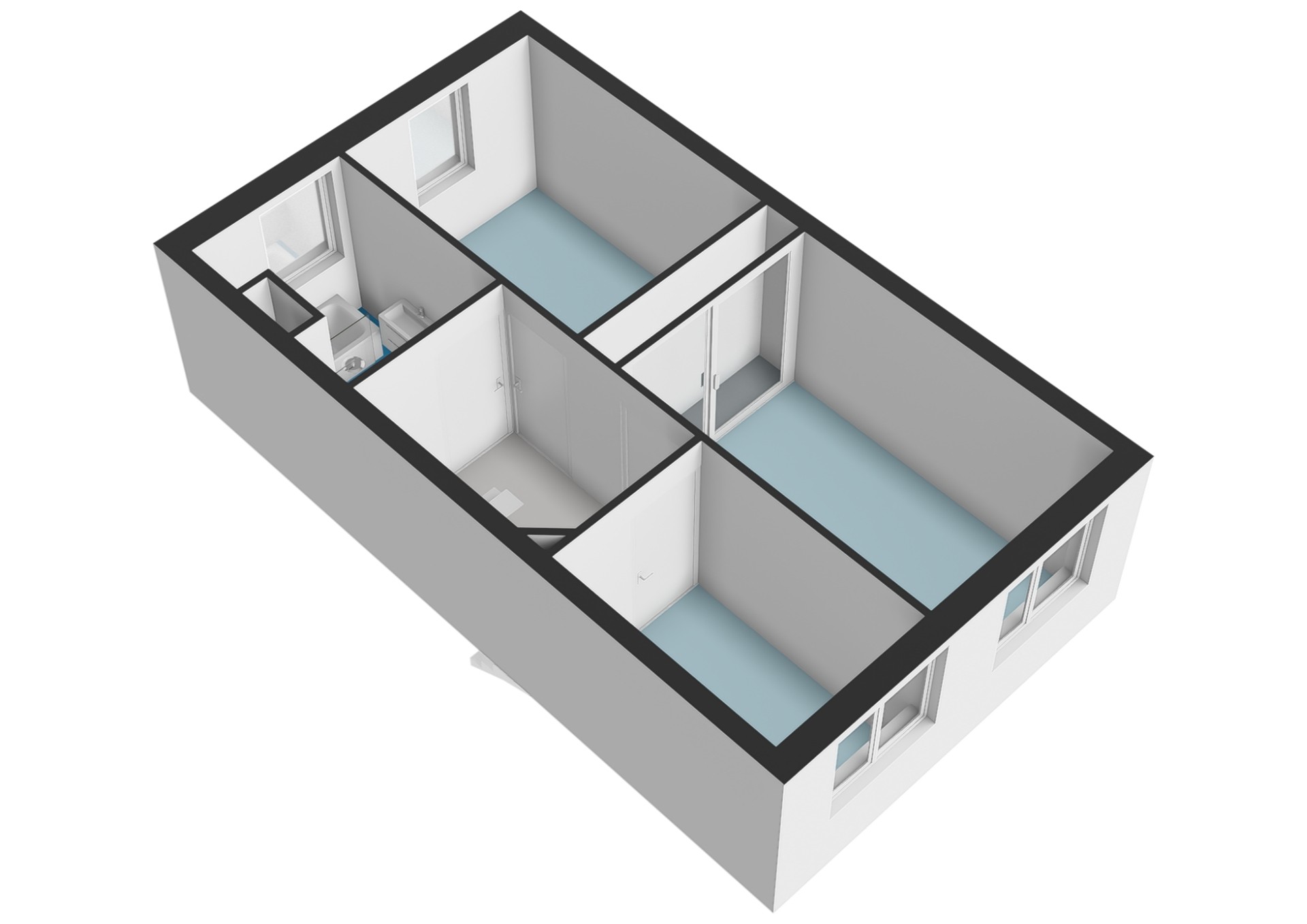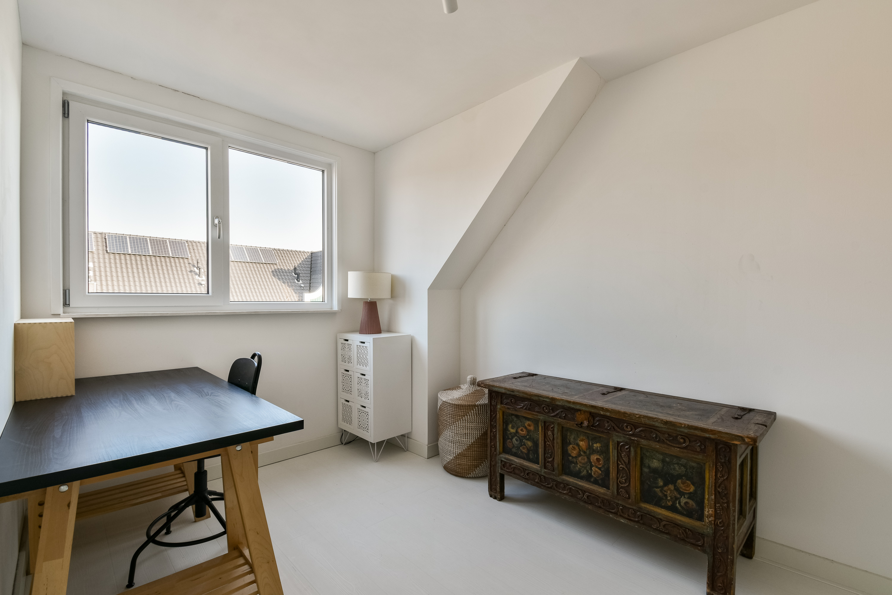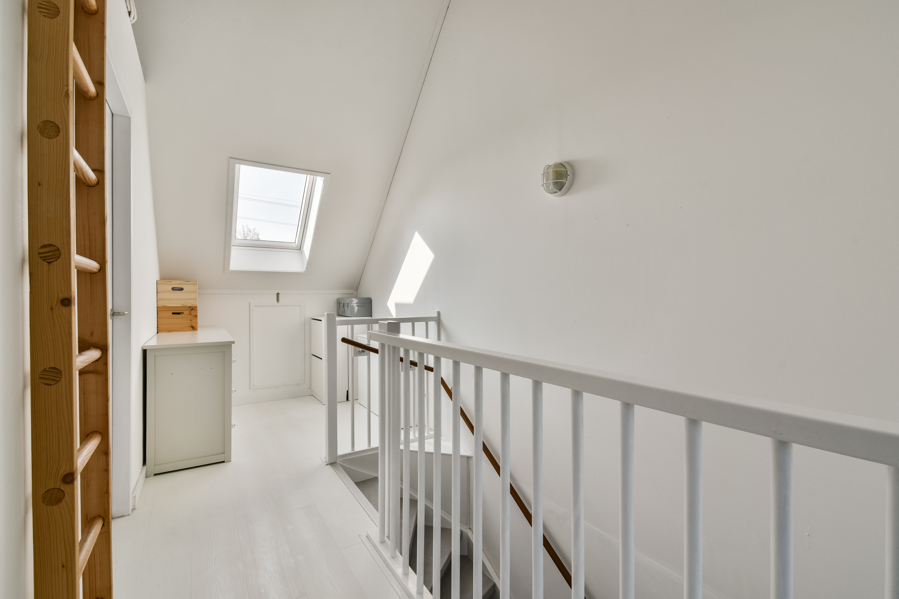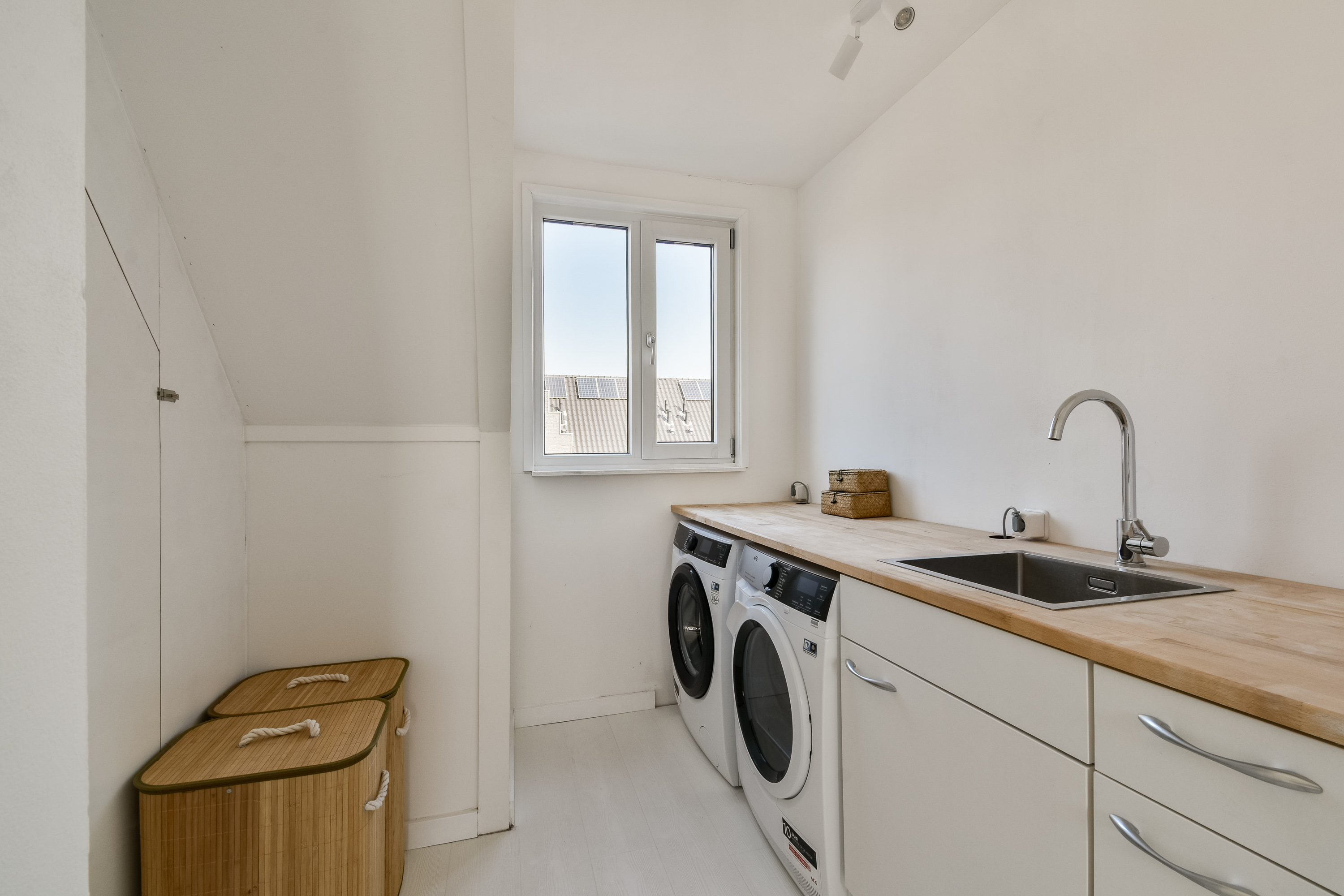 A fixed staircase leads to the second floor. Here you will find two additional full-sized bedrooms, both with natural light. There is also a separate space with connections for a washing machine and dryer, as well as the technical installations.