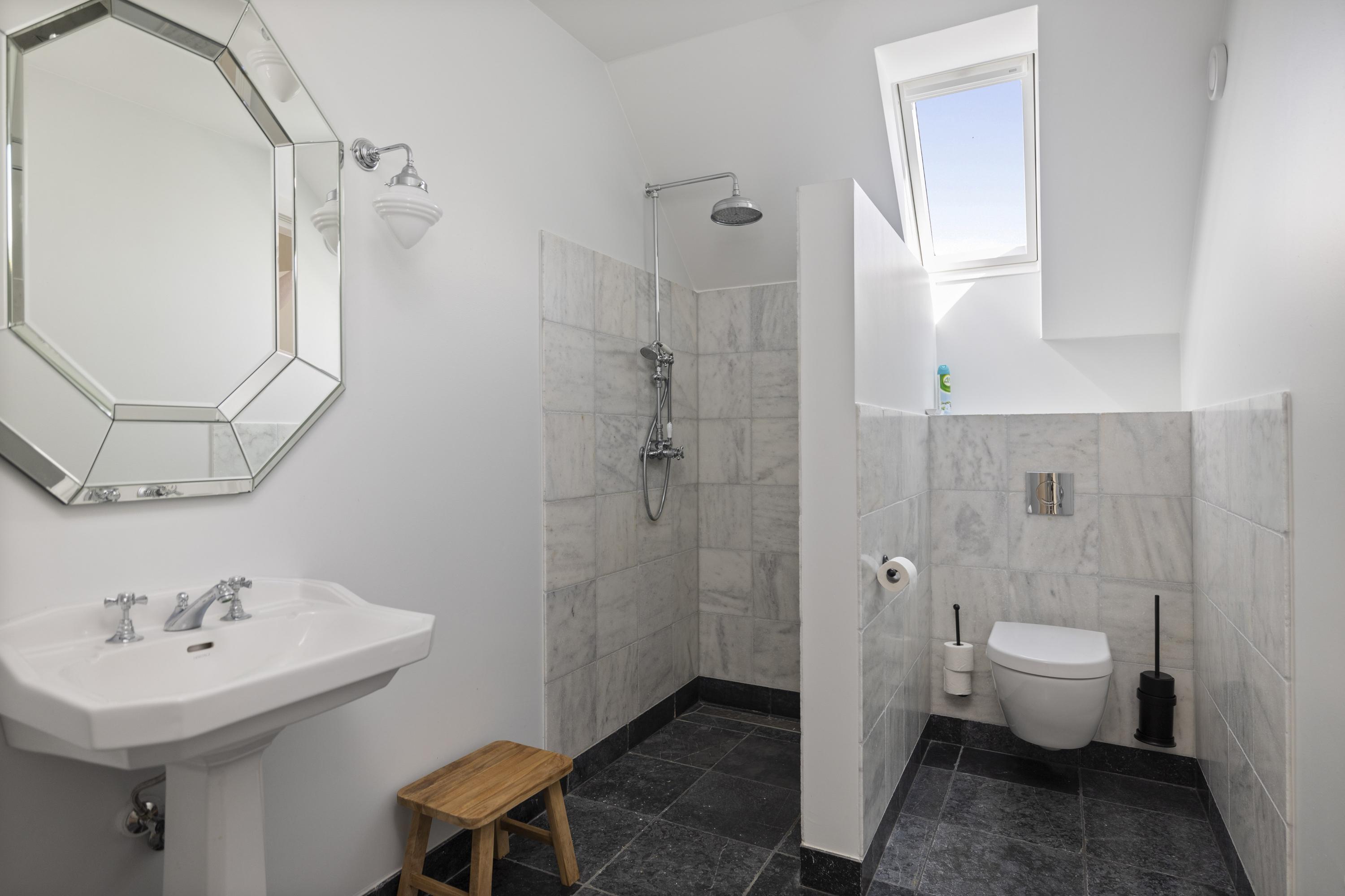 The light-filled landing leads to three bedrooms, two of which are suites with their own bathrooms. The master suite evokes the feel of a boutique hotel, complete with walk-in wardrobe and integrated bathroom with bath, walk-in shower, and twin basins. Indulging in the freestanding bath becomes all the more blissful when you light the glass-fronted fireplace. The landing also includes storage cupboards and a separate Geberit AquaClean WC.
