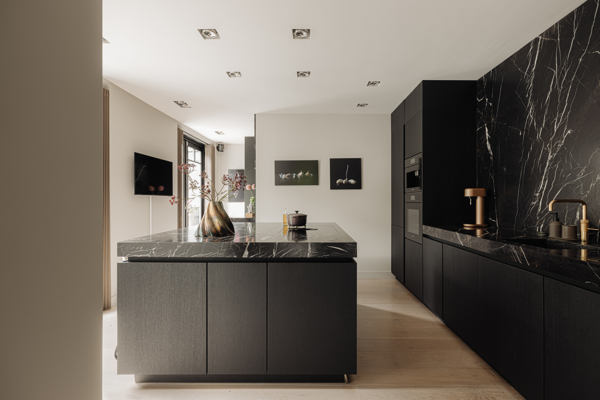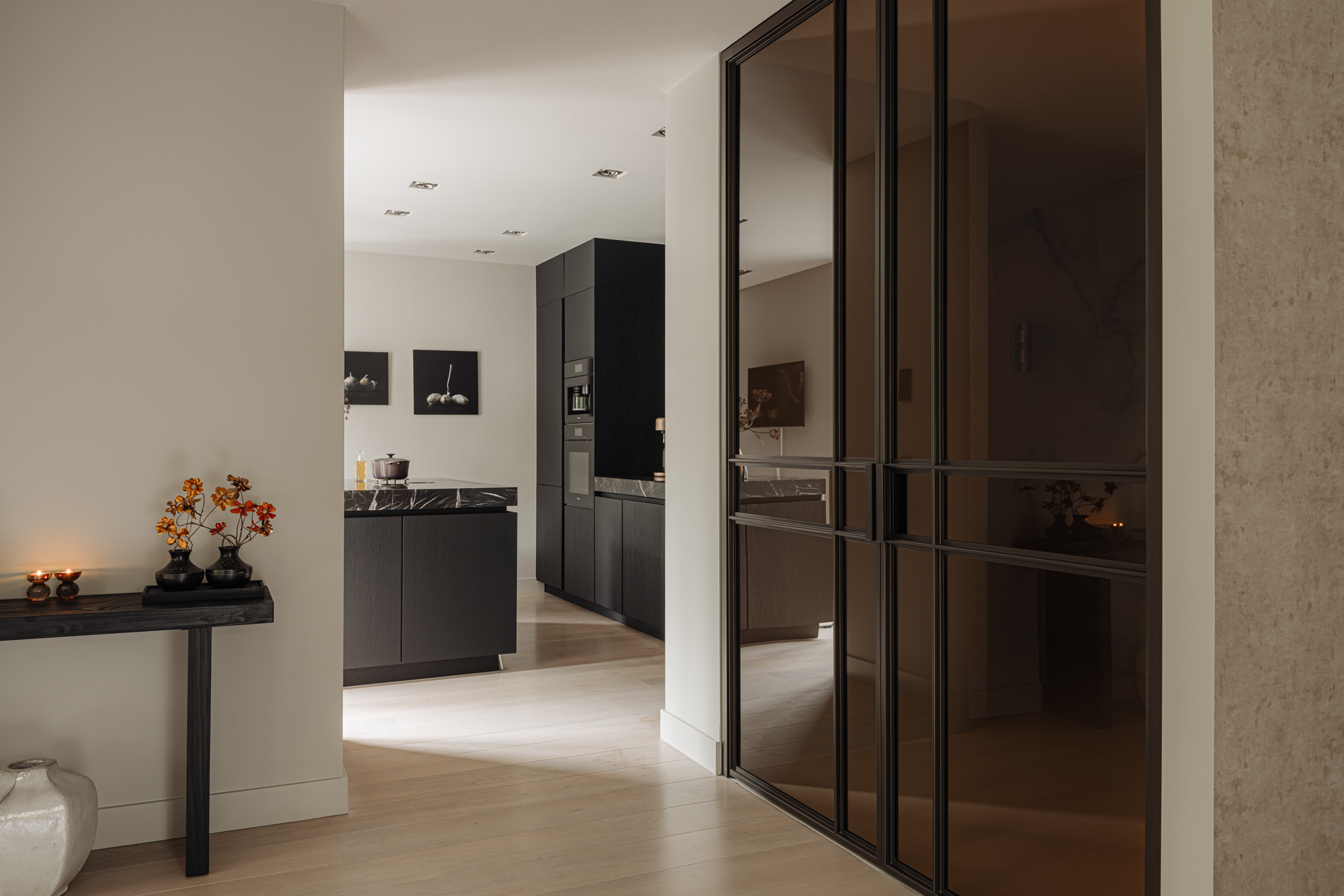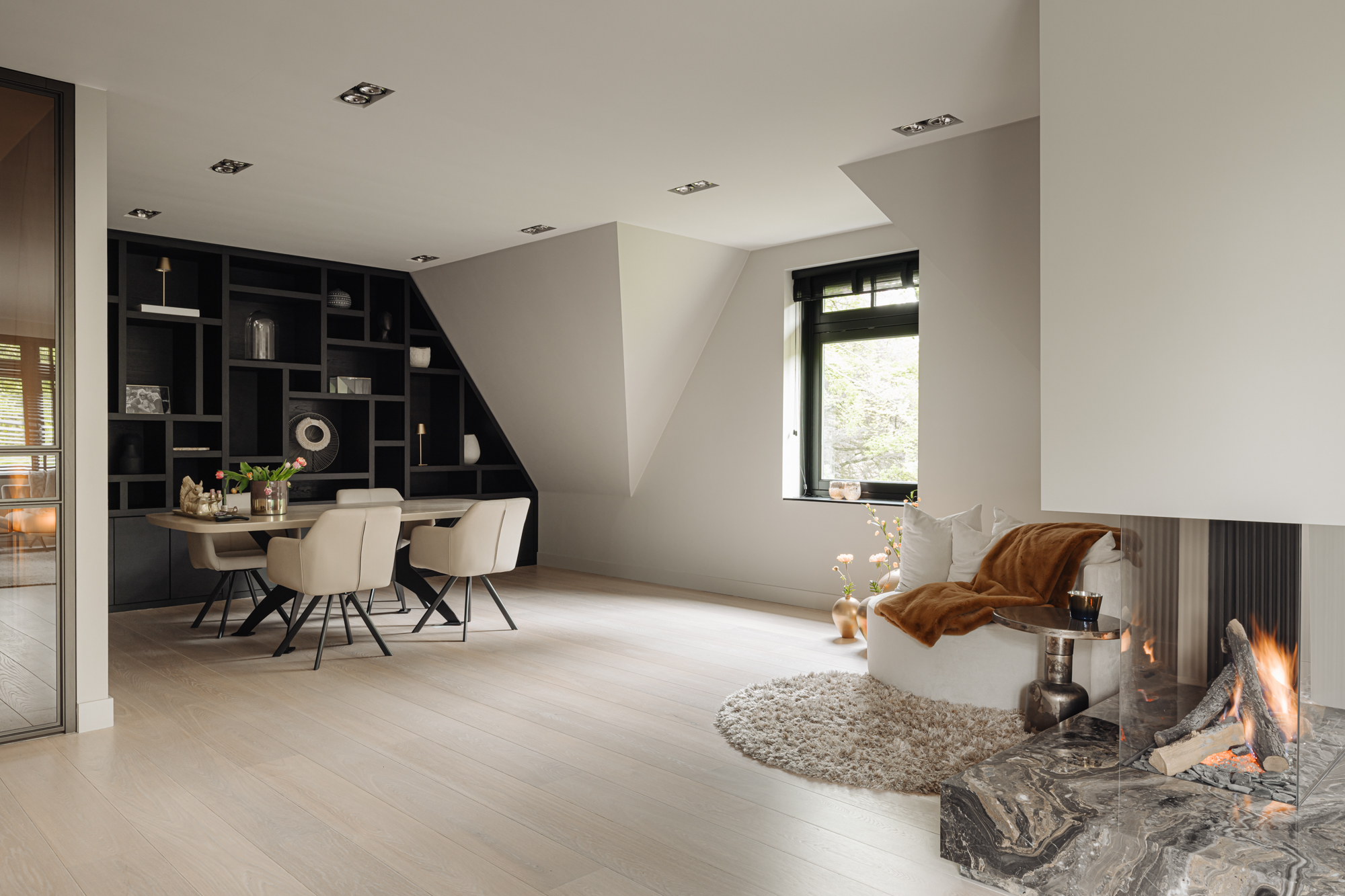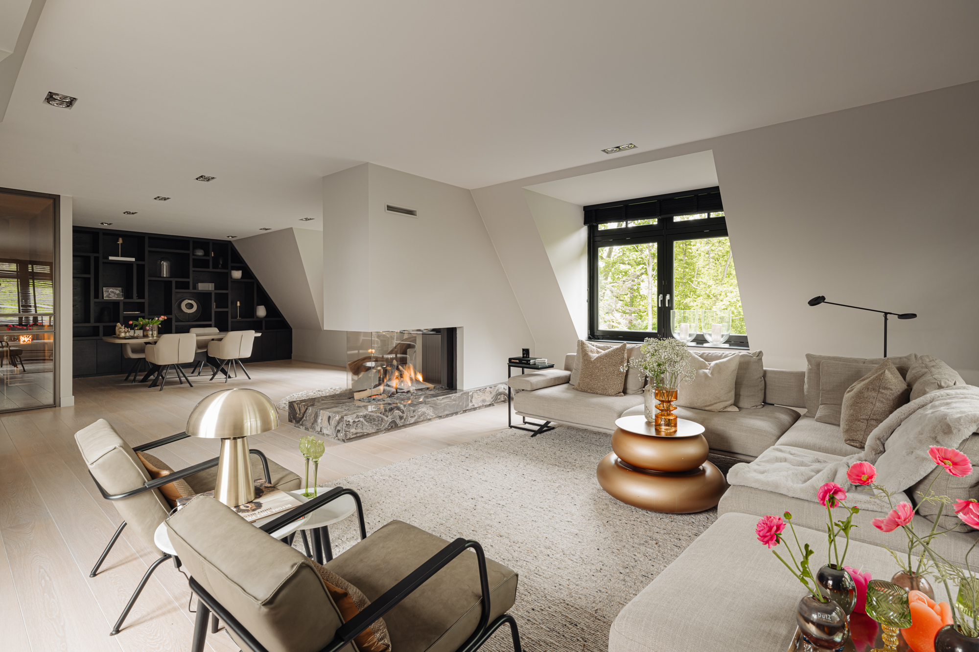 Through the double French doors, fully custom-made and executed in bronze, you enter the living area of this penthouse. The light immediately catches your eye, streaming in through the French doors from the terrace into the living room. The spacious seating area is oriented towards the gas fireplace, framed in marble. On the other side of the gas fireplace is the cozy dining area. Here, the beautiful custom cabinet and the stunning view outside provide a wonderful backdrop for long evenings dining with family and friends.