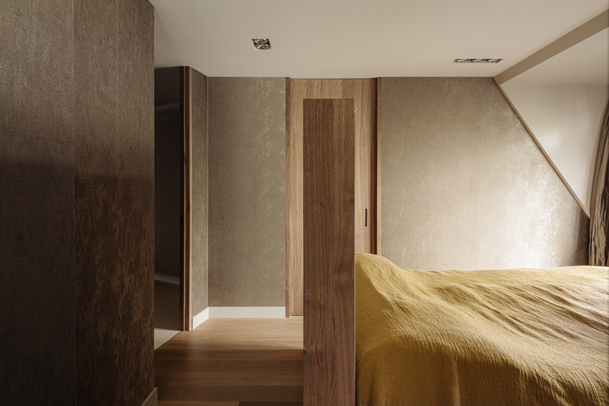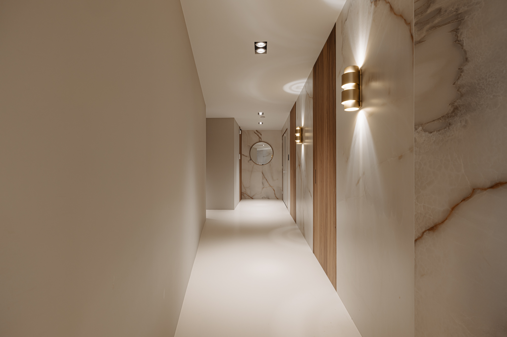 The hallway features a beautifully finished floors combined with Onyx wall coverings and plasterwork in soft earthy tones.