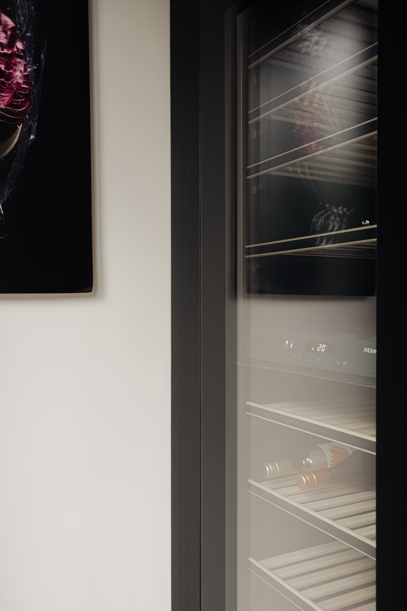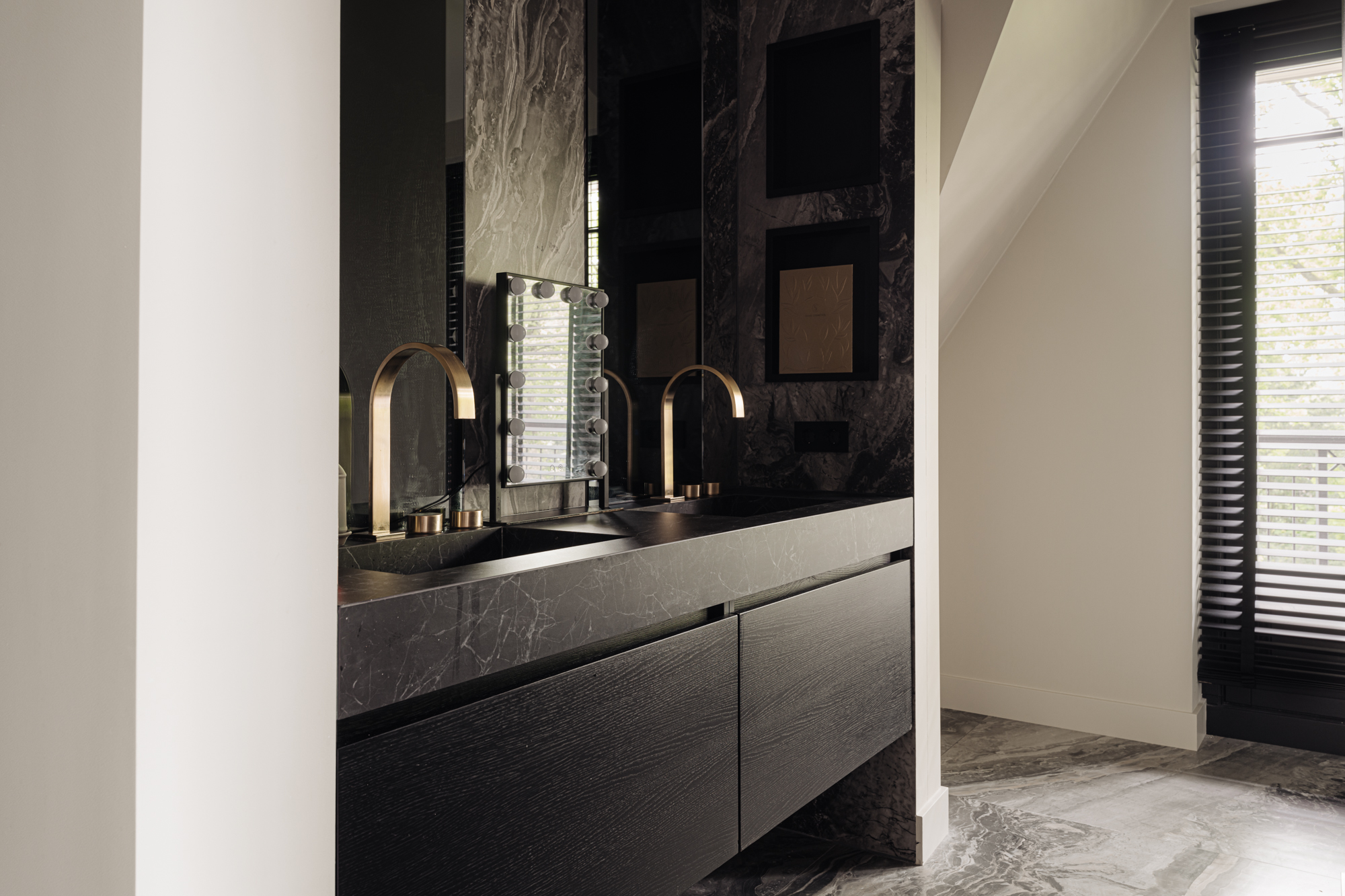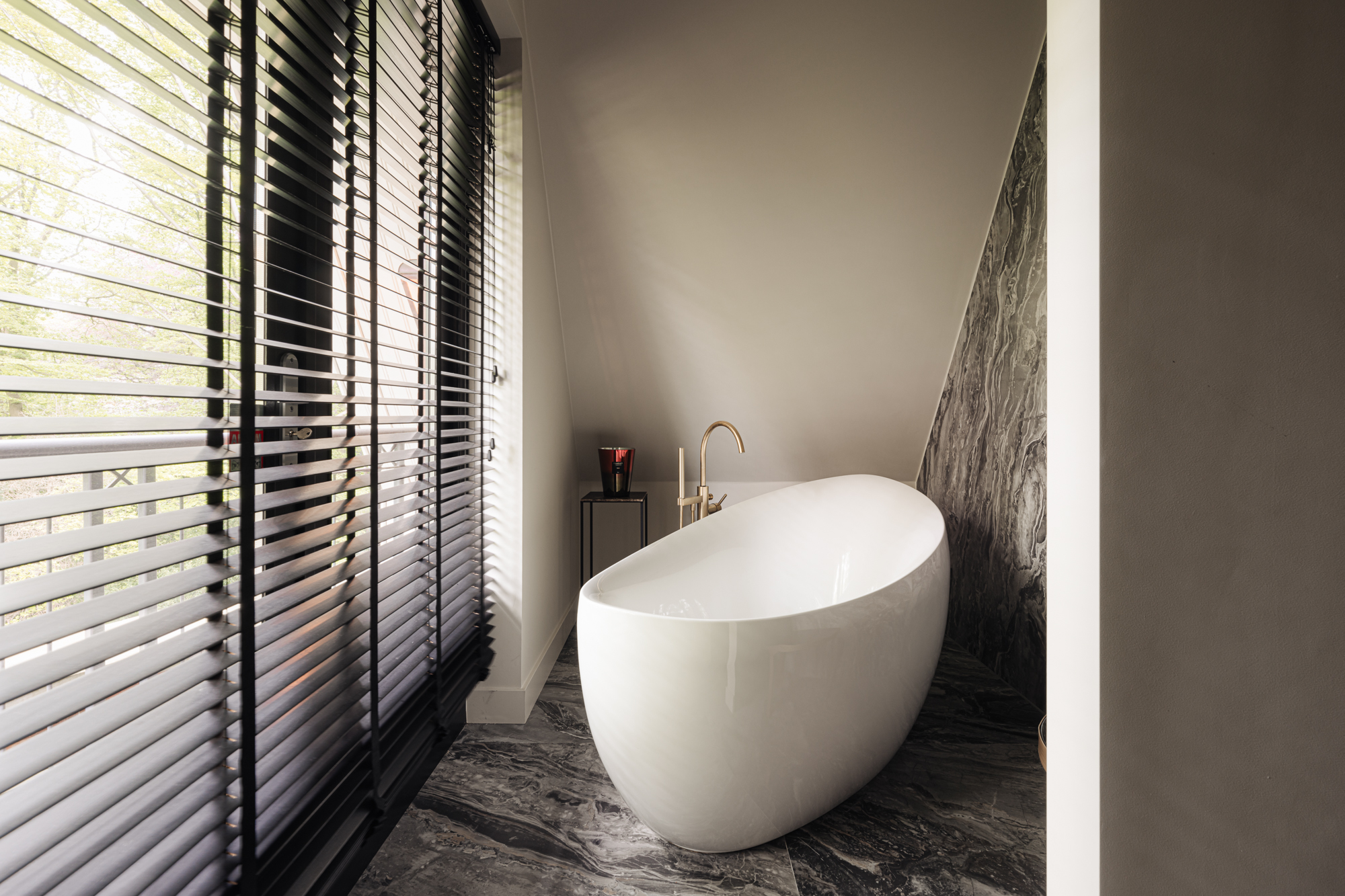 Directly from the living area, you reach the kitchen, a tribute to culinary arts, complete with a luxurious marble countertop and state-of-the-art appliances that will delight even the most demanding gourmet. This includes an XL wine climate cabinet, dishwasher, (steam) oven, built-in coffee machine, and induction hob from the renowned brand Miele. From the kitchen, there is again a seamless transition between indoors and outdoors thanks to the bar at the kitchen island with double French doors to the terrace directly behind it. A perfect spot for a chilled glass of rosé on summer evenings.