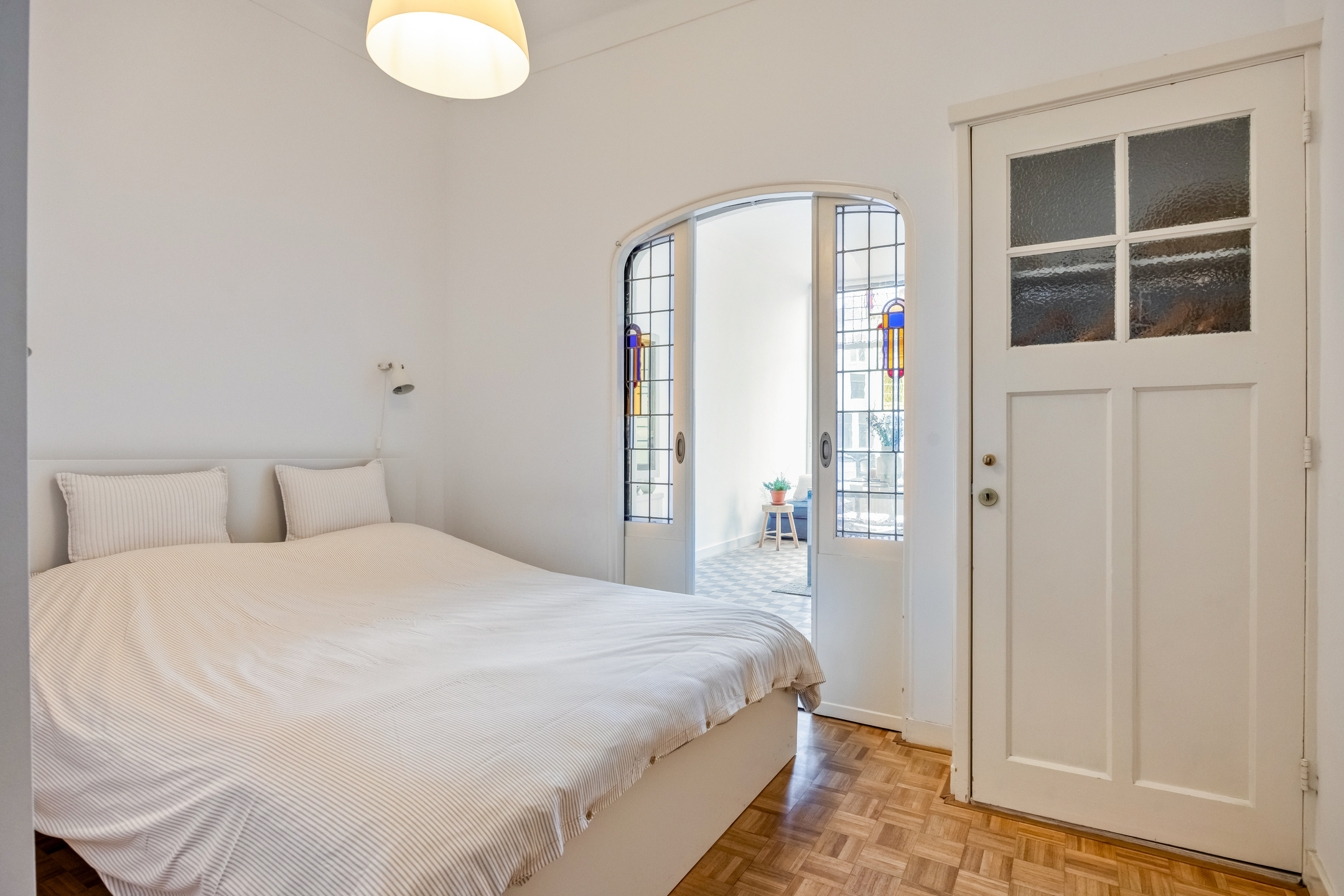 Bedroom with mezzanine and second bedroom with French doors and balcony. Passage to front house