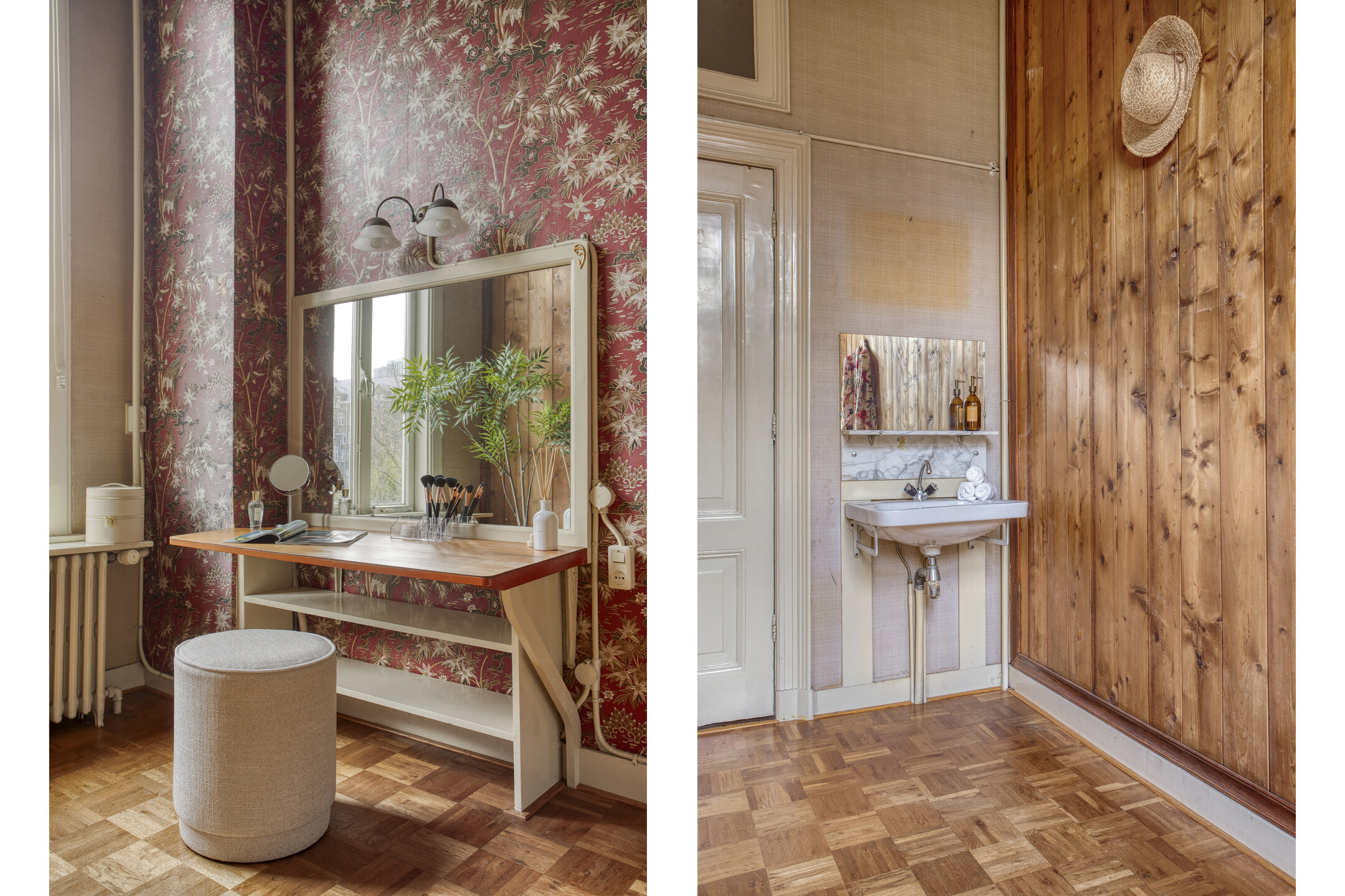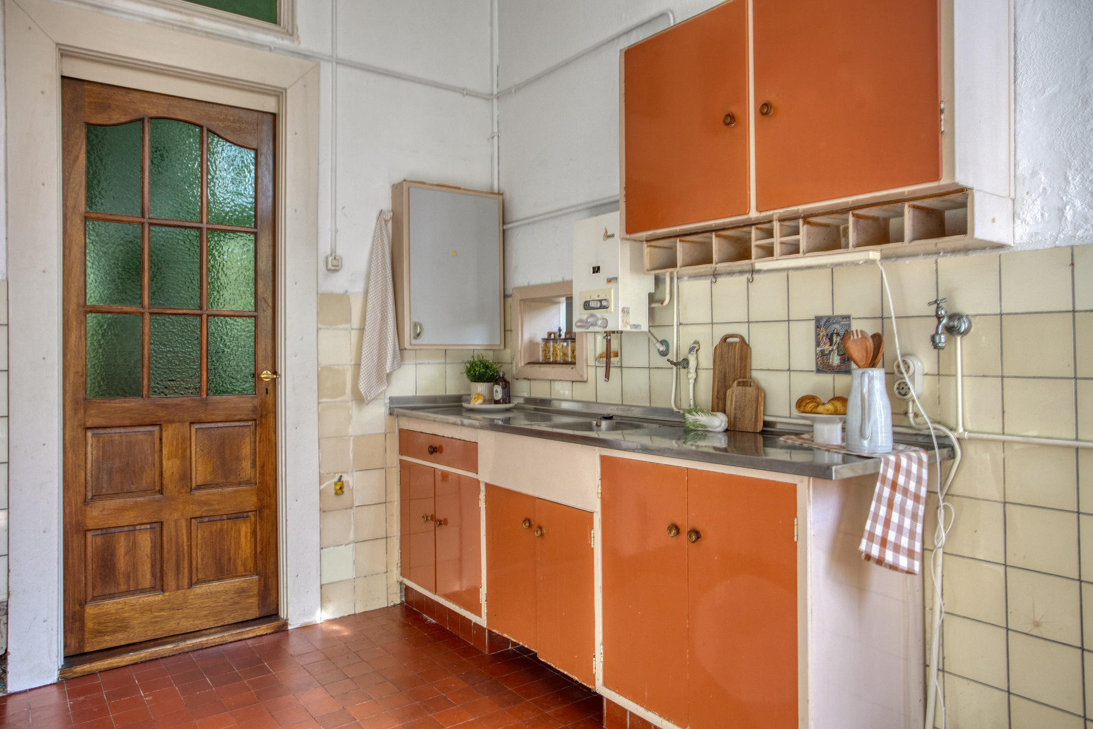 Behind its facade, the home preserves the elegance of its era: high ceilings, tall windows, generous detailing in façades, stucco, staircases, and doors. Upon entry, a marble hall with lofted ceilings and stately stairs mediates a calming transition from city pace to interior quiet. The classic living room, with original ensuite doors and ornamental ceilings, opens to a luminous eat-in area and a garden-facing conservatory. Eight bedrooms unfold across the first and second floors, with a study, walk-in closet, and flexible guest or work spaces, accommodating family living or home working.
