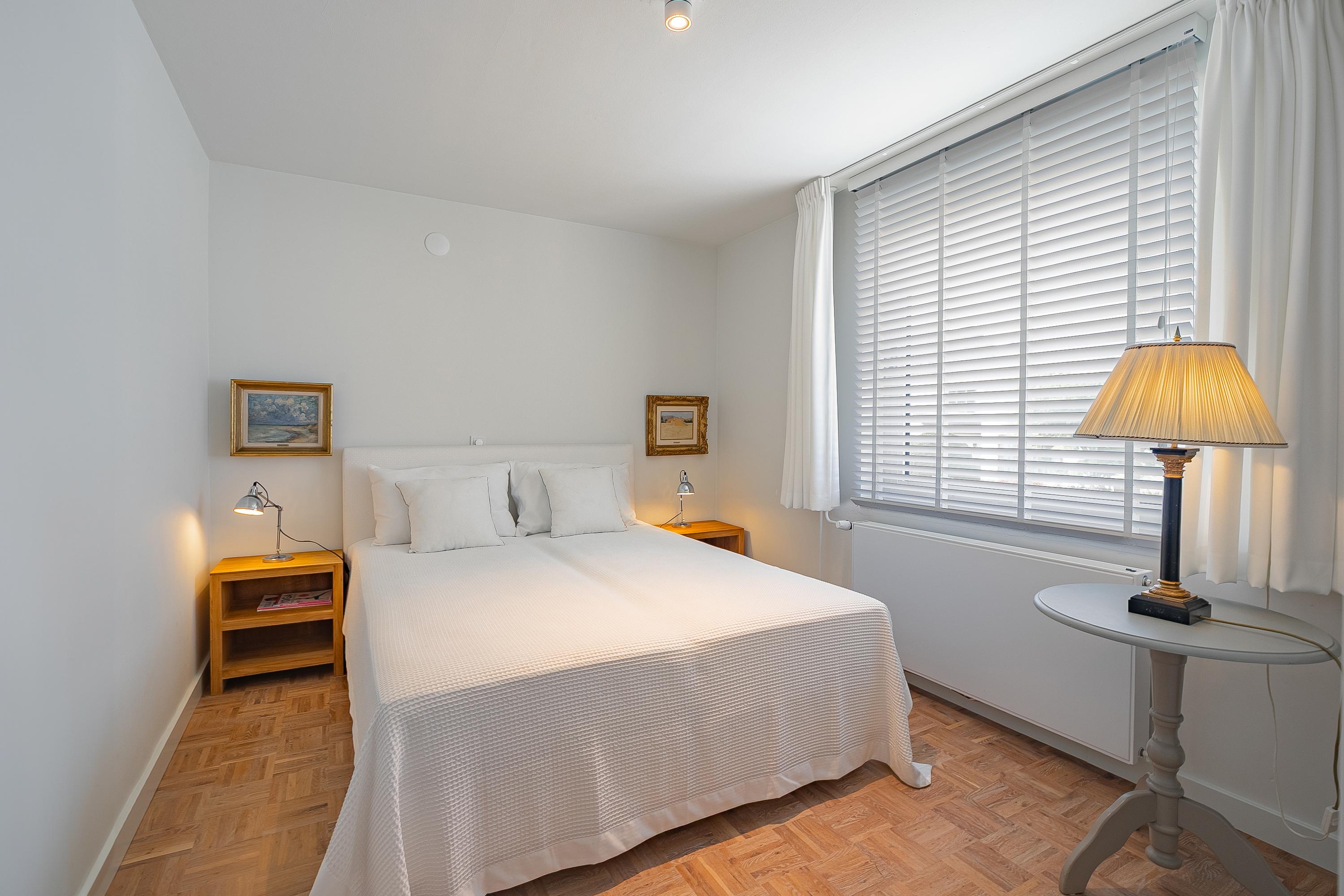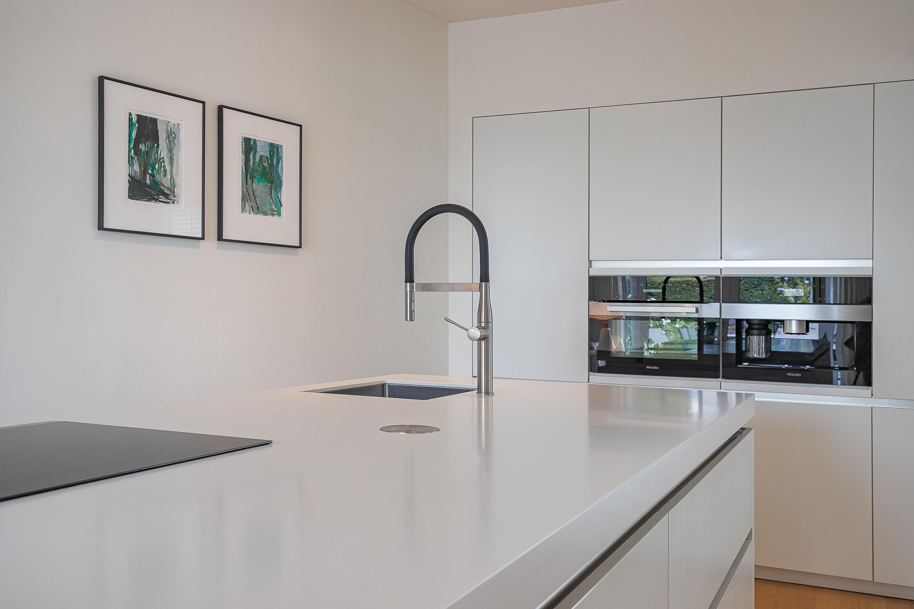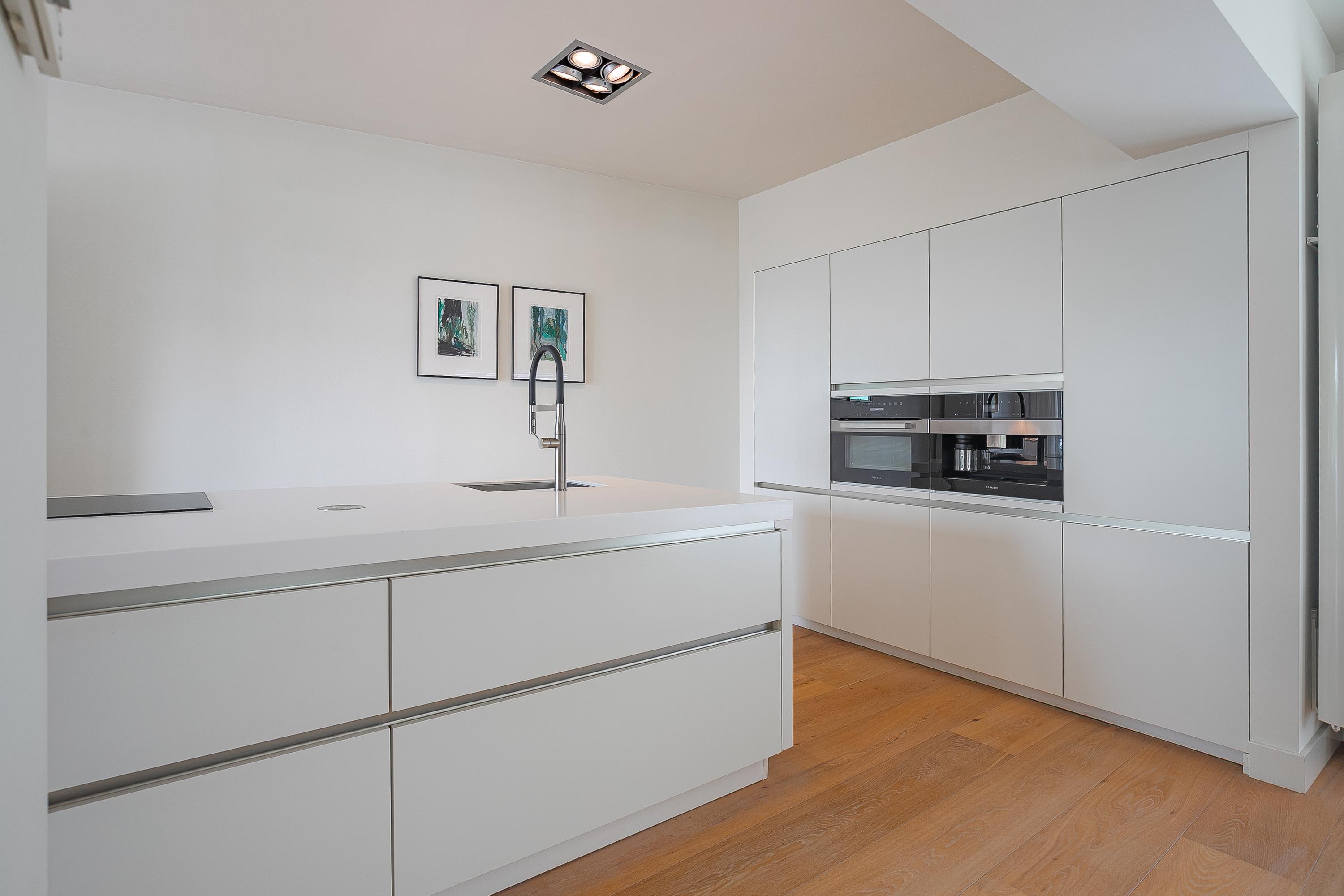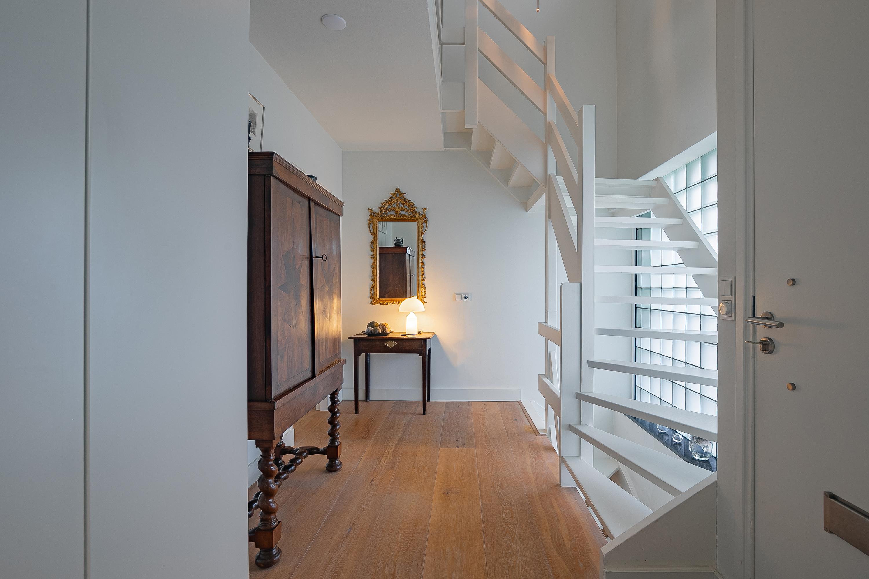 The open-plan ground floor centres on a spacious living space of approximately 68m², distinguished by oak parquet flooring, a custom Faber gas fireplace, and designer radiators. A handle-free kitchen with a five-zone induction hob, convection oven, built-in coffee machine, and sliding doors to the garden invites effortless daily rhythm and entertaining. The living area transitions to a sheltered northeast-facing city garden and a leafy front courtyard catching the evening sun.