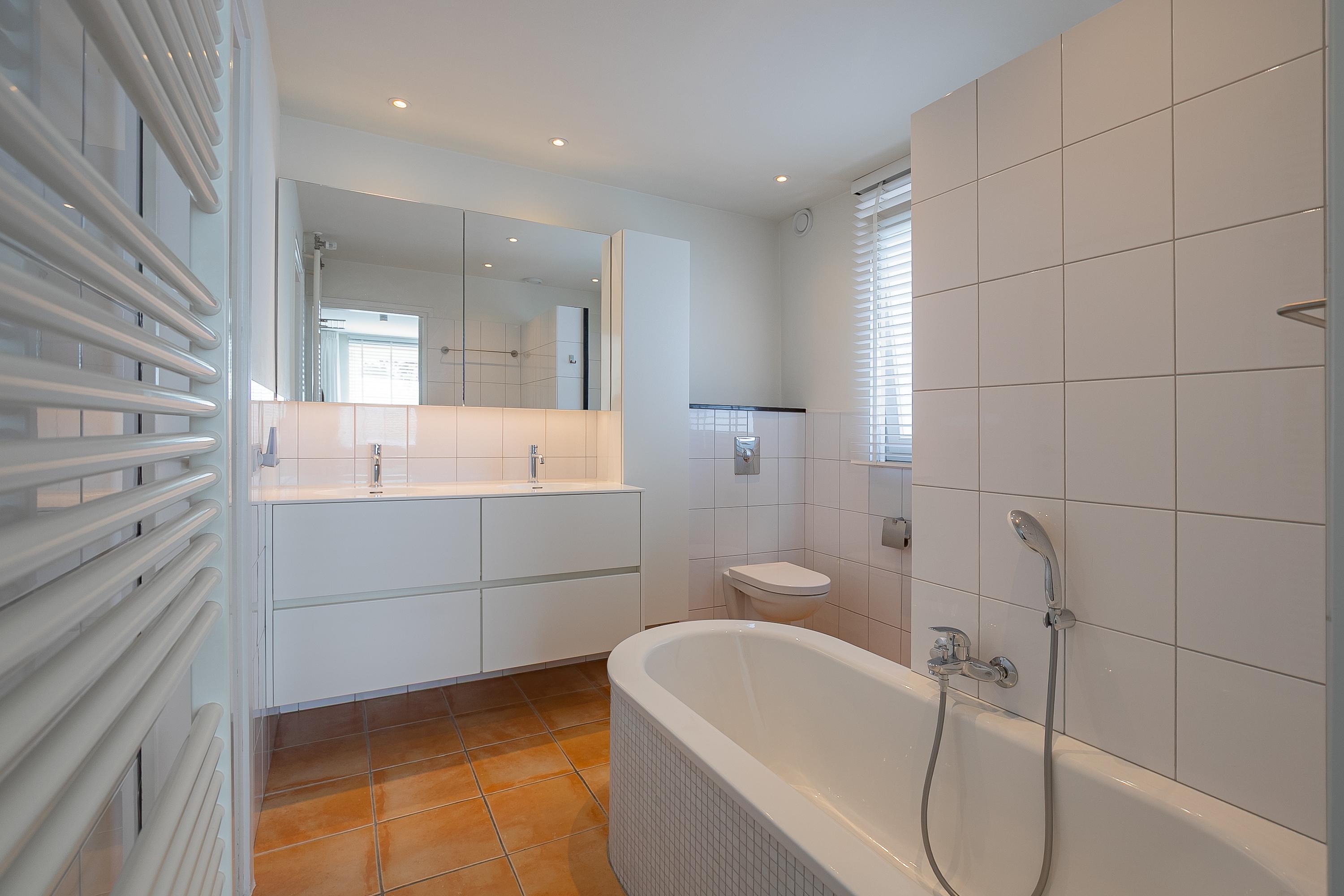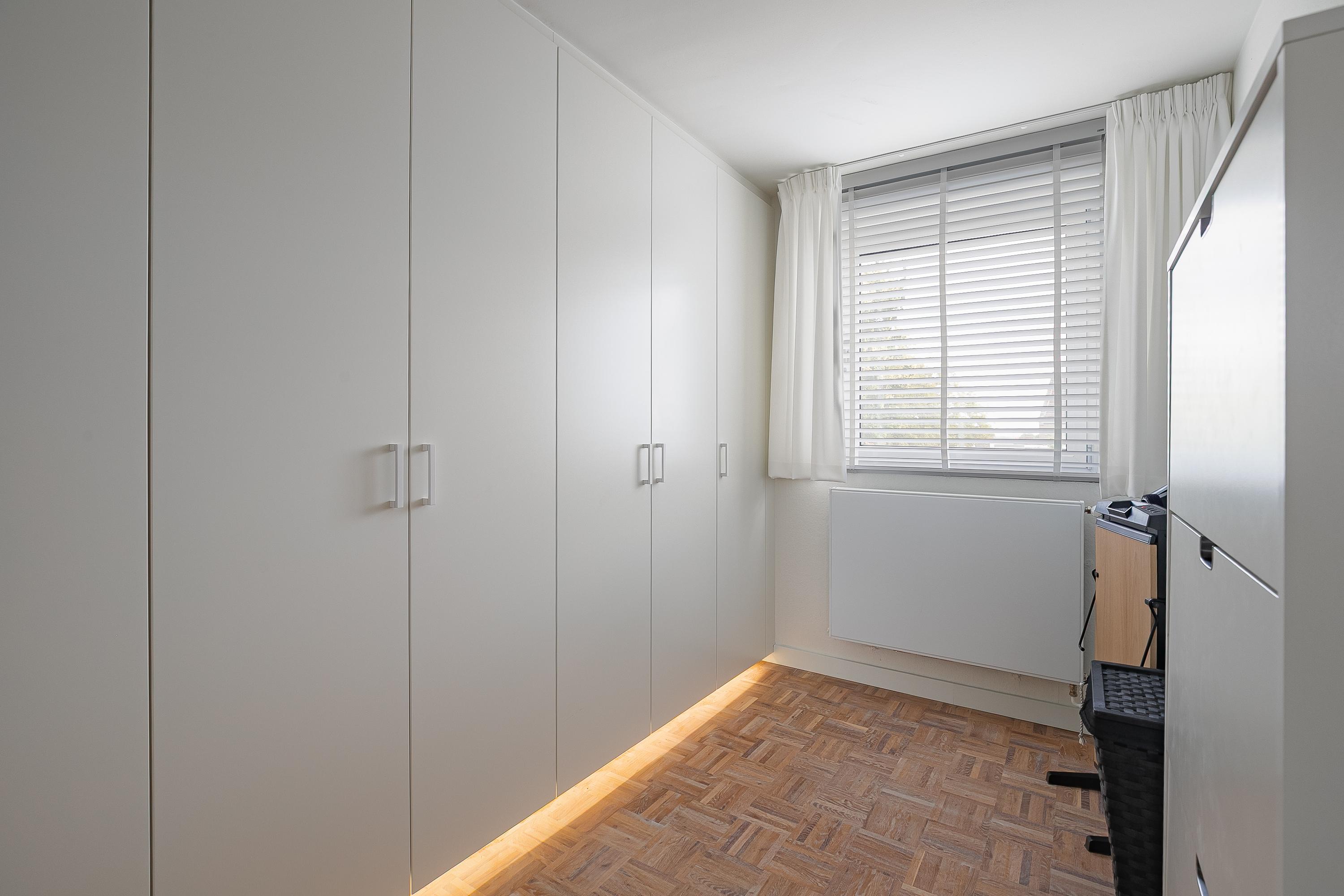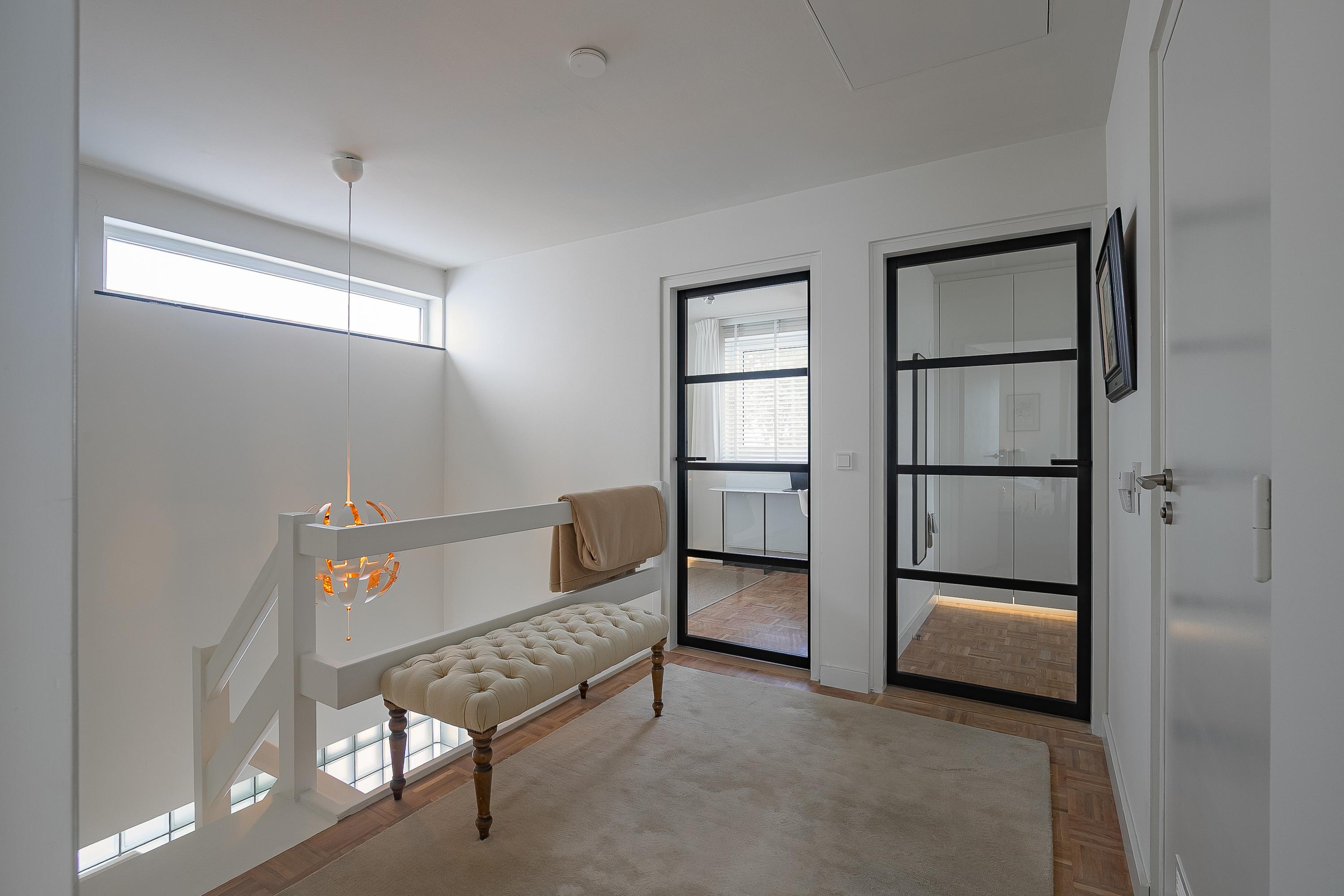 Upstairs, four bedrooms are complemented by bespoke cupboards from Slangen Interieurbouw and a mosaic parquet finish. The bathroom features both walk-in shower and bathtub, mechanical ventilation, and underfloor heating. The master suite benefits from air conditioning; storage solutions abound with a generous basement—hosting a 33m² garage and utility rooms—and attic storage above.