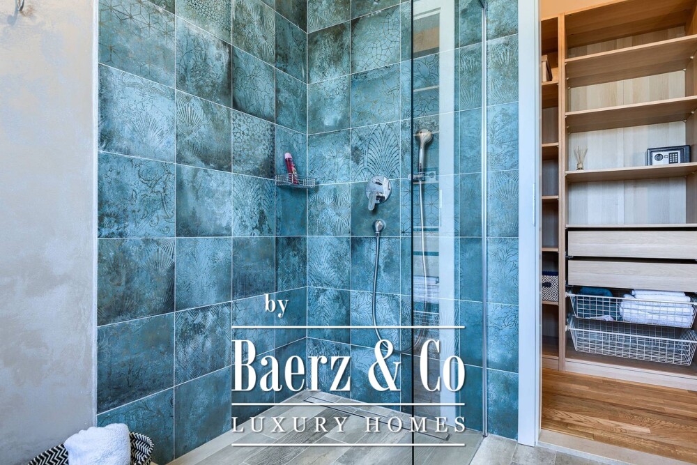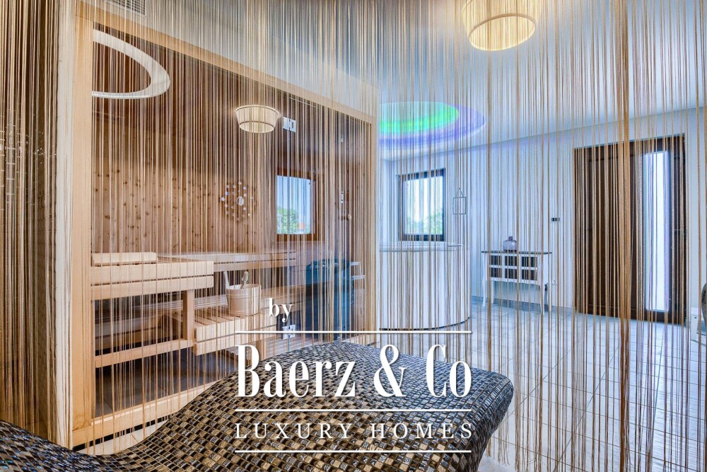 Ascending to the first floor reveals two more bedrooms, both with en-suite bathrooms and access to a balcony that offers views across the pool, olive trees, and the surrounding Mediterranean landscape. The outdoor rhythm of the property resonates with a covered terrace for open-air cooking and dining, overlooking a heated pool of 50 m², a tennis court, golf putting green, and multiple sports fields. Children’s play areas and a football field provide space for leisure for all ages.