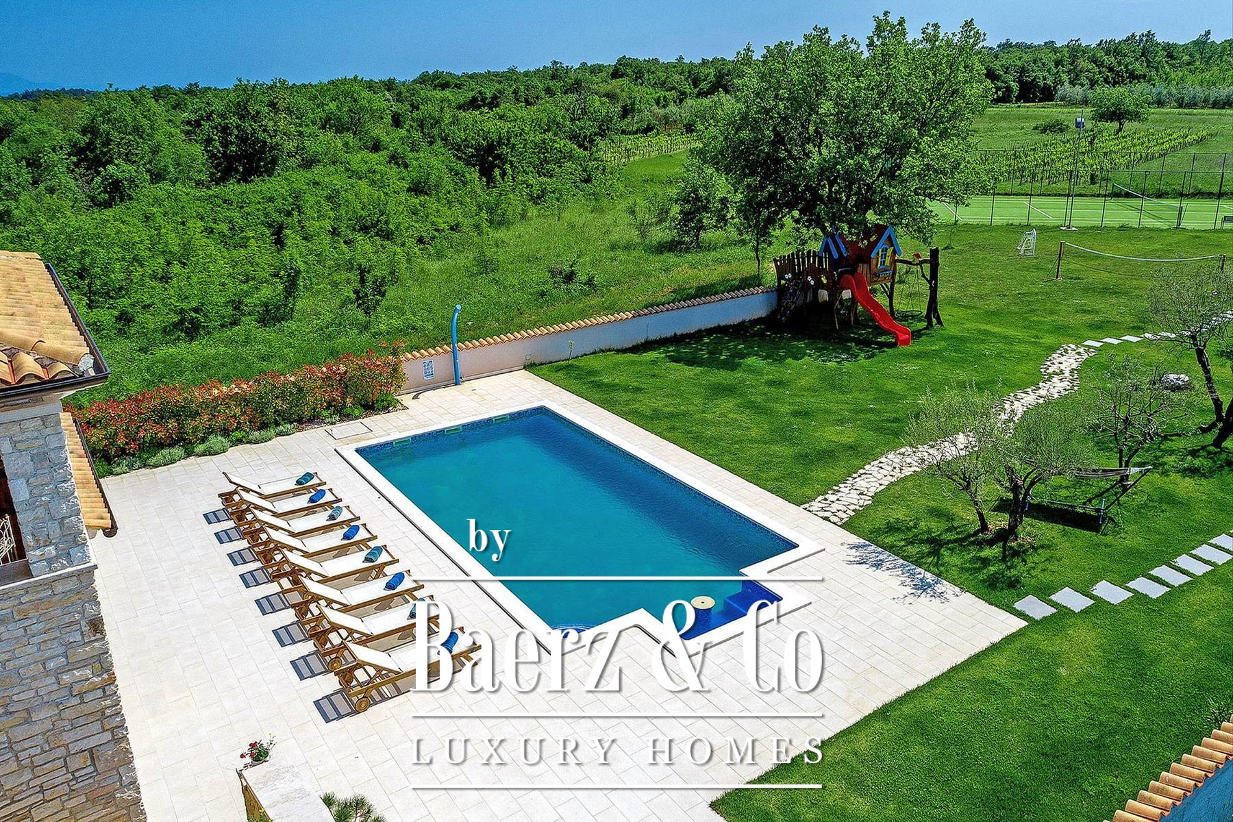 A dedicated wellness room with a sauna and heated hydromassage pool fosters relaxation after a day of activity. This villa in Marčana is close to the Adriatic coast, offering both privacy and access to the sought-after amenities and beaches of Istria. An additional 2000 m² of adjoining construction land is available for those interested in future expansion.