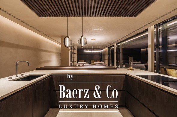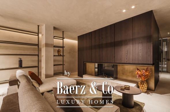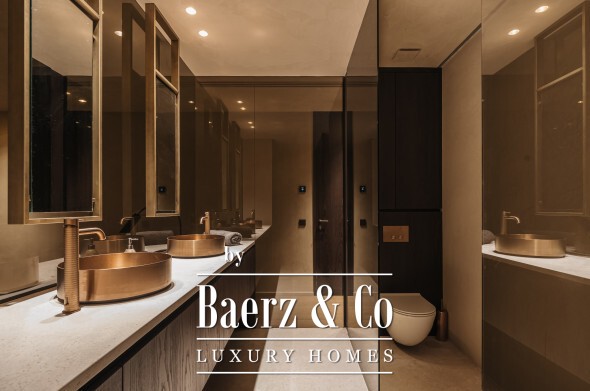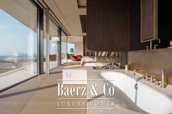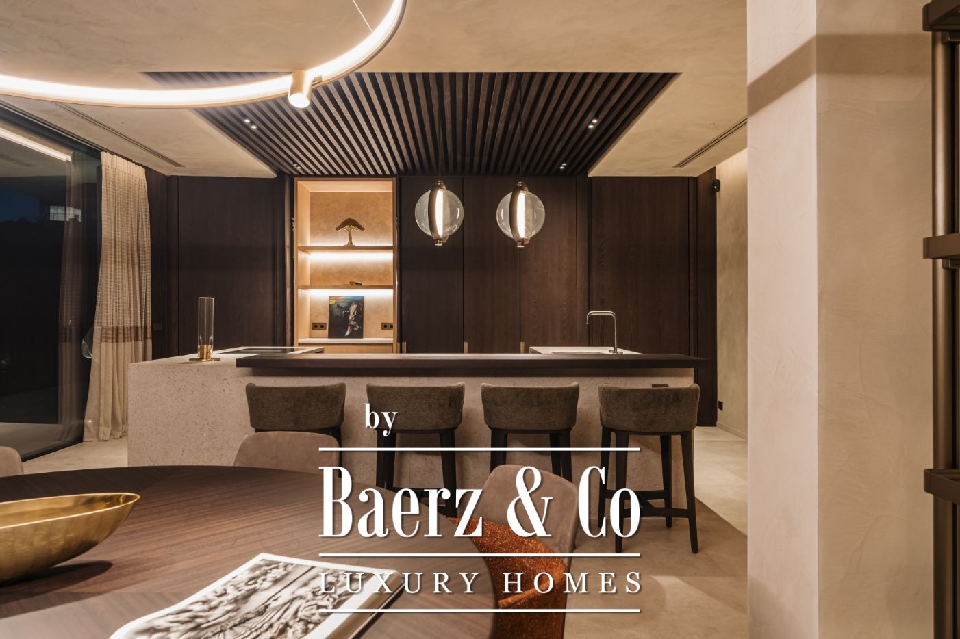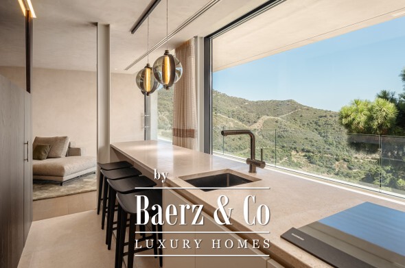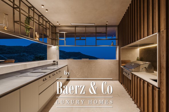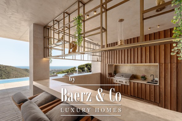 A cosy main living room boasts an integrated fireplace. Chic wood panels and exposed brick offer up an immaculate, healthy ambiance in the lounge. Another fireplace divides a magnificent Master bedroom and a luxurious bathroom, both with wooden floors and feature walls. Imagine waking up to awe-inspiring sunrises, savouring the tranquillity of the surrounding nature of Monte Mayor, and witnessing sensational sunsets from the comfort of your own home. In a sleek fully fitted kitchen and dining area space, modern accents steal the show. Cooking will be an art and fun in all 4 inspiring kitchens (of which one for a personal chef) equipped with superb Gaggenau appliances including gas, induction, teppanyaki and BBQ. A walk-in refrigerator of 6 m² provides fantastic access and ample storage space. Interior design by Signature Design concepts.