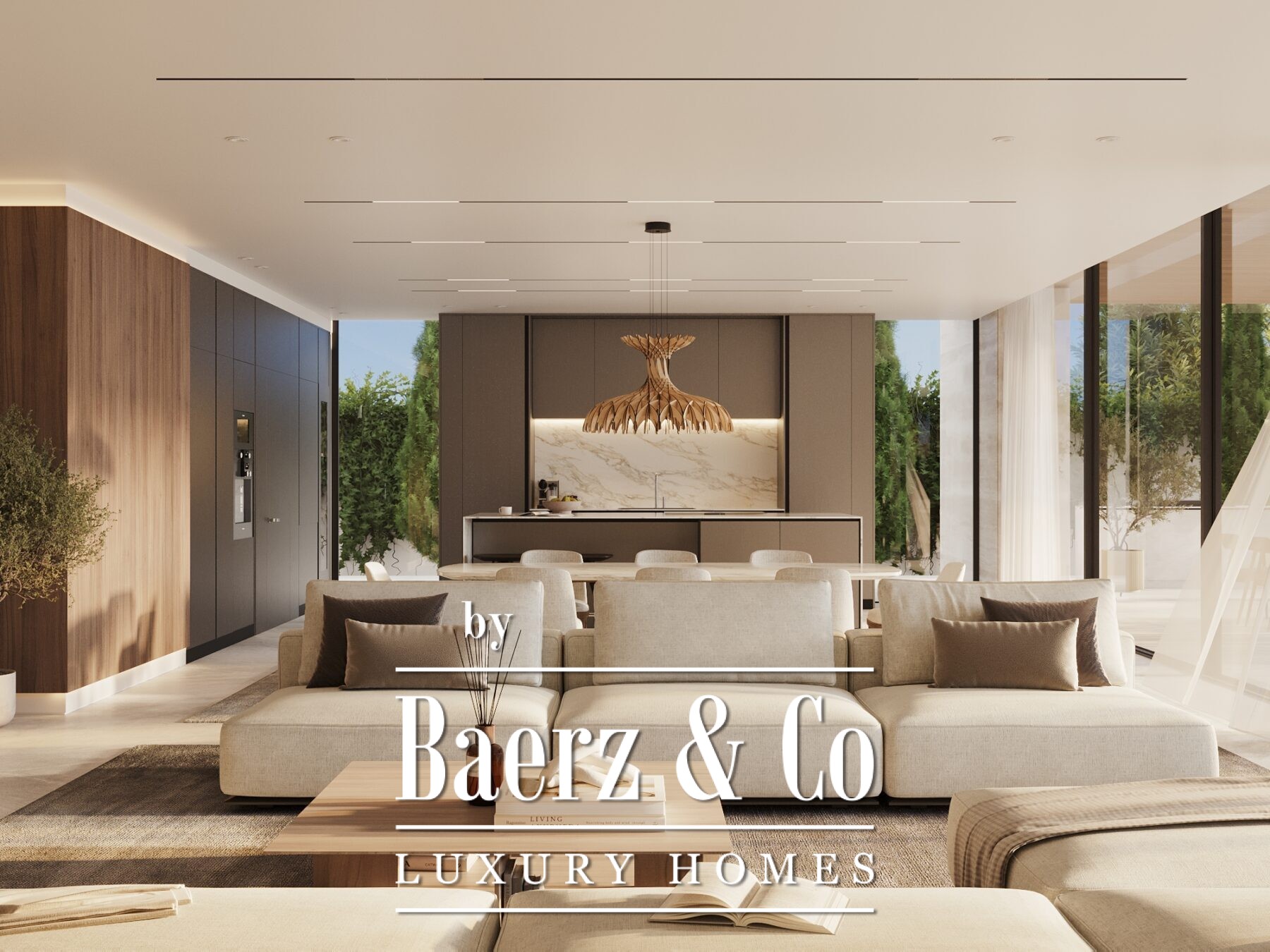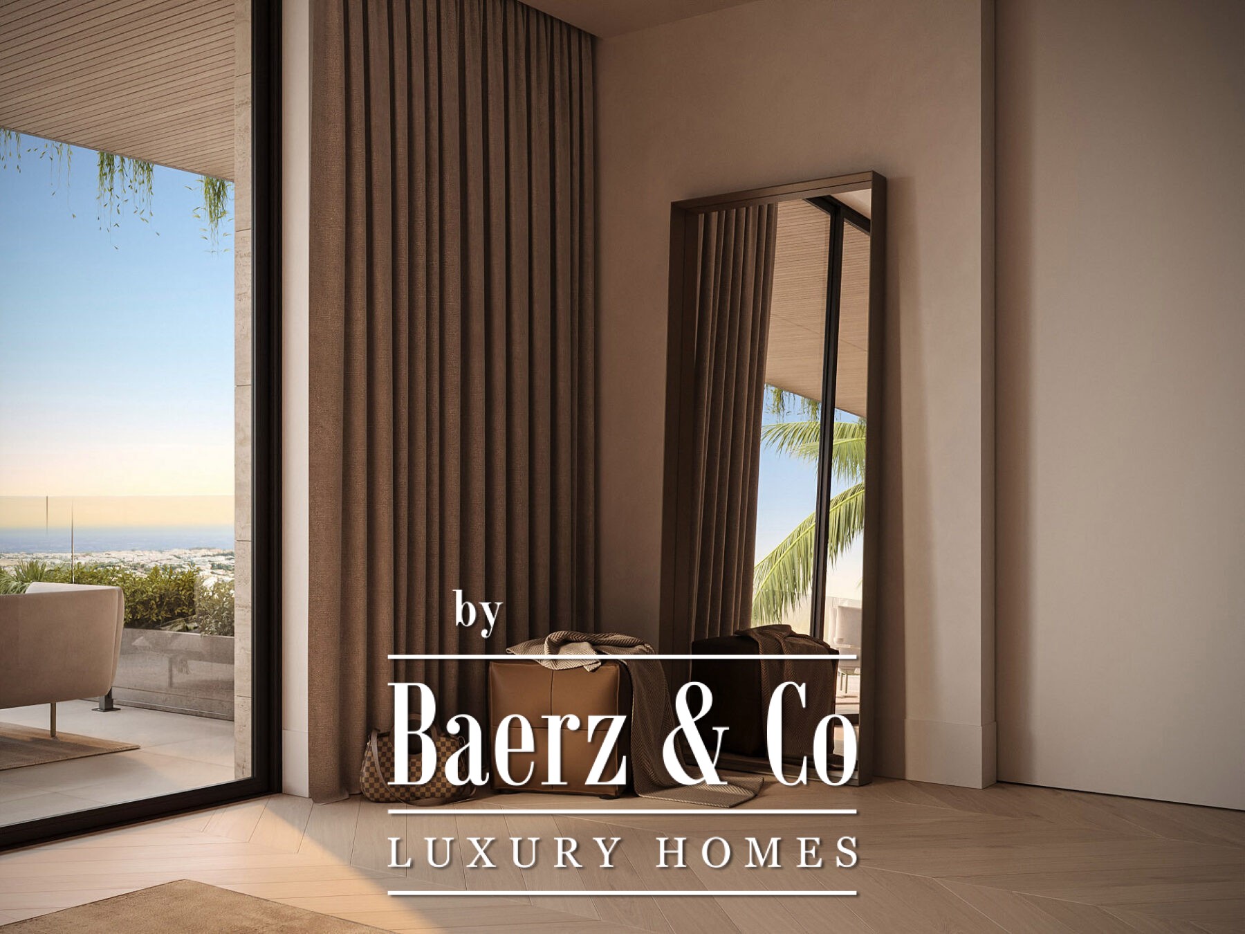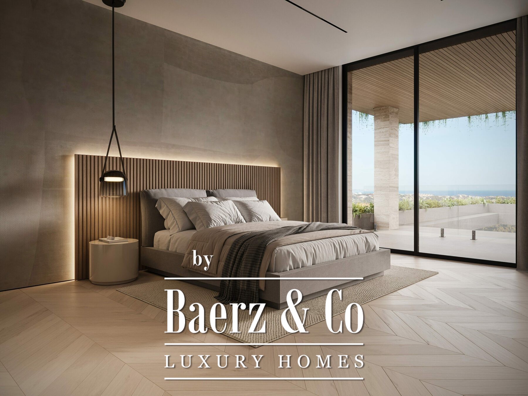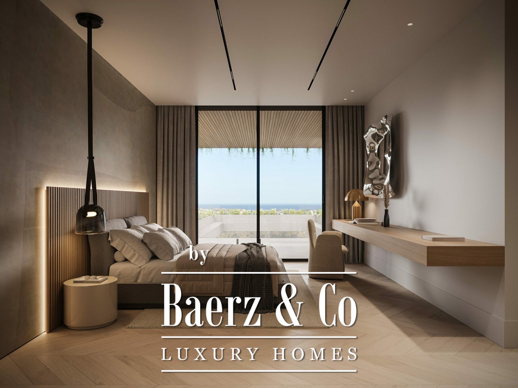 Homes within this enclave offer five or six bedrooms thoughtfully distributed across three levels, occupying up to approximately 850 m². The main floor is anchored by an open plan living area that transitions onto expansive terraces and a private pool, embracing the generous light and outdoor rhythm of Marbella. The upper level is dedicated to a principal suite and elegant family quarters, while the lower level is conceived for recreation, wellness, and storage, its design balancing aesthetic clarity with daily function.
