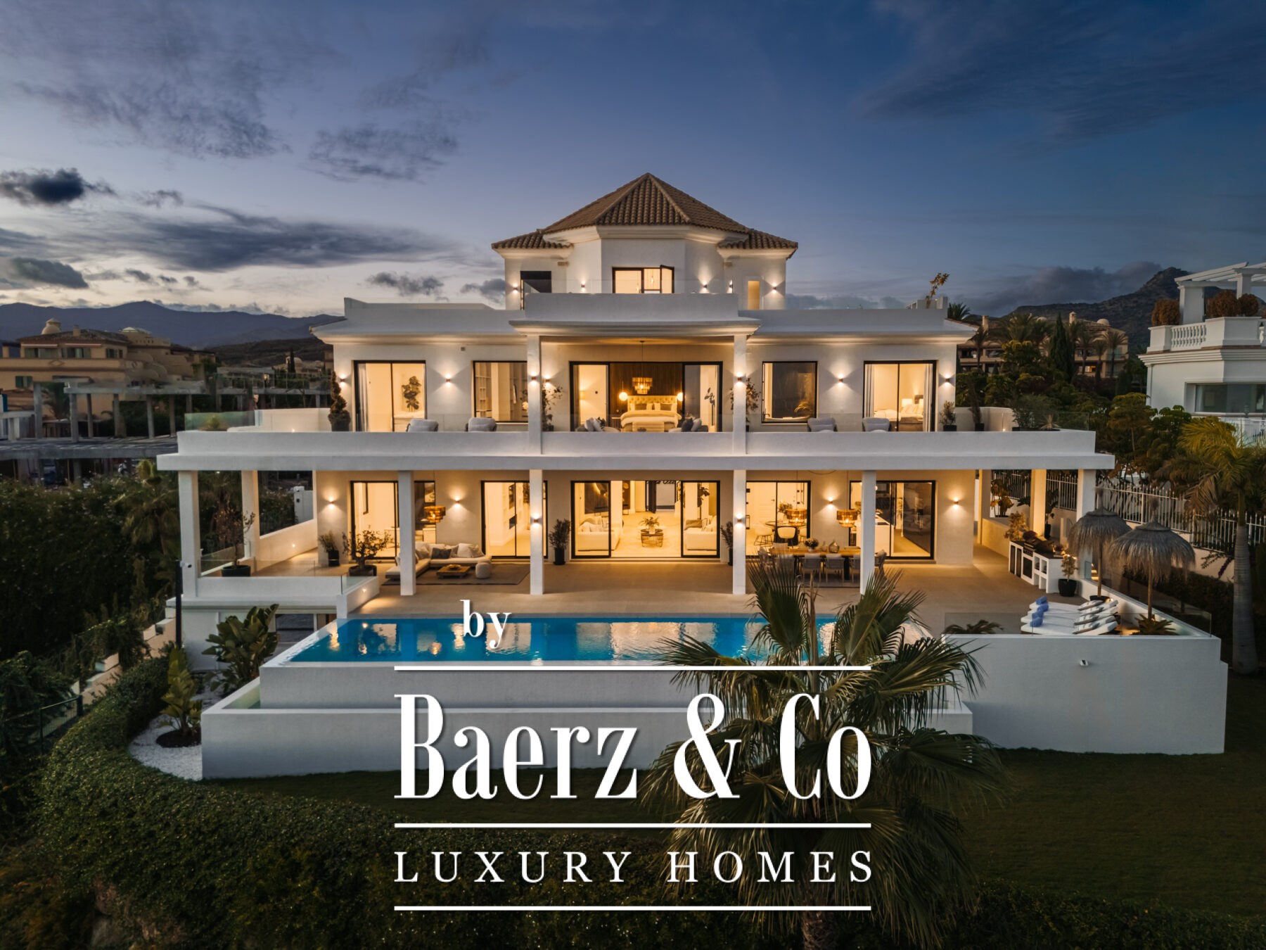Villa Marbella with panoramic sea and mountain views stands within the gated community of Los Flamingos, moments from the Villa Padierna Resort, exceptional golf courses, and select amenities. This villa in Marbella spans 1,076 m² on a 1,600 m² plot and is crafted for those who appreciate the precision of architecture and the discretion of secure living.