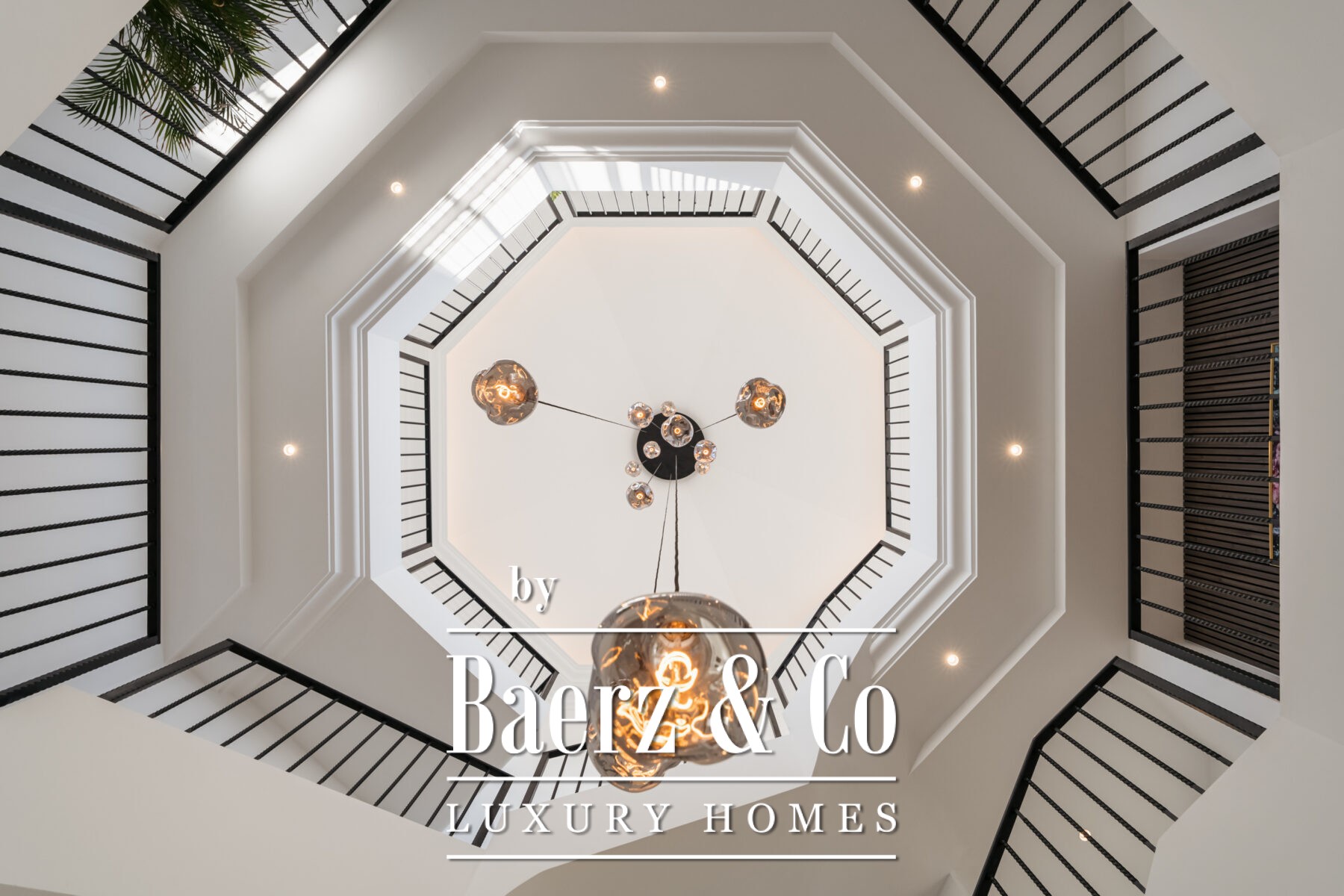 Arranged across four levels, the residence offers six bedrooms, seven bathrooms, and seamless access to refined spaces, all served by a private elevator. Upon entry, a spiral staircase and statement chandelier set a quietly grand tone, enhanced by natural light and the sensation of open sea vistas. The ground floor brings together a luminous open-plan living area, formal dining, a modern kitchen, pantry, dedicated office, en-suite guest room, and a versatile multi-use space. Sliding doors reveal a sun-washed terrace, outdoor kitchen, infinity pool, and spaces for both private reflection and effortless entertaining.