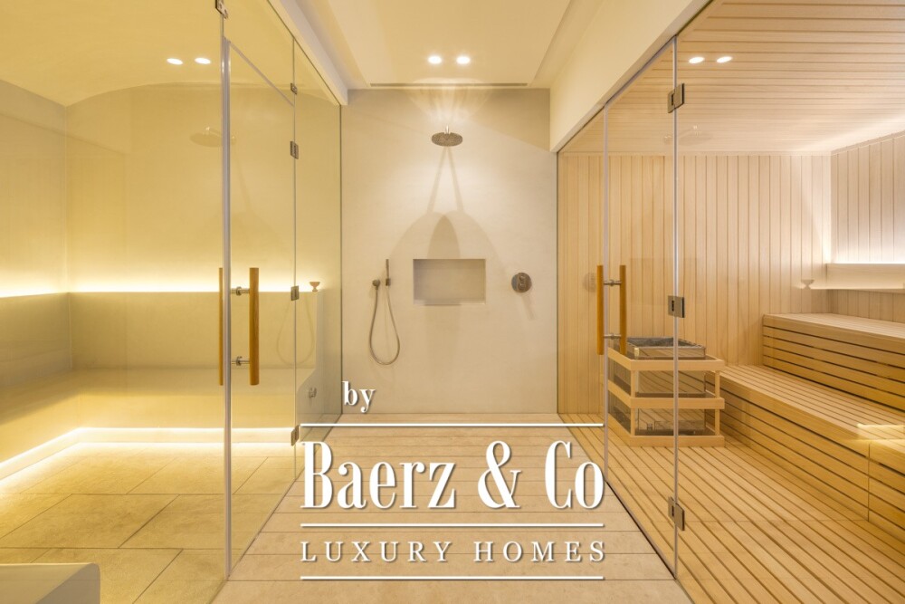 Six bedrooms and six bathrooms—including a principal suite with a walk-in wardrobe and en-suite—invite tranquil retreat. The ground floor flows seamlessly into open-plan living spaces, balancing neutral palettes with bursts of color to achieve understated sophistication. On the lower level, a gym, spa, Turkish bath, sauna, wine bodega, and an entertainment suite with a home cinema, billiard and poker tables anticipate every mood and gathering.