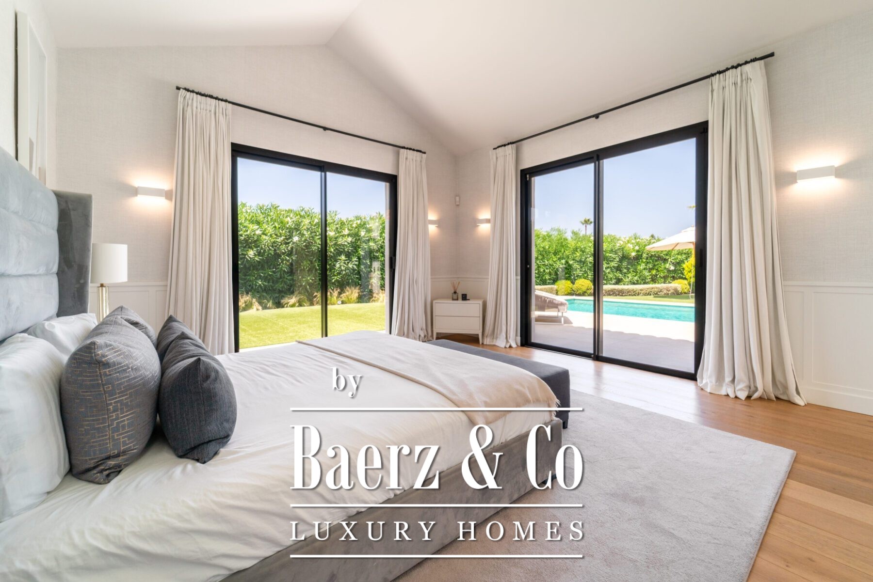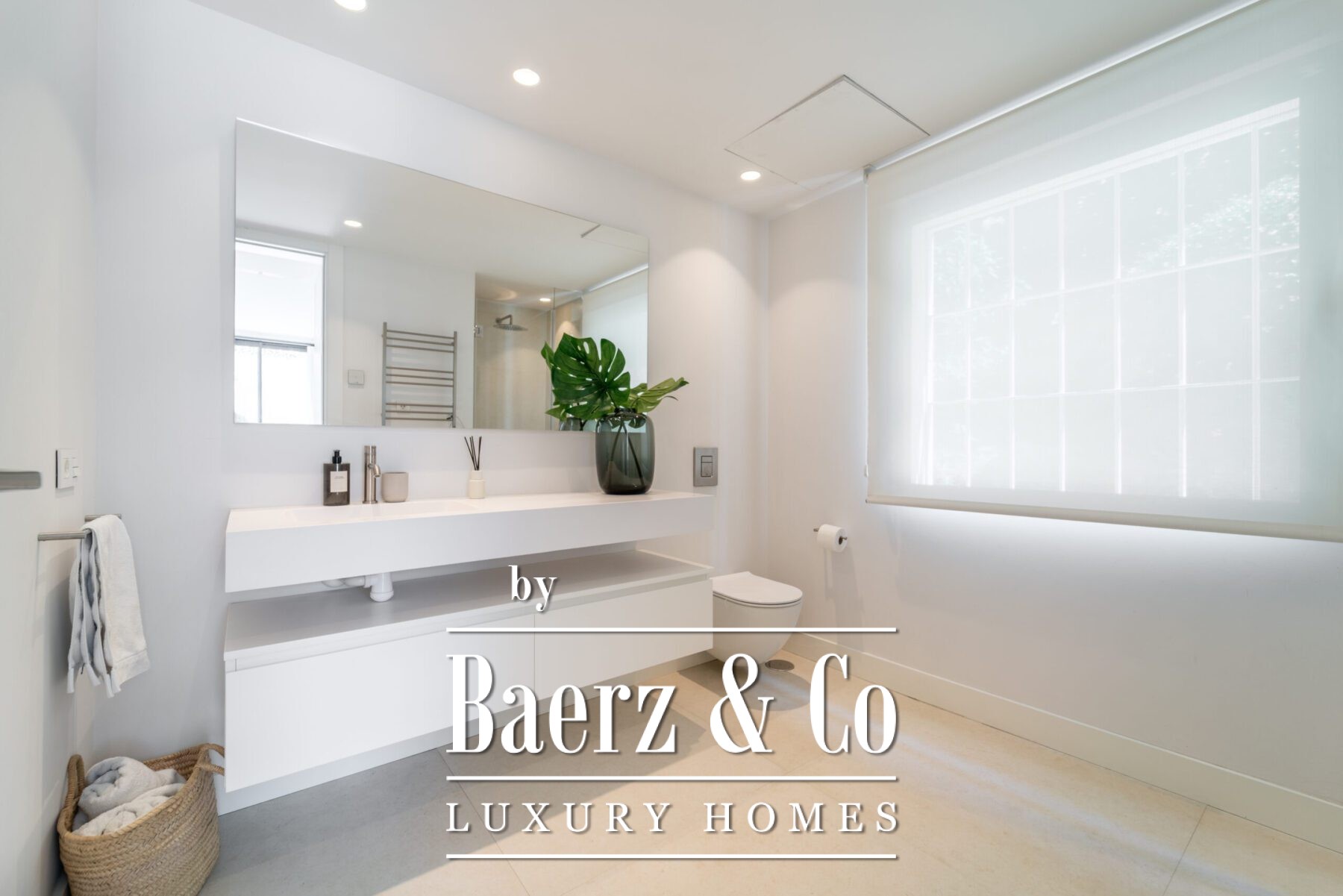 The villa welcomes you into a gorgeous courtyard, with the main feature being a large sculped olive tree, and landscaped entrance, with the back drop of large floor to ceiling colonial style black matte windows, allowing the outside to feel inside. Here at the entrance you find the closed Garage space for convenient parking, with then only 12 steps down into the property. As you enter the property you are greeted with a light and spacious hallway which leads you to a bright open plan living area with modern fireplace. The living room is connected to a spacious dining area which sits 8 guests and onto the modern sleek kitchen and breakfast bar, and off this area a large separate utility room . With a double height pitched ceiling in the main living space, the property feels inviting, homely and spacious. Internally the property has underfloor heating throughout, Airzone zonal A/C, and built in Sonos speaker systems. The property has been designed to create as much light and utilise its orientation as possible, and to create a real indoor-outdoor living experience. The villa has been perfectly distributed to offer large bedroom, wardrobe and en-suite bathroom space, in each of the rooms, tastefully done with the use of Casamance wallpaper and wooden flooring and modern sleek bathrooms. The master bedroom is especially well executed with its double height pitched ceilings and two double terrace doors, leading out into the garden and pool area which offers bright, green views.