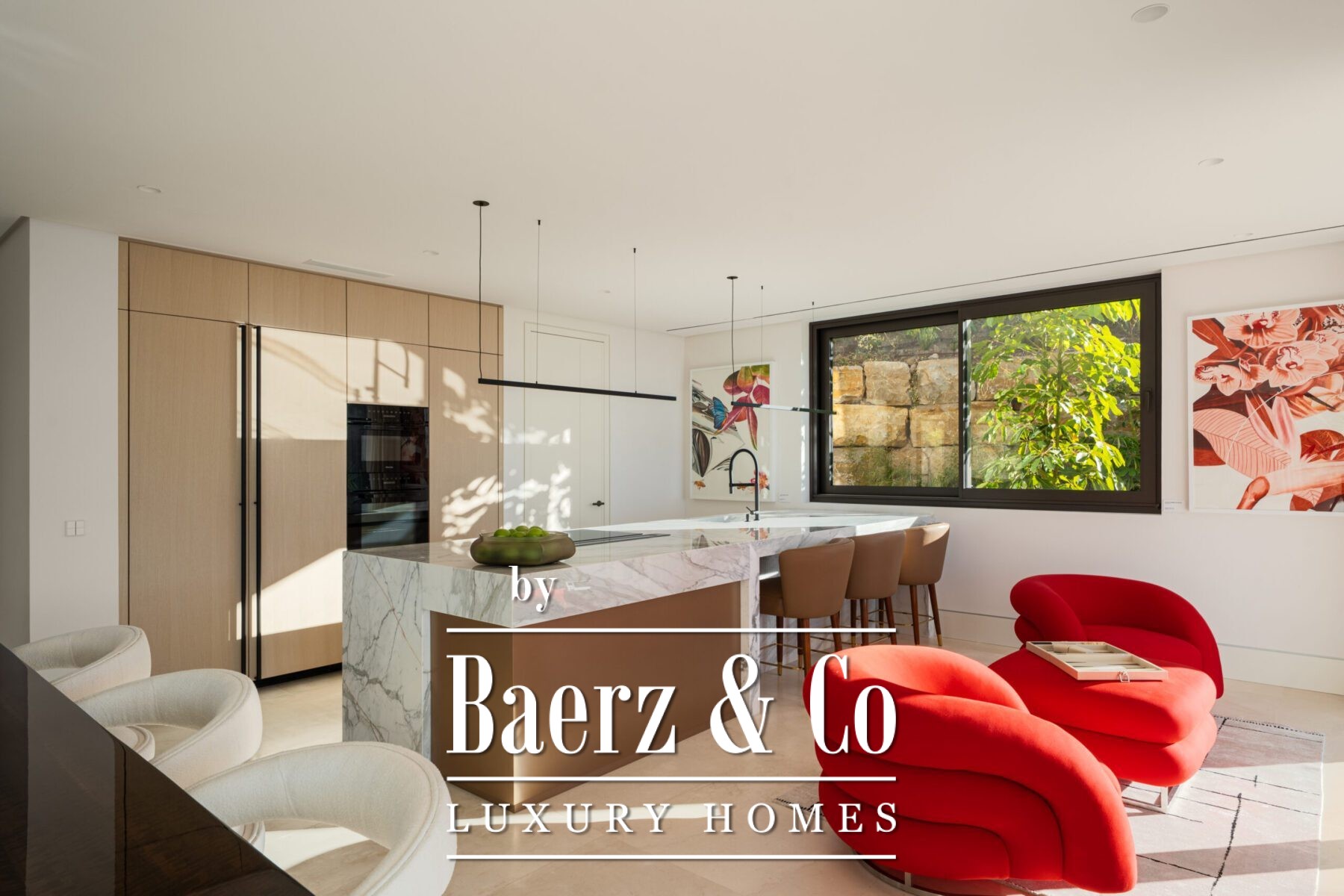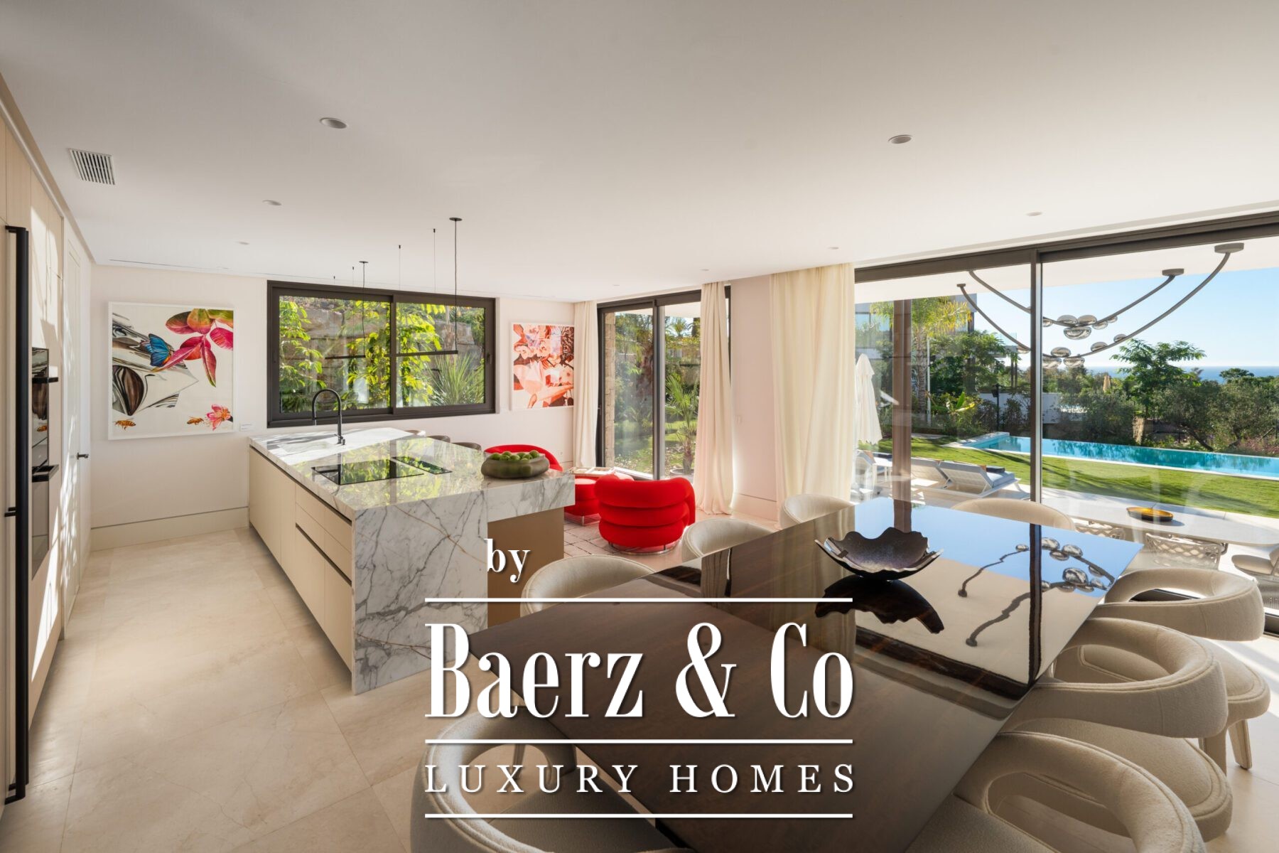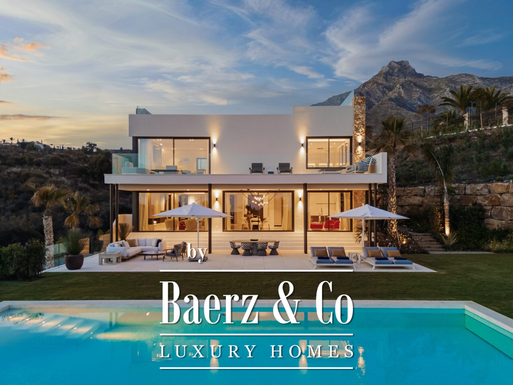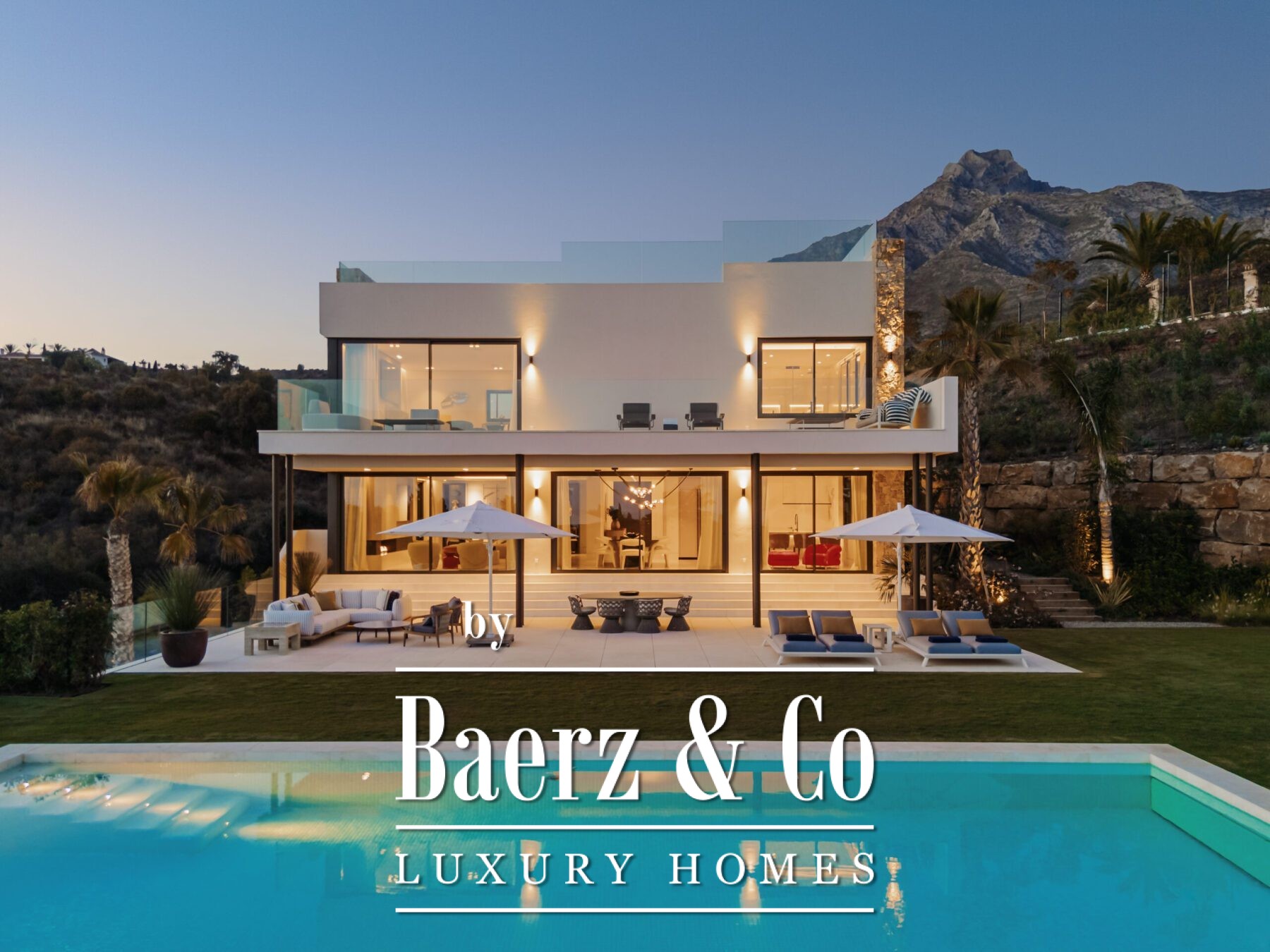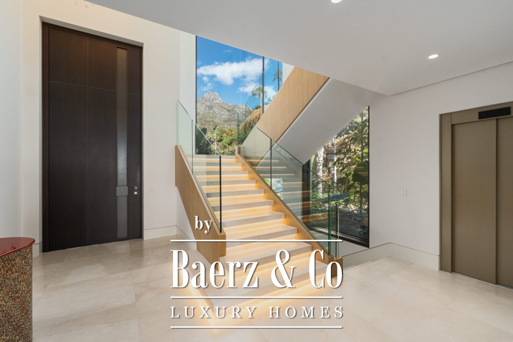 Villa Marbella Hill Club with sea and mountain views is an invitation to refined living on the edge of Marbella's Golden Mile. This newly constructed villa spans 825 m² across a generous 3,559 m² plot, shaping an atmosphere of both composure and quiet opulence. The interiors are tailored to this individual property, with a calm neutral palette and natural materials like wood and marble imparting a harmonious sense of luxury.