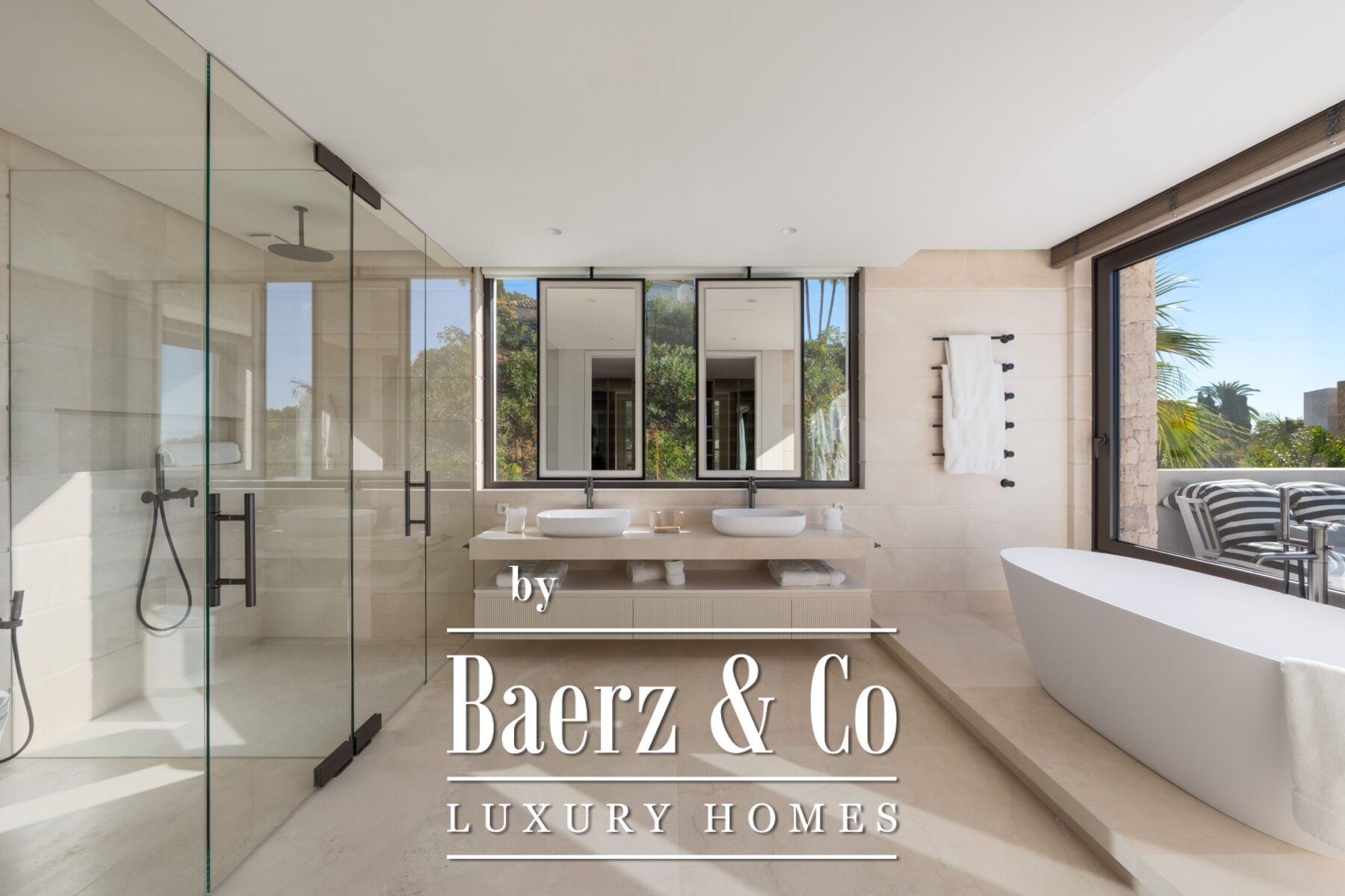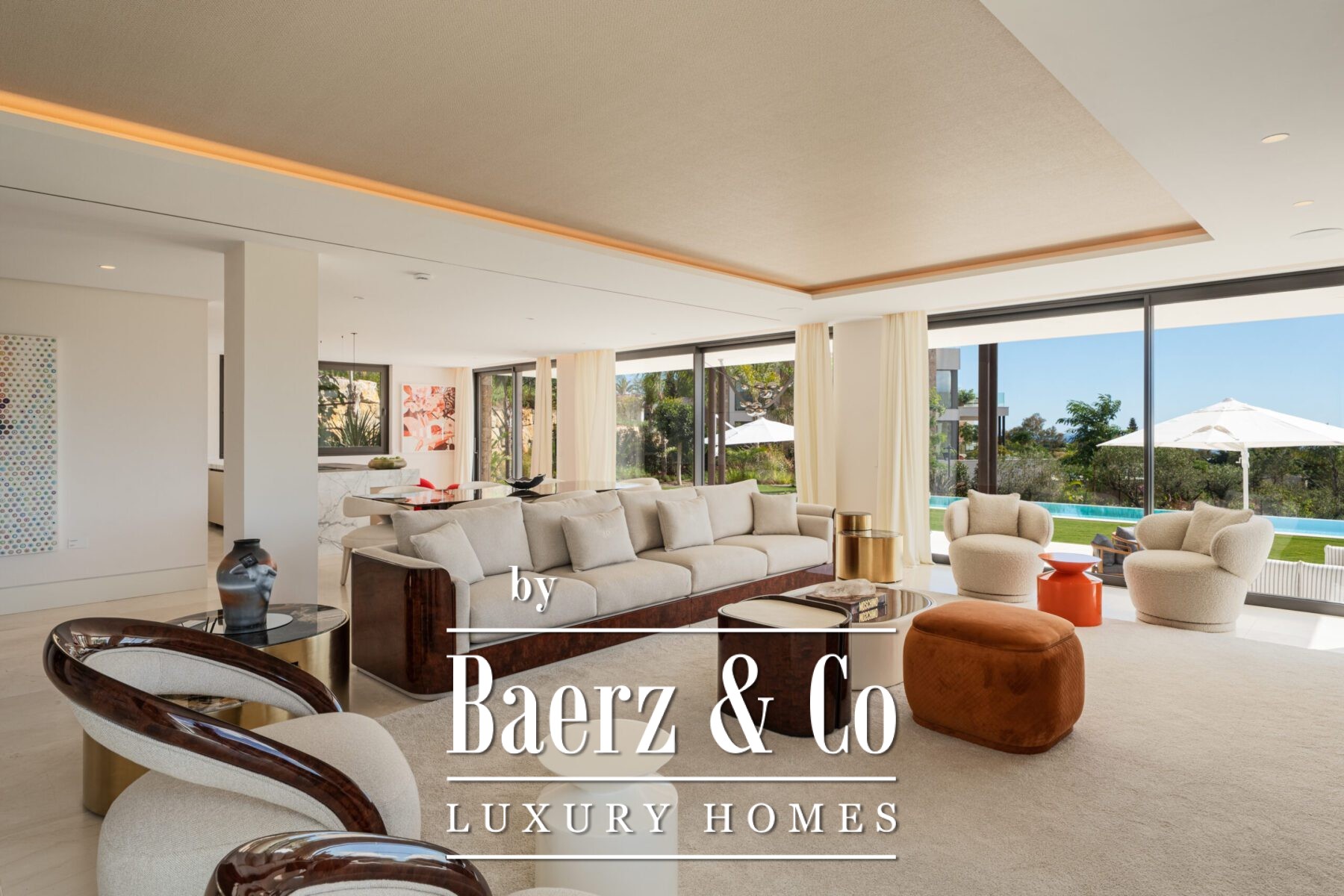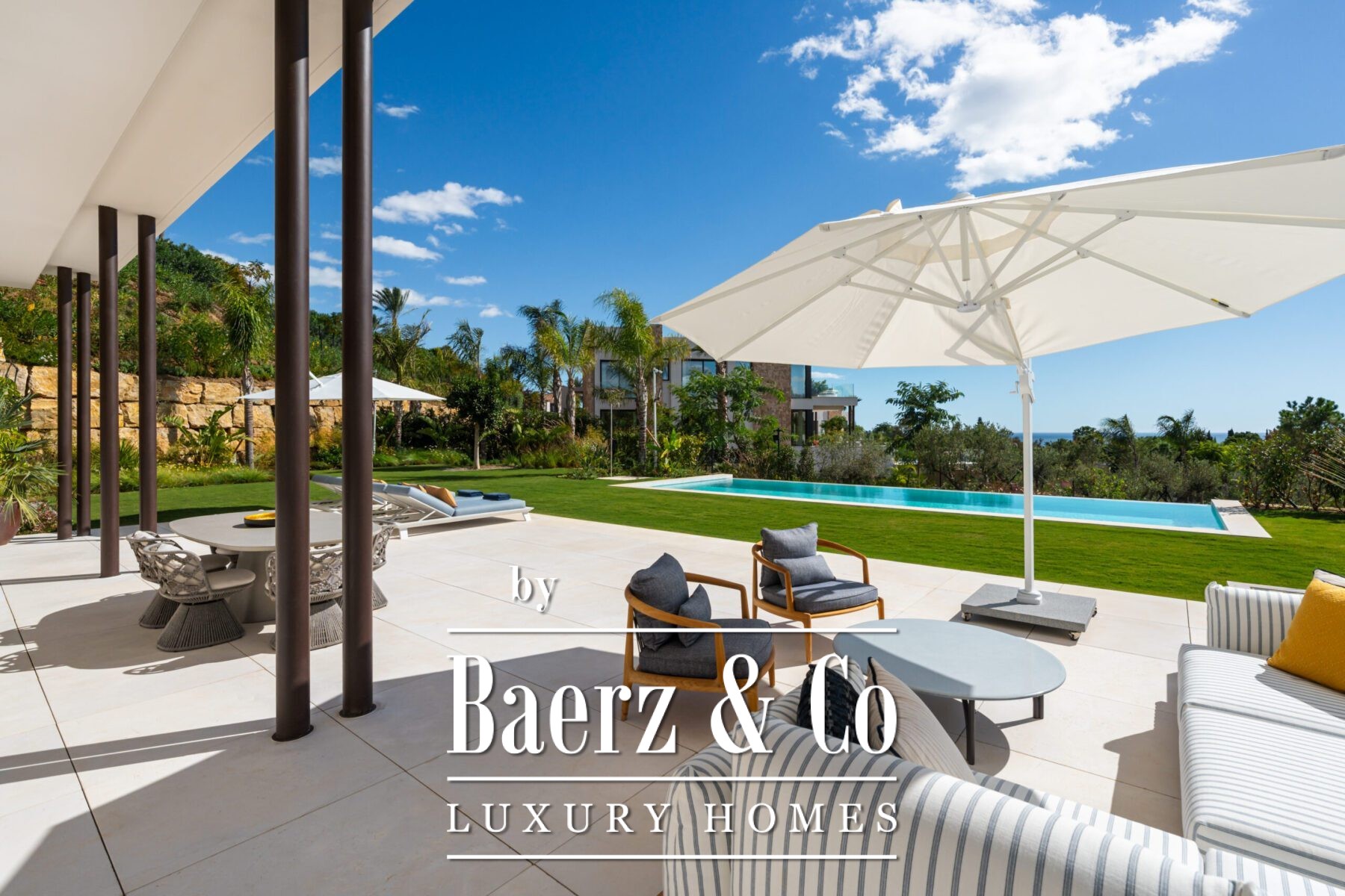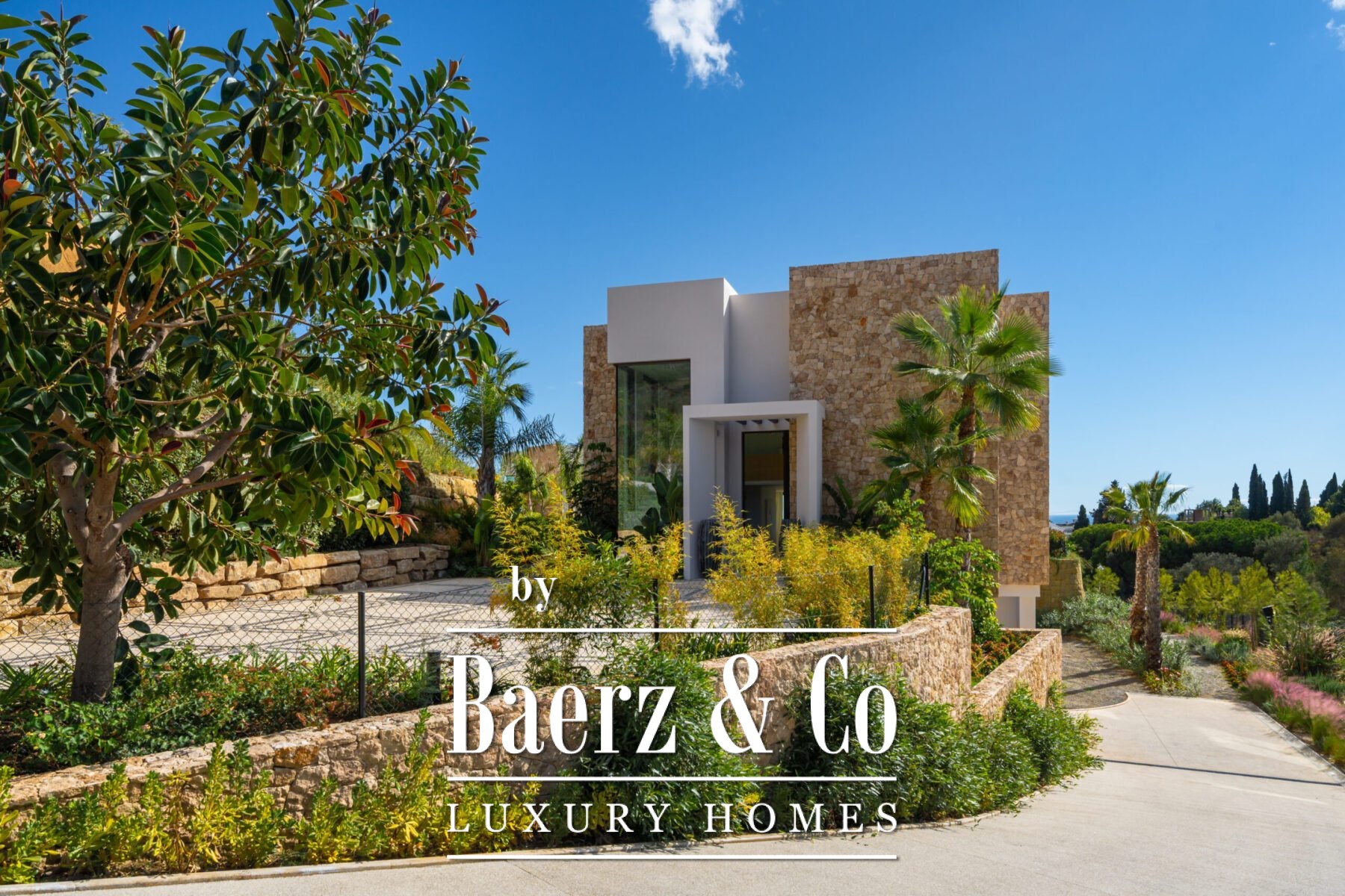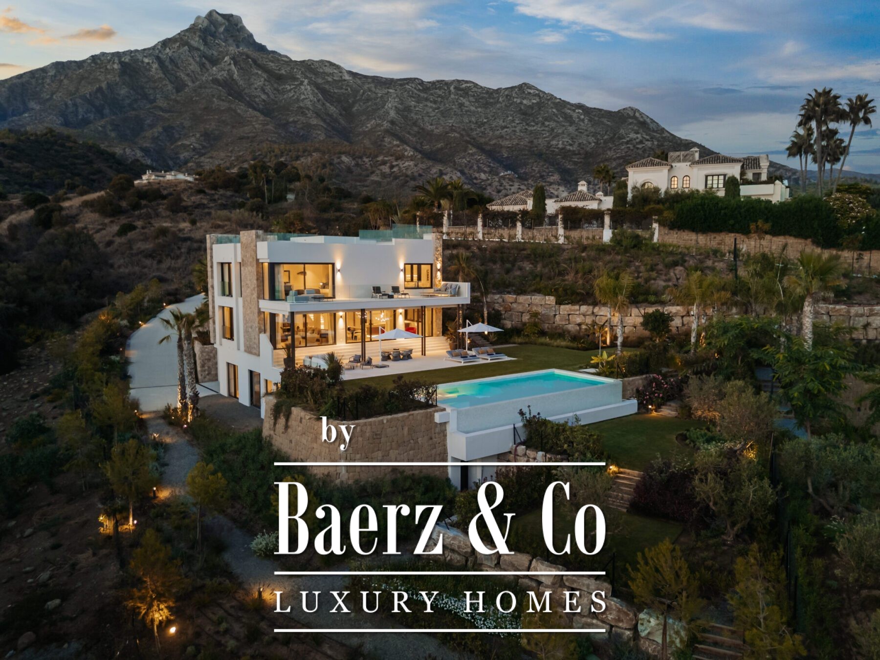 Villa Marbella Hill Club with sea and mountain views is an invitation to refined living on the edge of Marbella's Golden Mile. This newly constructed villa spans 825 m² across a generous 3,559 m² plot, shaping an atmosphere of both composure and quiet opulence. The interiors are tailored to this individual property, with a calm neutral palette and natural materials like wood and marble imparting a harmonious sense of luxury.