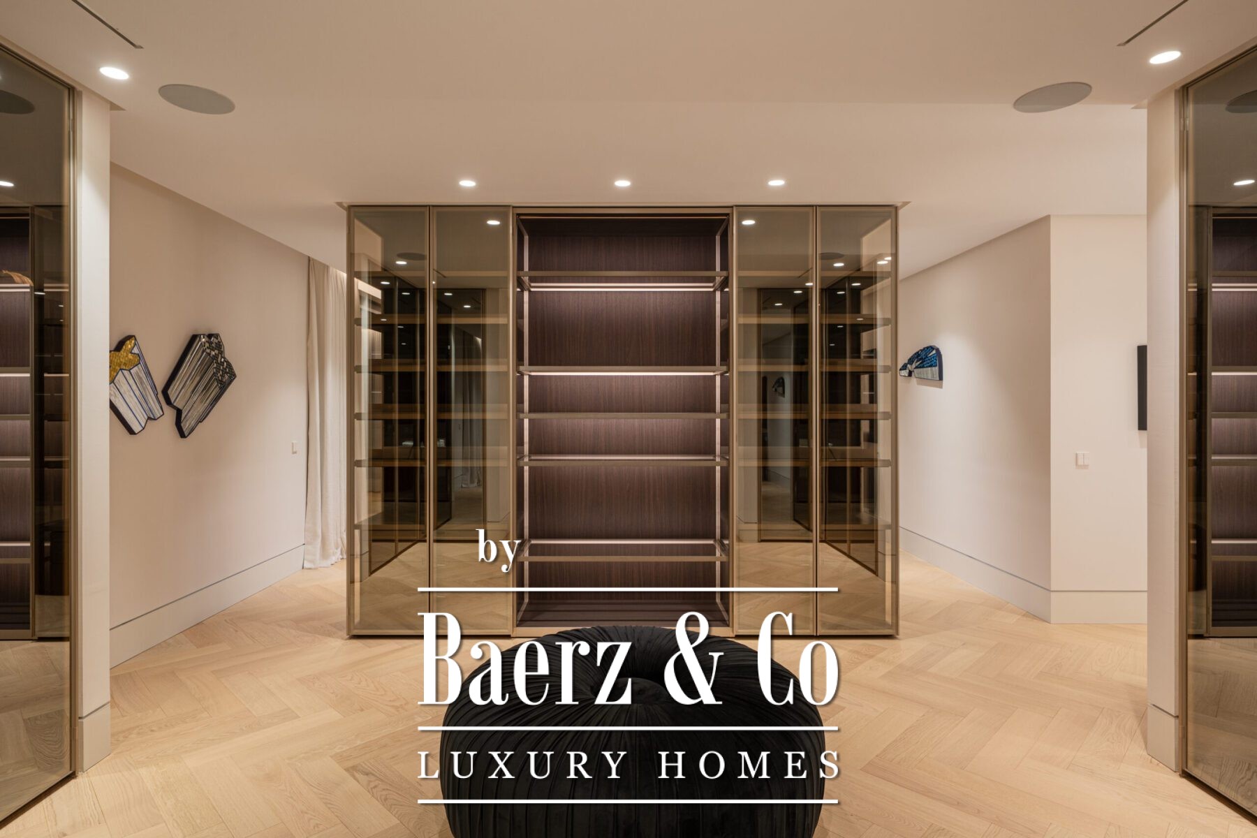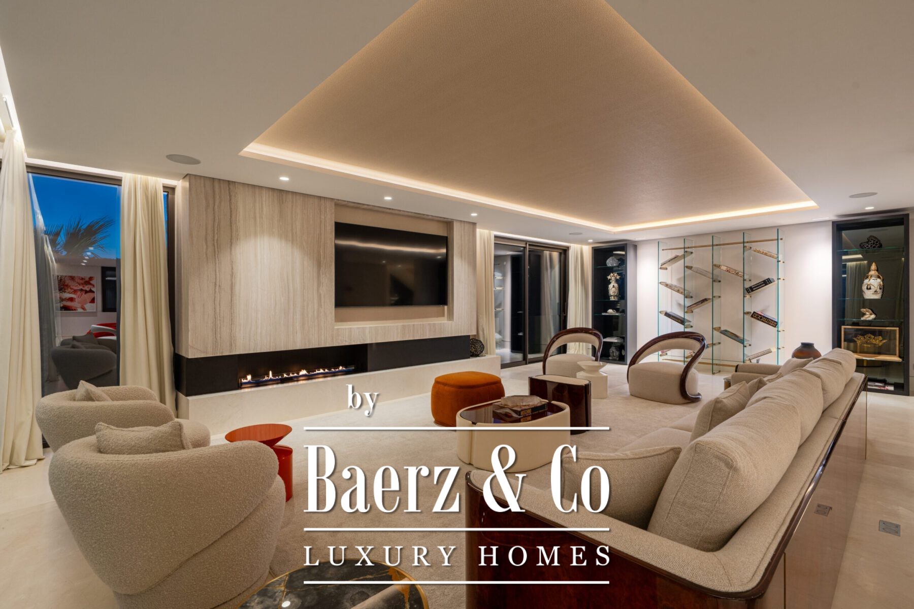 The open plan living area maintains cohesion and spatial clarity, letting natural light move unobstructed. Finer details and considered artwork provide every corner with a sense of distinction, while the kitchen, fitted with state-of-the-art appliances and a wine cooler, serves both daily ritual and social gathering. Five bedrooms and six bathrooms unfold with subtle grandeur, featuring double vanities, custom showers, and stand-alone bathtubs.