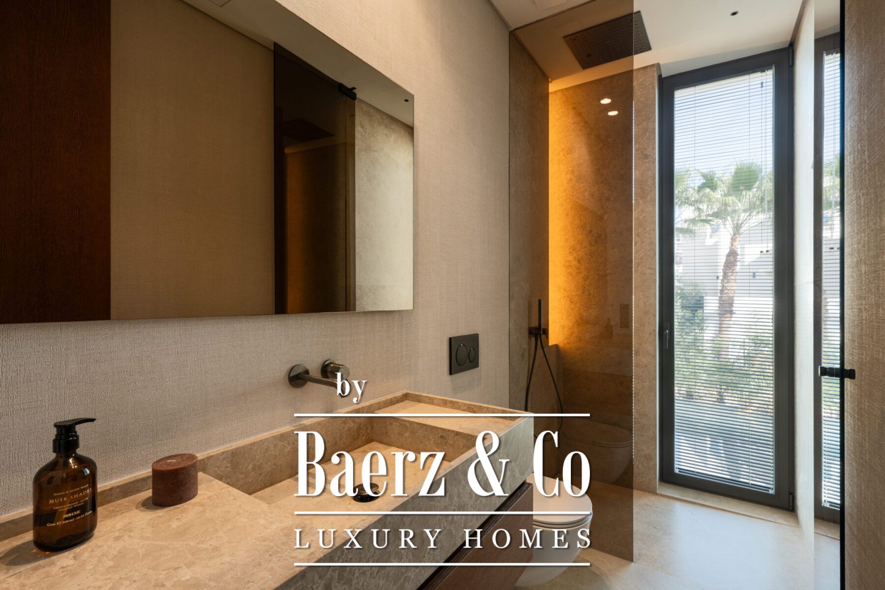 Wellness and recreation unfold on the lower level, where a custom entertainment room, bar, private gym, spa with indoor pool, and sauna complete the experience. Secure garage parking with an electric charging port further elevates the sense of ease. This frontline golf villa Marbella stands as a benchmark for understated luxury, design, and privacy on the Costa del Sol.