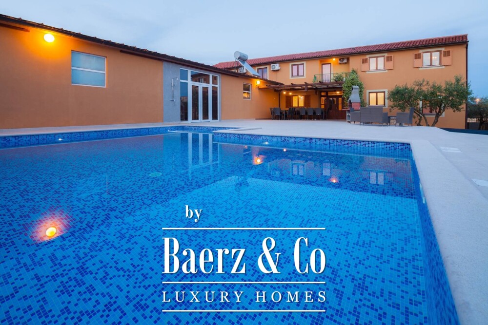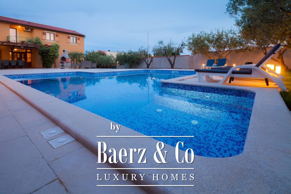 Amenities include a four-car garage, games room, central gas heating, nine air conditioners, and a fully furnished interior. The sea lies just 800 meters away, while essential shops, markets, and restaurants are within immediate reach. This property presents a compelling balance between serene living and robust rental potential in one of Croatia’s most accessible coastal settings.