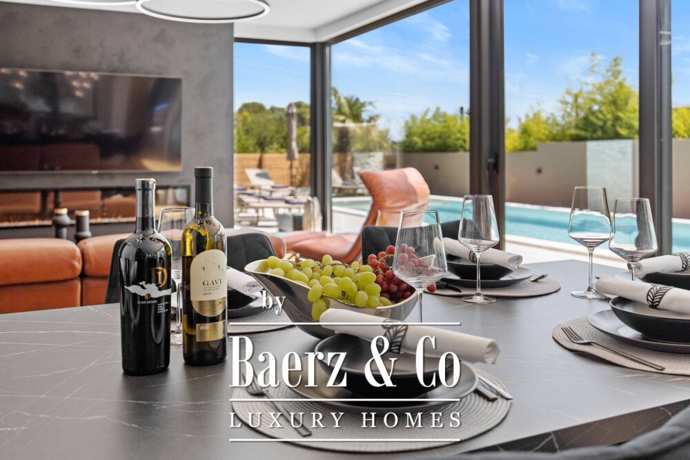 Villa Medulin stands as an example of contemporary design on Croatia’s Adriatic coast. This property, with 220 m² of living space, is set in a tranquil pocket of Medulin, occupying a 500 m² plot where garden and architecture create a measured retreat. The villa’s thoughtful layout spans two levels, with the ground floor featuring a luminous living area anchored by an electric fireplace and an expansive aluminum sliding wall opening directly onto the 40 m² pool. This pool, designed for use throughout the seasons, becomes the heart of indoor-outdoor living.
