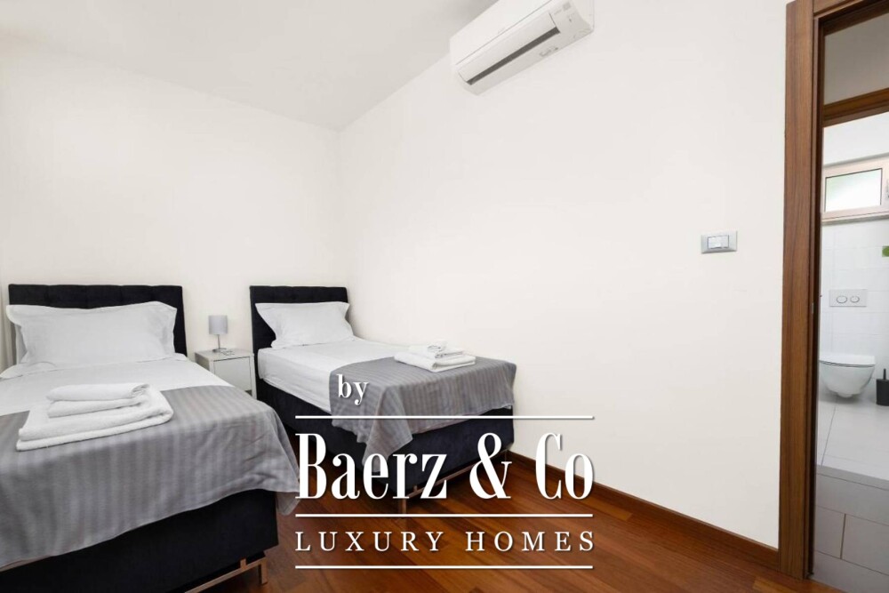 The layout encompasses four bedrooms and four bathrooms, each featuring refined Italian ceramic finishes across two well-organized levels. Air conditioning and central heating assure comfort throughout the seasons. On the lower floor, amenities include a dedicated laundry space, additional bathroom, and an entertainment area.