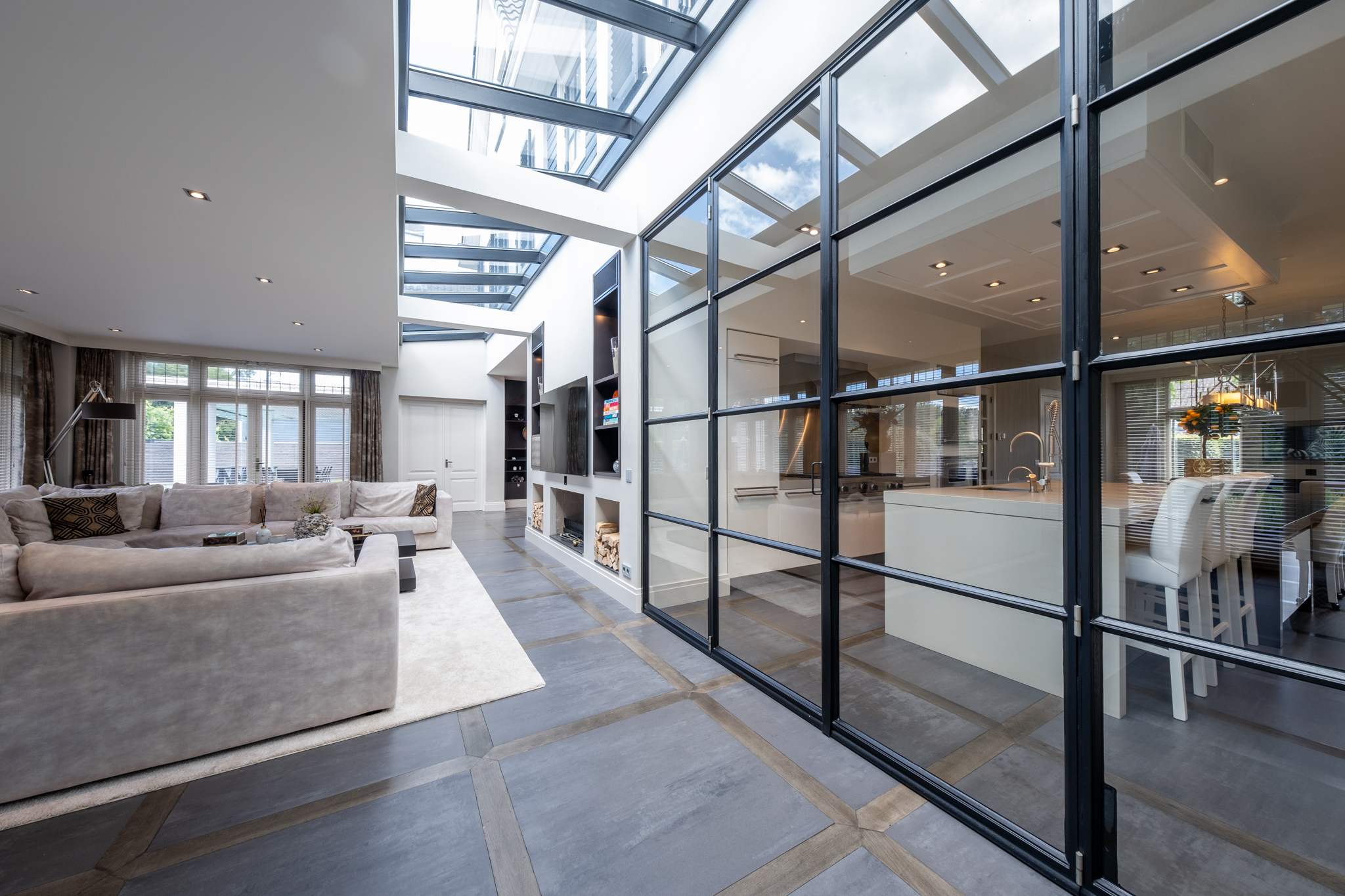 From the moment you enter, the grandeur is evident: a spacious hall with a stately staircase, an inviting L-shaped living room with glass ceiling panels, and a cozy work corner. The Eggersman designer kitchen is a true showpiece, equipped with a large cooking island, Viking appliances, and a stylish gas fireplace. A floor-to-ceiling steel façade visually connects the kitchen to the living room, while still providing the luxury of a separate space. Additional features include a basement, double indoor garage, and a multifunctional wing – ideal as a guesthouse, office, or au-pair apartment.