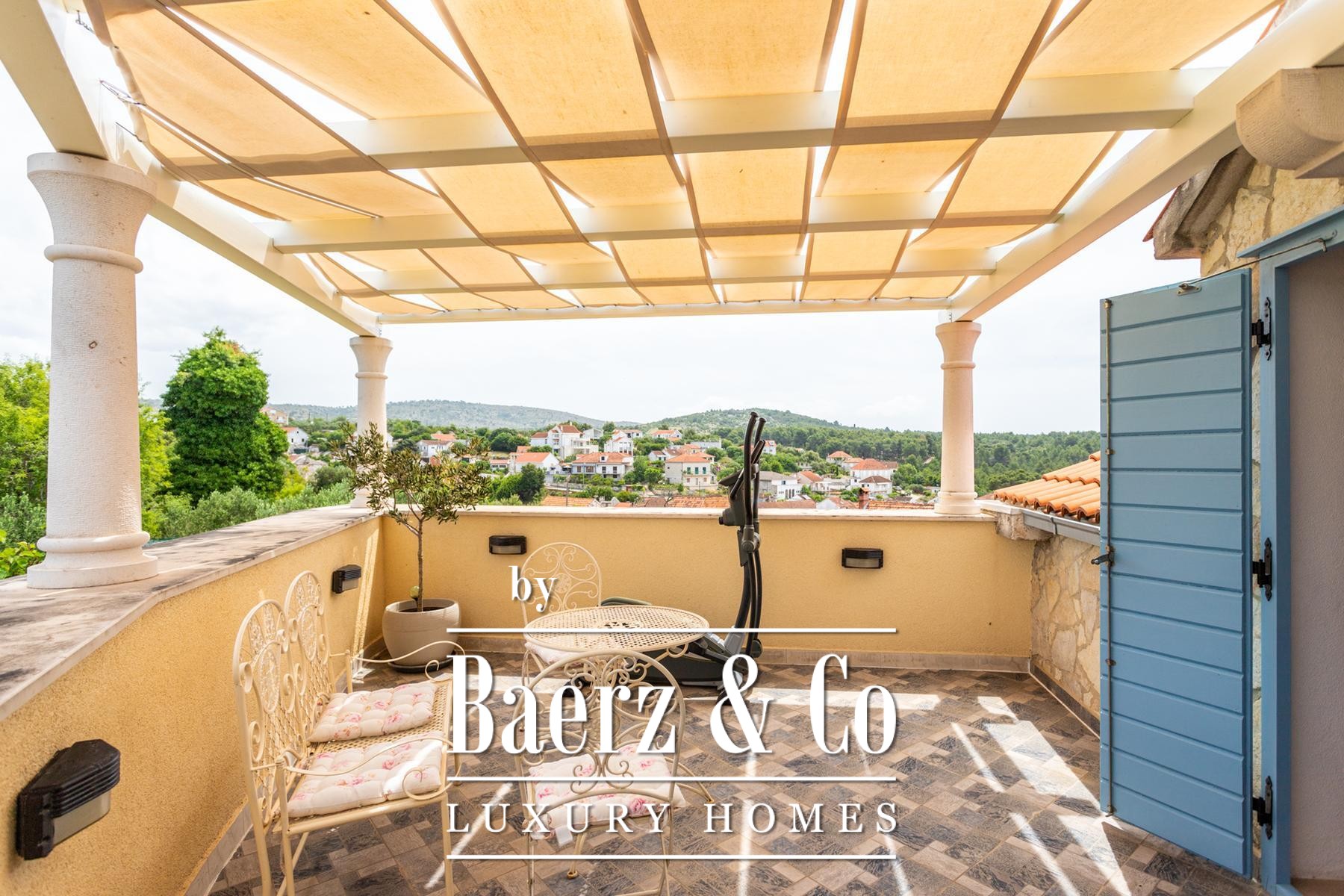 Outdoors, the 579 m² plot is shaped for Mediterranean leisure, with a lounge, pool, sun area, barbecue, and children's playground all framed by native Dalmatian flora. This property, blending original materials with modern comfort, is discreetly tucked within a storied village, ideal for those seeking a villa for sale in Milna that truly honours place and provenance.