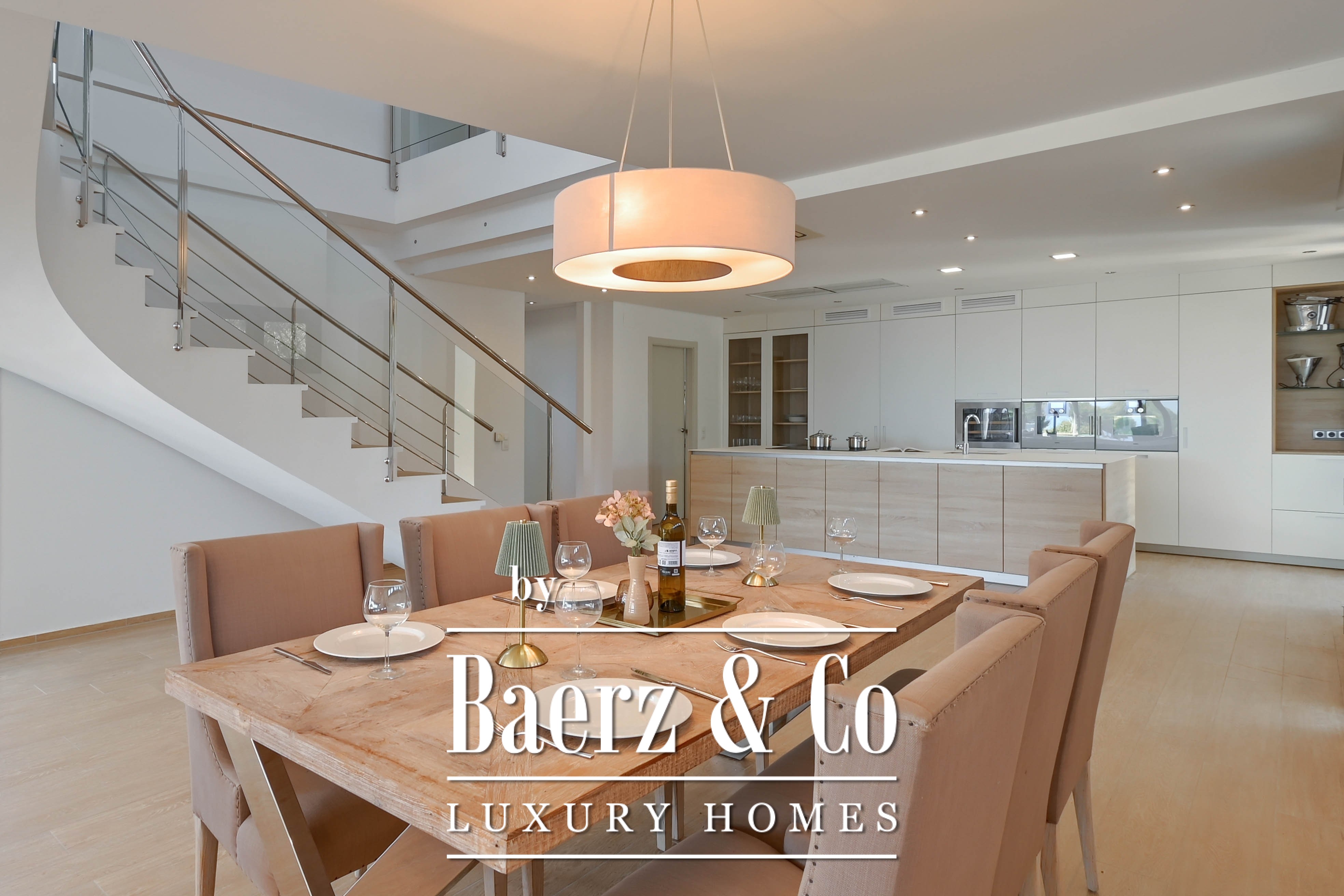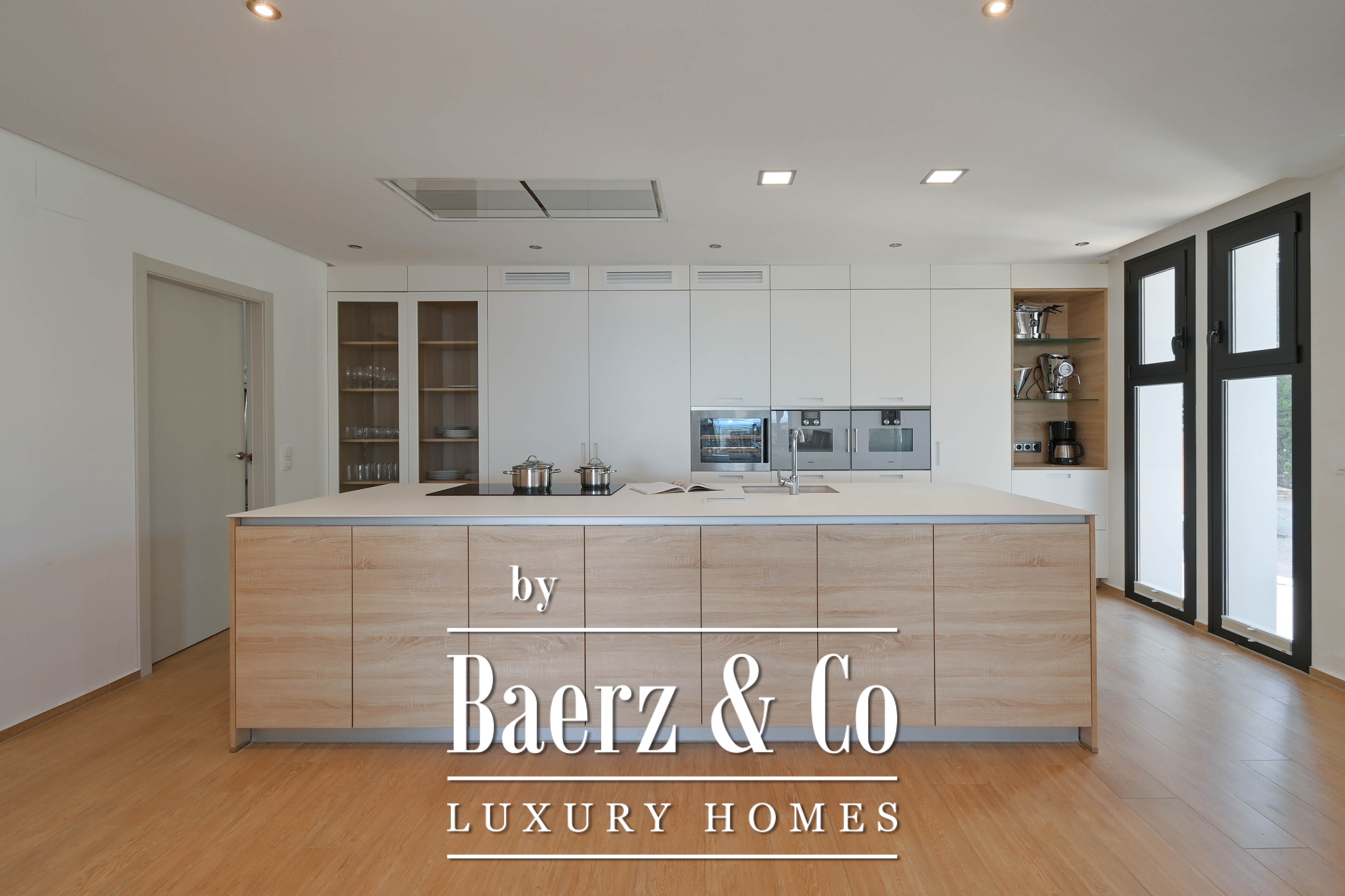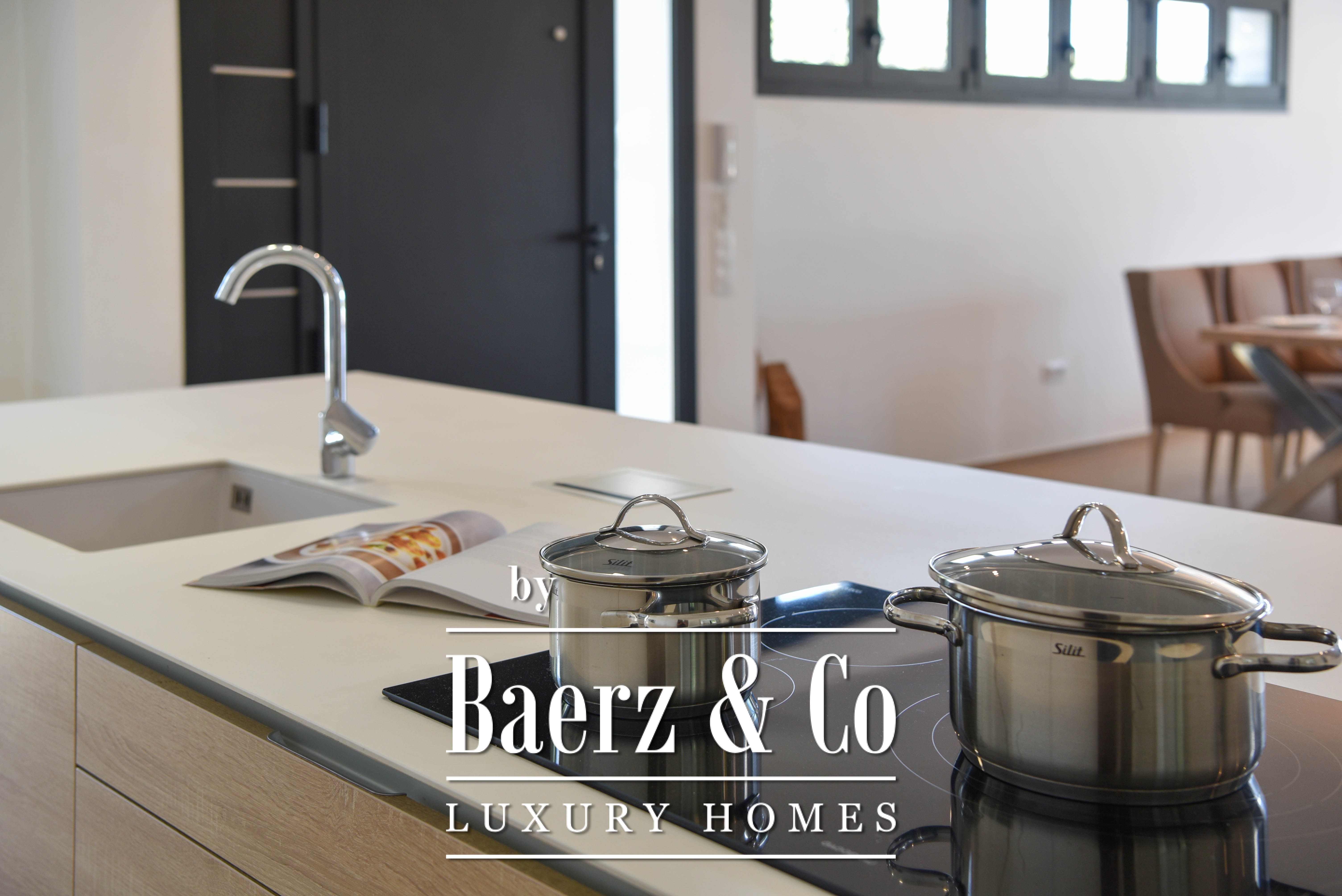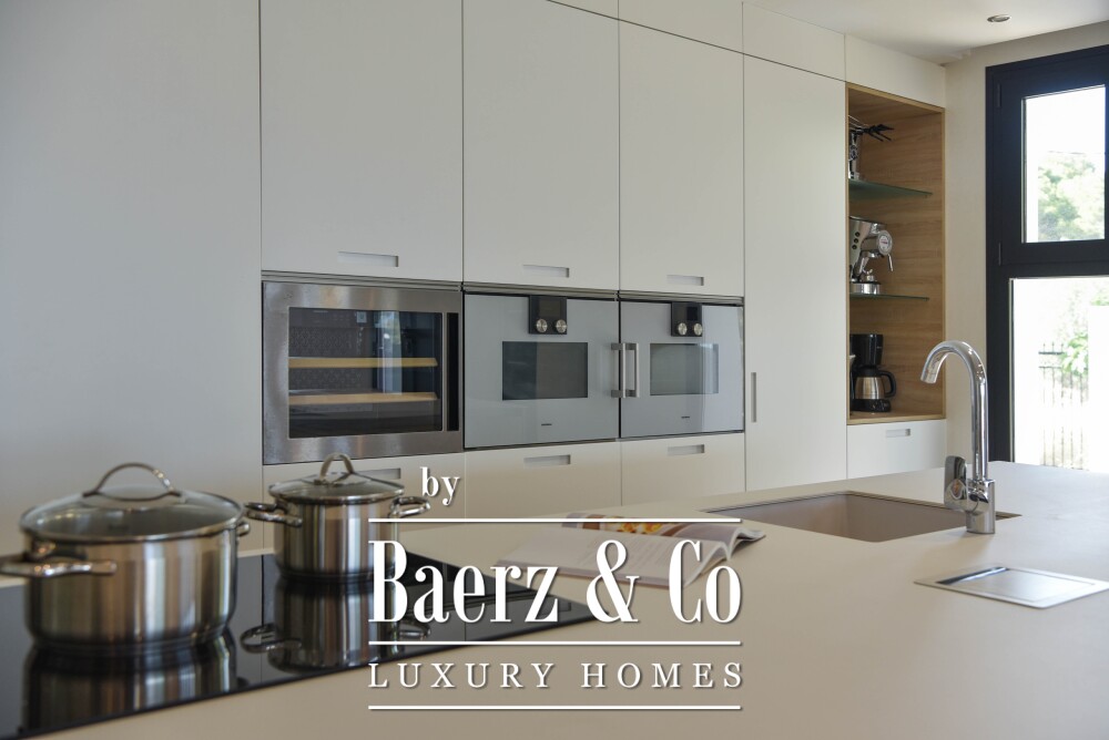 The villa features an open kitchen that flows seamlessly into the bright living area. Large windows create a natural connection between indoors and outdoors, allowing the Mediterranean light to flood in generously.