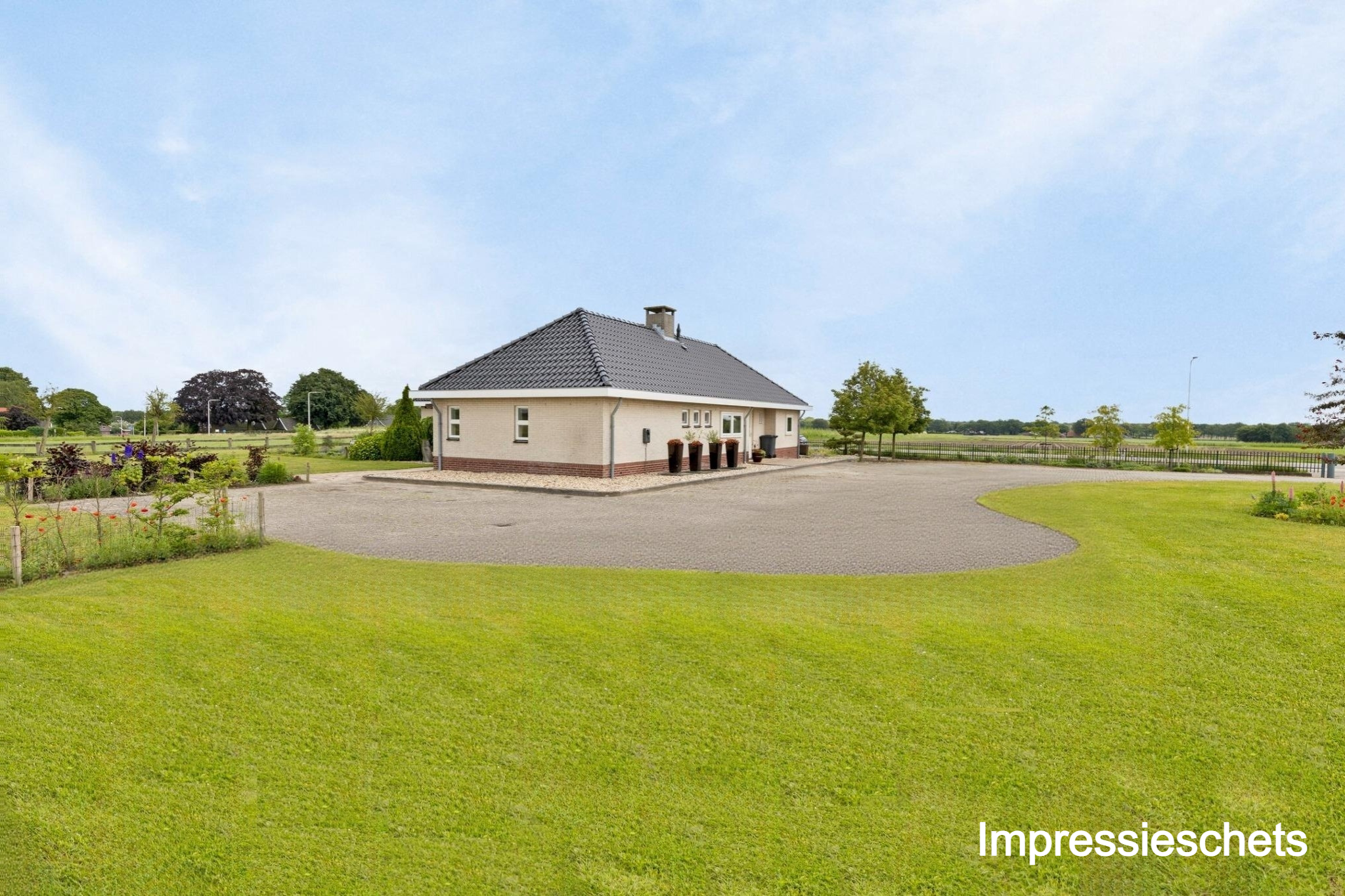 ... for there lies an impressive 1.2ha waiting for you. At the front, the plot is accessed by an electric gate, allowing you to drive straight into the garage. Surface parking is also possible, because the driveway has room for at least eight cars. There is also a charging station, so you always drive away with a full battery.