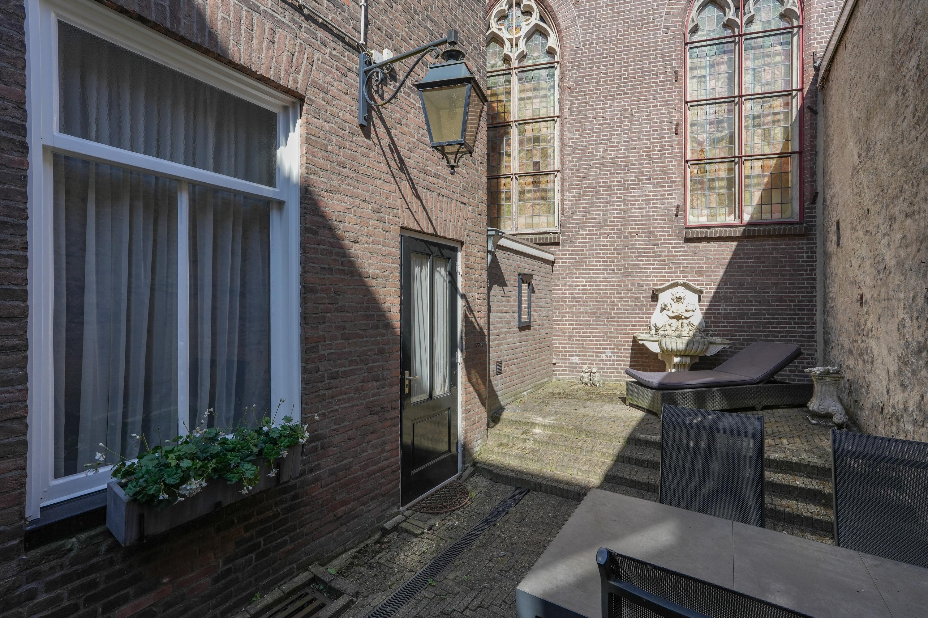 Naast een royale voortuin beschikt de woning over een balkon, loggia, dakterras én een stadstuin met veel privacy die grenst aan een voormalige kerk. De woning heeft vier woonlagen en elke verdieping is voorzien van een keuken, sanitair en een buitenruimte.