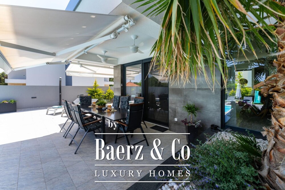 The upper level offers three additional bedrooms, each with its own bathroom and access to open terraces, allowing for a gentle dialogue between indoor comfort and outdoor space. The property frames refined Croatian light through expansive windows, while the garden, complete with automatic irrigation, is home to a heated swimming pool, sun deck, and an outdoor dining area—designed for both quiet mornings and convivial evenings.