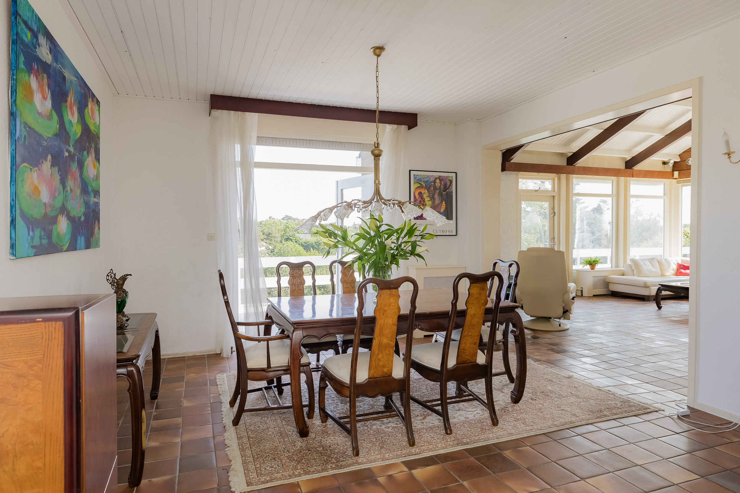 The villa offers a spacious living room with large windows, allowing natural light to flood in abundantly. From the living and dining room you have direct access to a large and sunny terrace, complete with an attractive outdoor fireplace - perfect for long summer evenings or cozy winter moments outside.