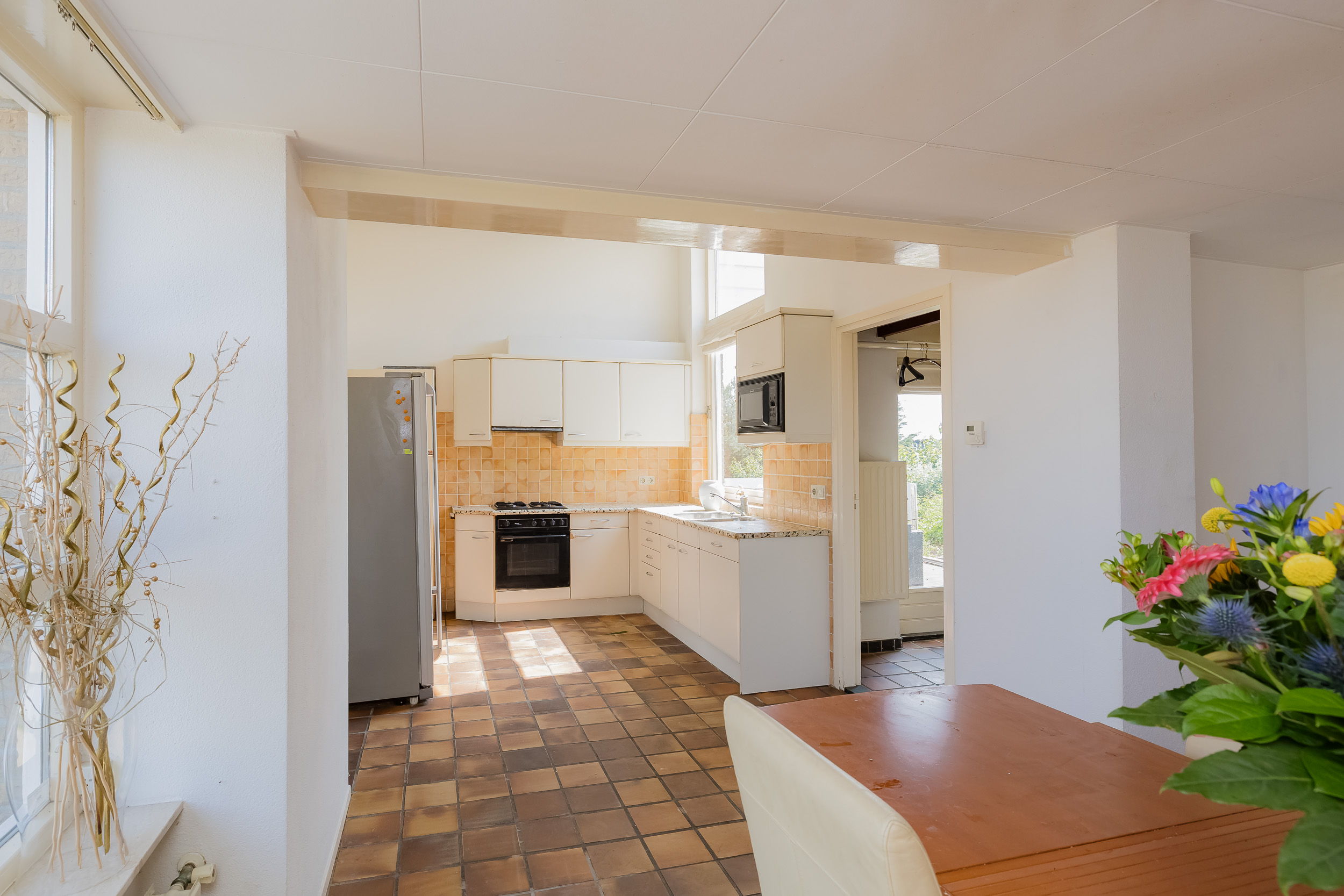 The spacious eat-in kitchen has room for a generous dining table for cozy dinners. Behind the kitchen is a utility room with access to an indoor storage room.