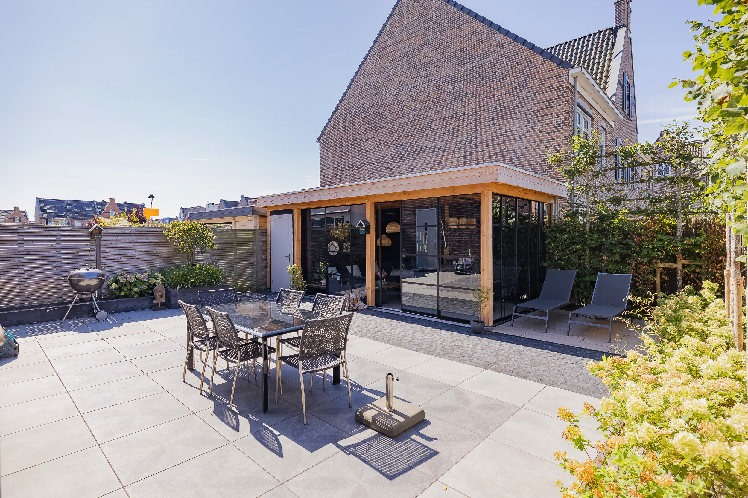 The sunny garden (SW) with veranda completes the living experience. Here you can enjoy the outdoors in all seasons. The back entrance provides convenient additional access to the backyard.