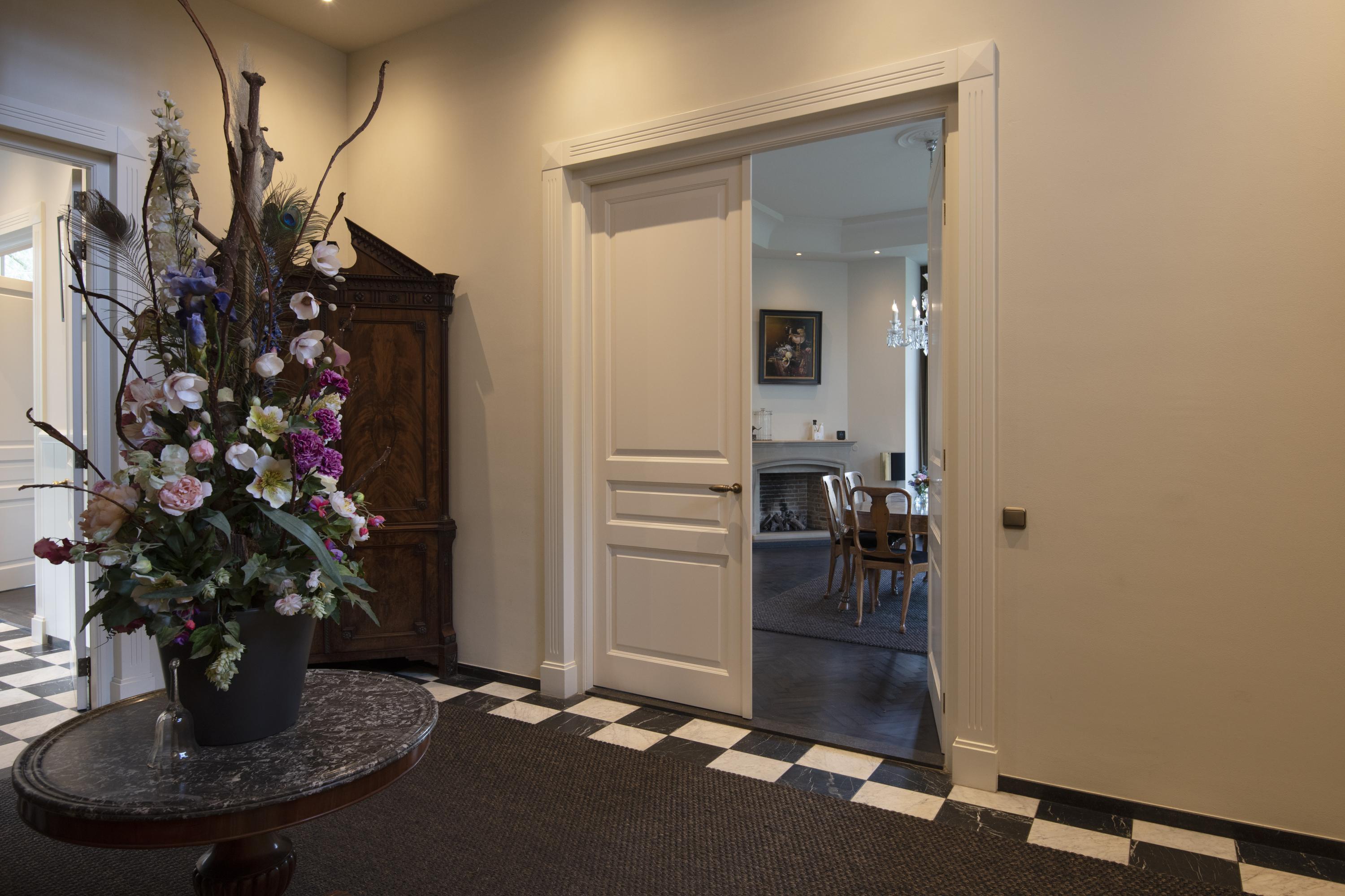 The imposing staircase leads to the second floor. The eye-catcher on this floor is the suite; a nature-oriented bedroom of 45 m2 with high stucco ceiling, three pairs of double doors to the French balconies, an adjoining dressing room and private bathroom. From this suite is also access to the tower where there is space for a shoe collection if desired. On this floor are two more bedrooms, also with French balconies. Between these bedrooms is the 2nd bathroom with double sink vanity, walk-in shower and toilet. On the landing is another separate 2nd toilet. The floor in the suite is covered with luxury carpet and the floors of the other two bedrooms are covered with parquet. This floor is also fully equipped with underfloor heating.