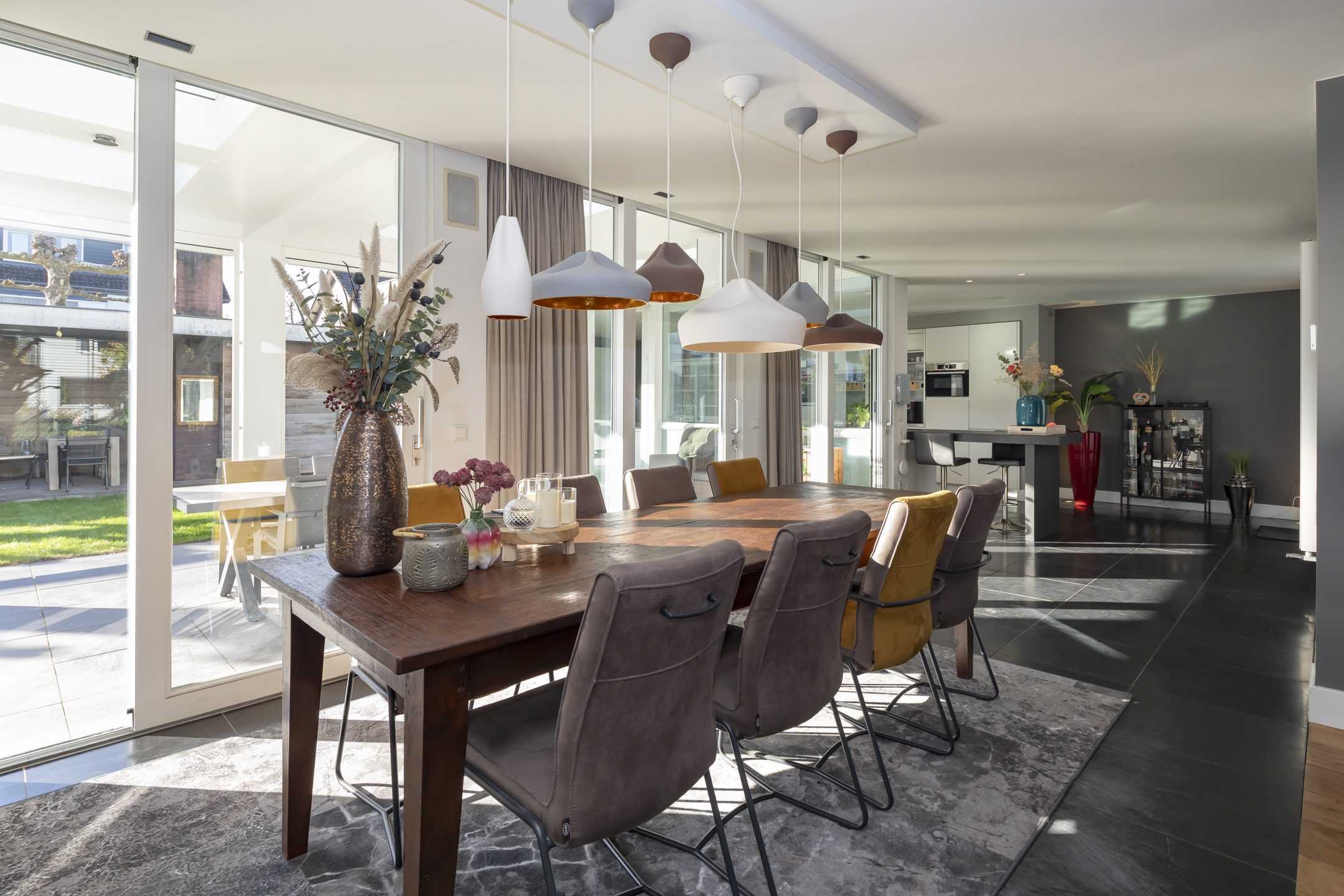 Right next to the kitchen, where a high dining table currently stands, is a lovely space for relaxing. Completely enclosed by a glass wall, it boasts optimal light and a view of the garden.